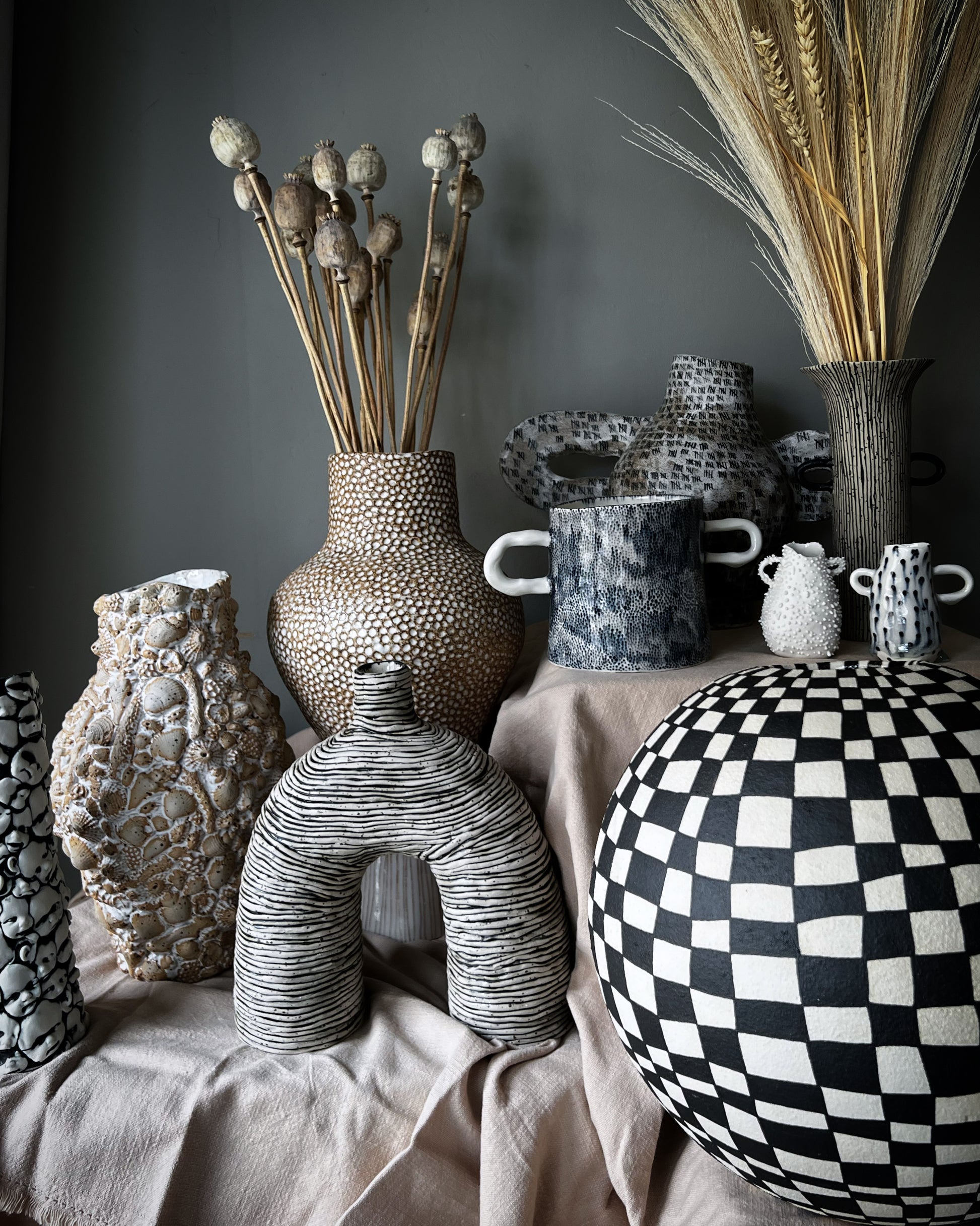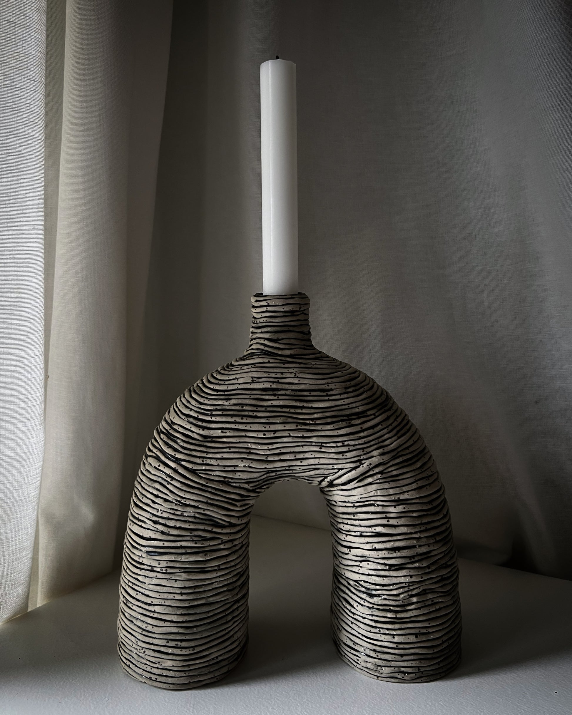 Vas/ljusstake i stengods, ca 24 cm hög. Glaserad insida.