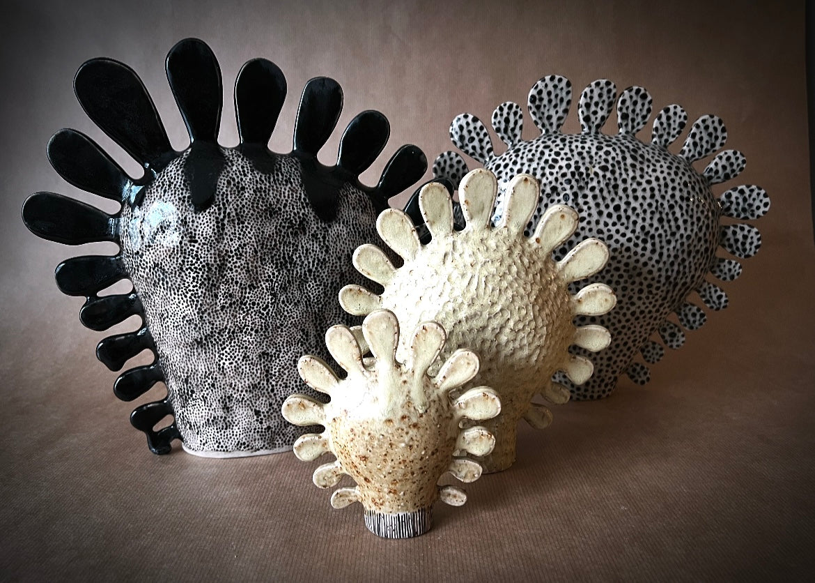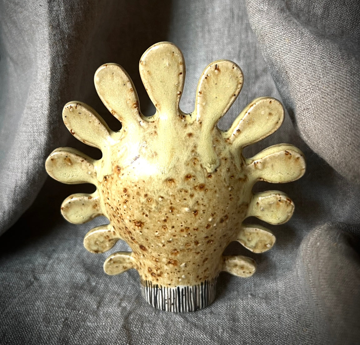 Skulptur i stengods handmålad dekor & gulbeige glasyr