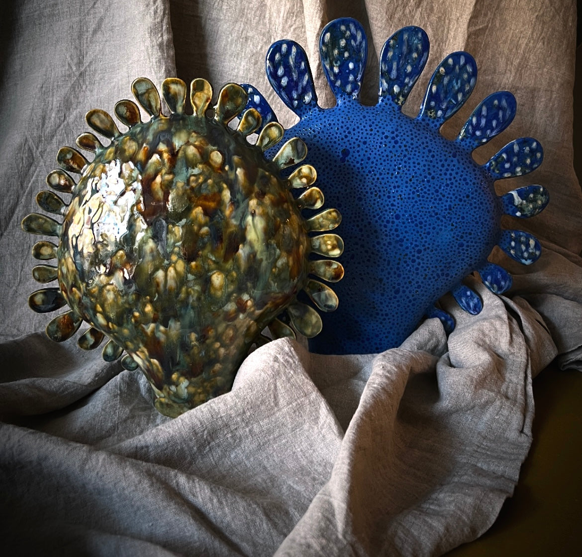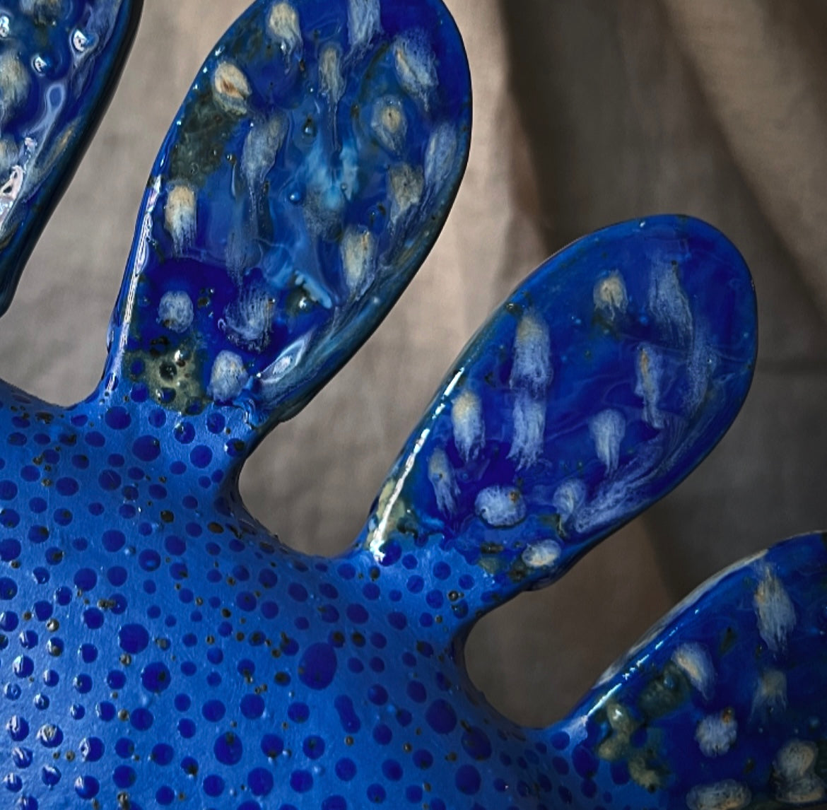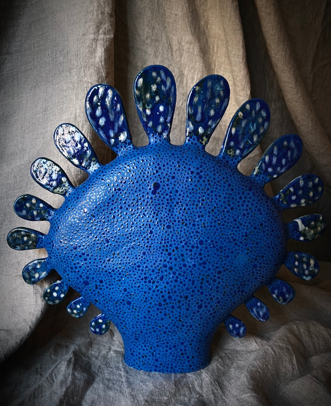 Skulptur i stengods i intensiv blå med små blanka prickar & blas som skiftar lätt i grönt & vitprickigt.