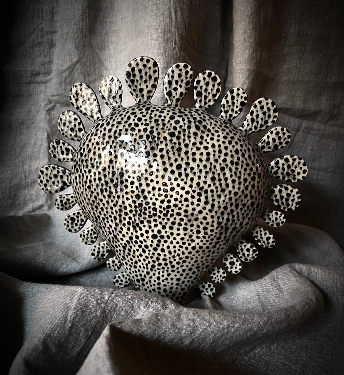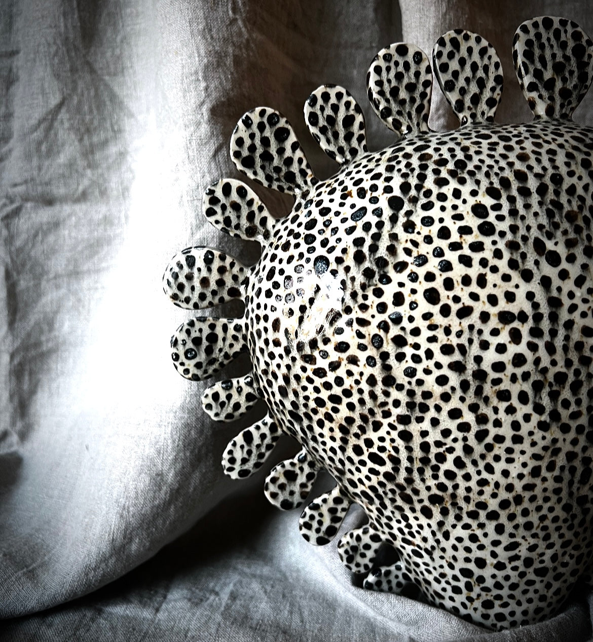 Skulptur i stengods med handmålad dekor & blank glasyr