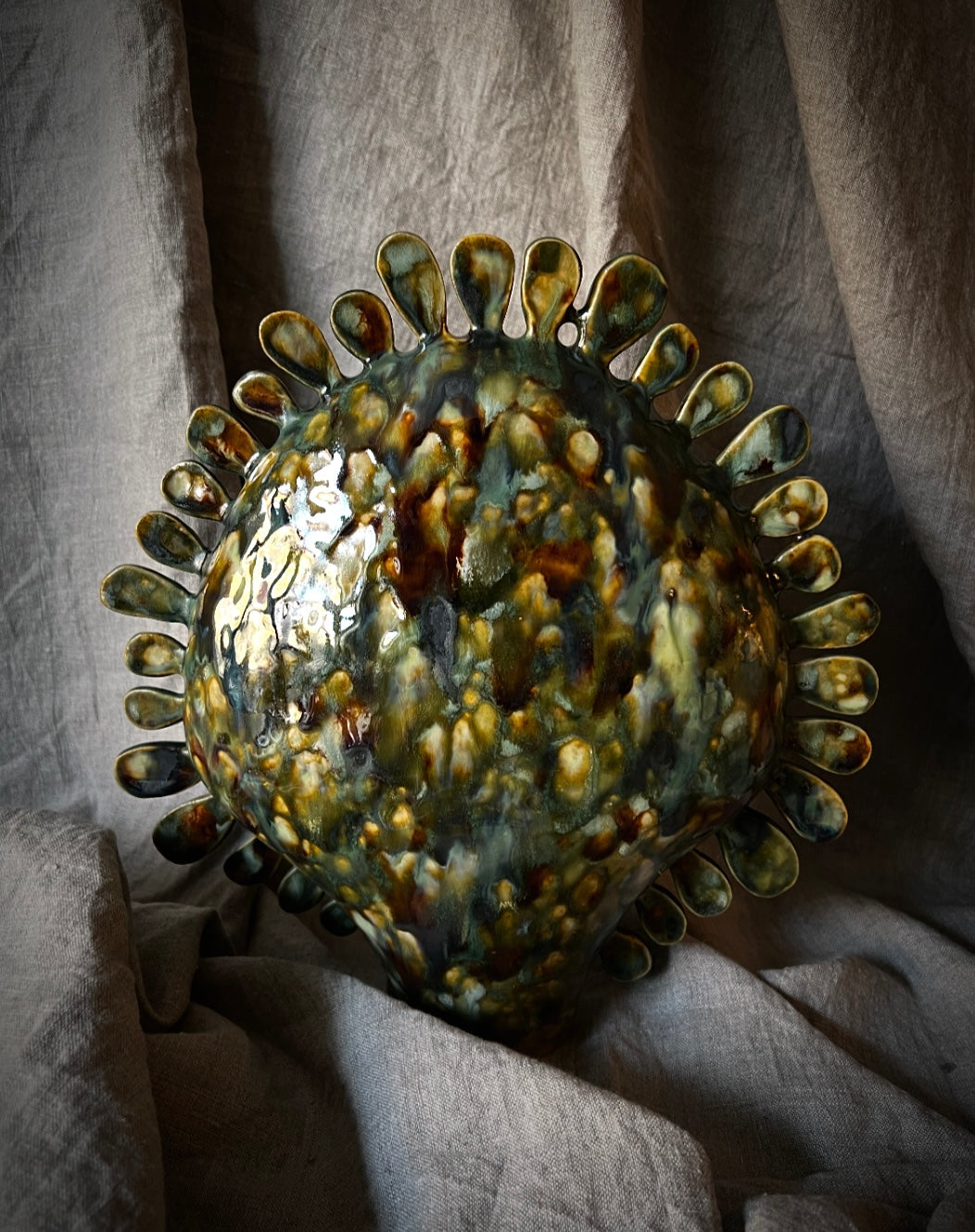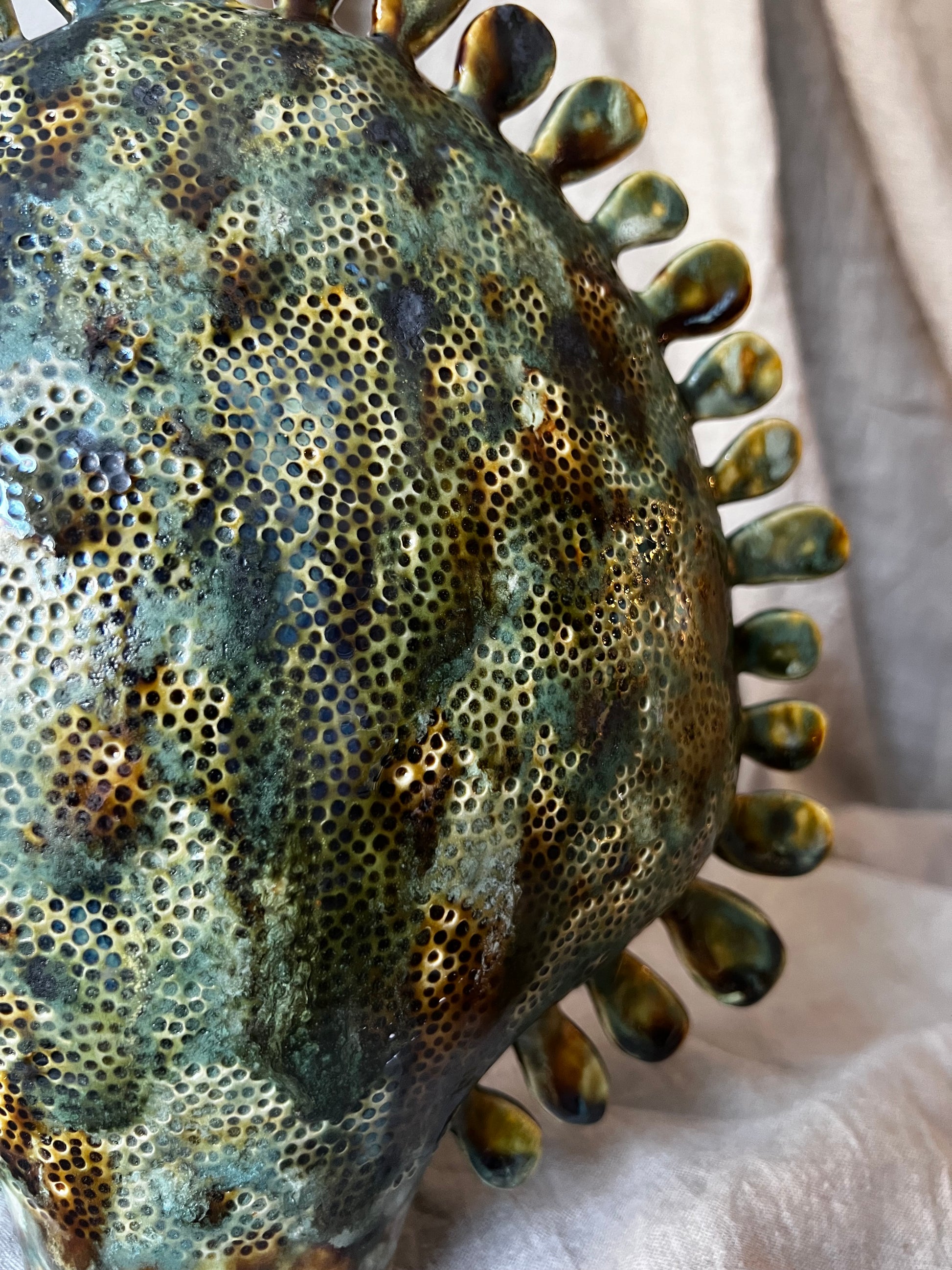 Skulptur i stengods med en kropp skiftande i gröna & bruna toner. Ena sidan slät, andra med struktur av små hål.