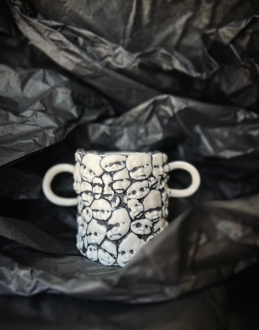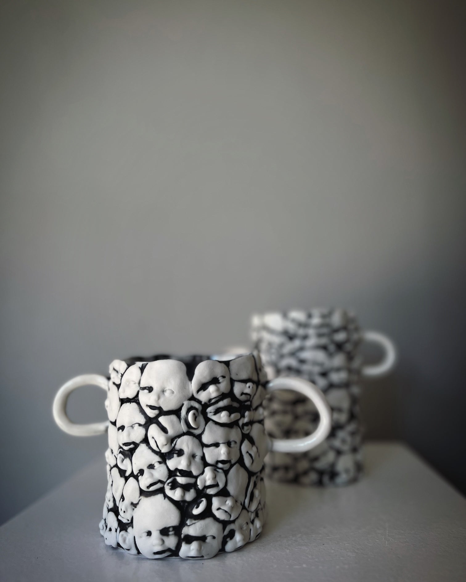 Handbyggd i porslinslera med relief av små ansikten. Glaserad insida.