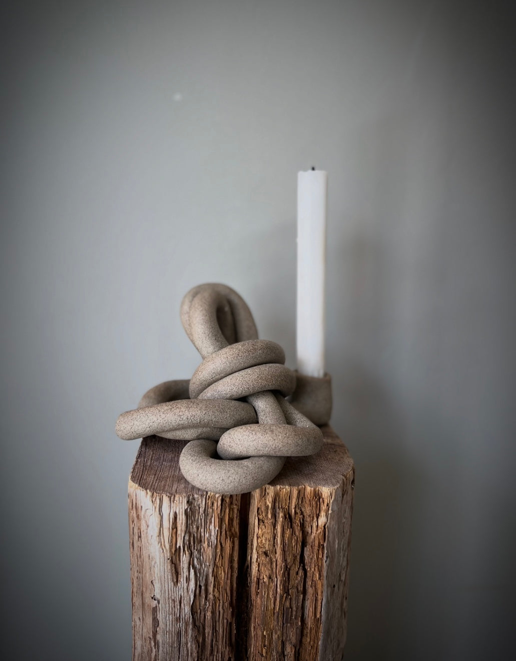 Knut i gråbrun stengodslera, sandig fin yta. Upplevs i vissa ljus som mer grå & i andra som brun.