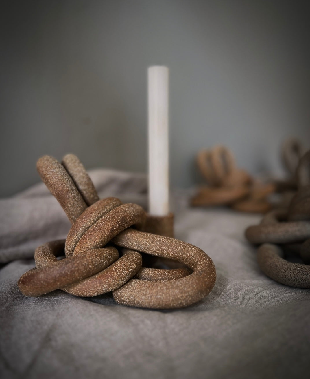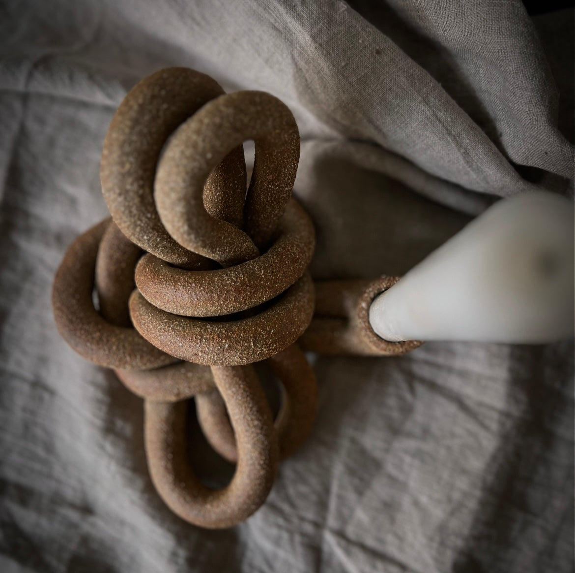 Knut i grov ljusbeige stengodslera med sandig struktur, oglaserad.
