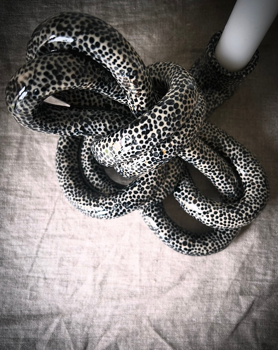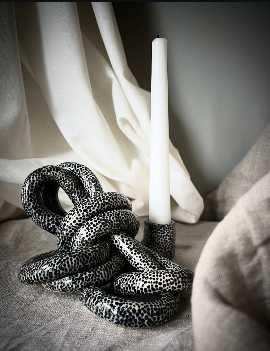Knut i ljus Stengodslera, Handmålad prickig dekor & blank glasyr.