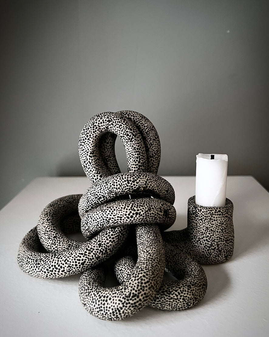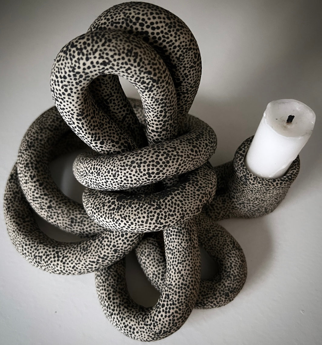 Knut i ljus stengodslera med små handmålade prickar. Oglaserad.