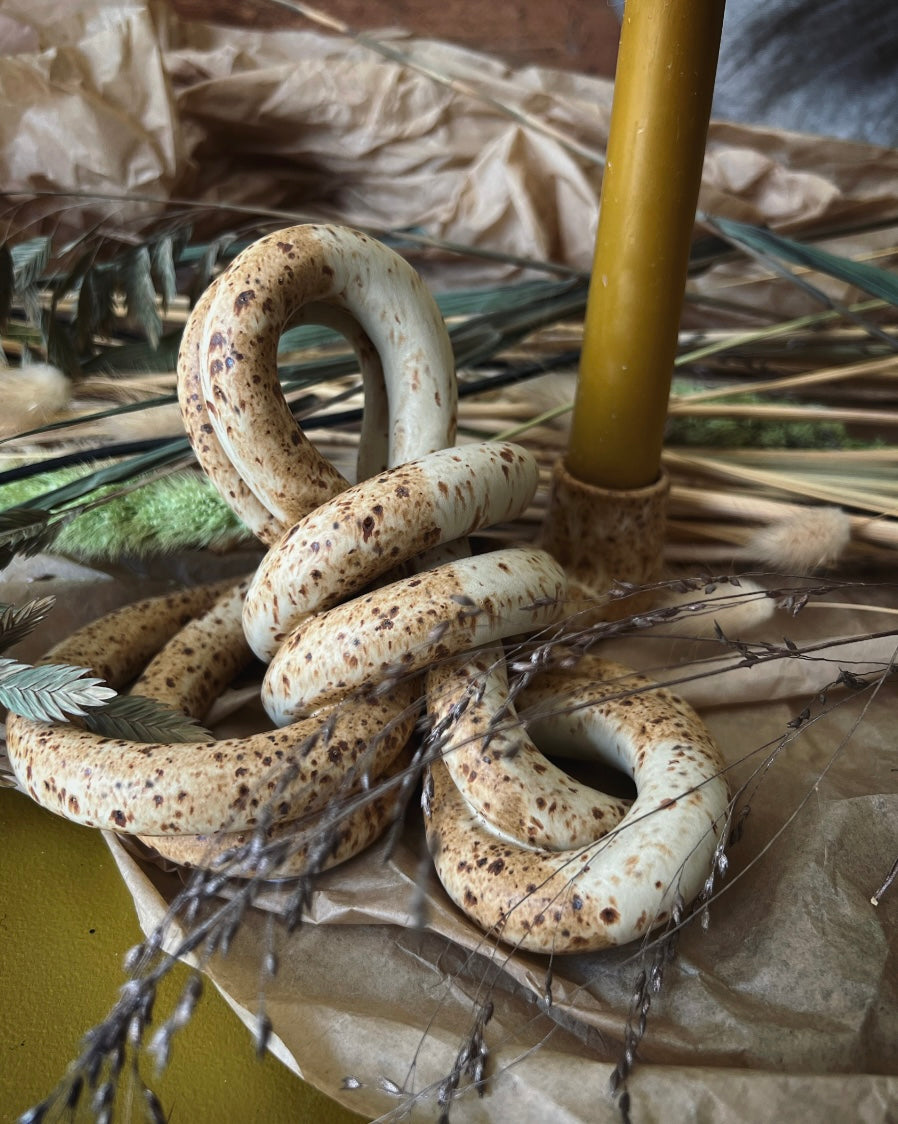 Knut i en ljus spräcklig stengodslera med gulbeige sidenmatt glasyr.