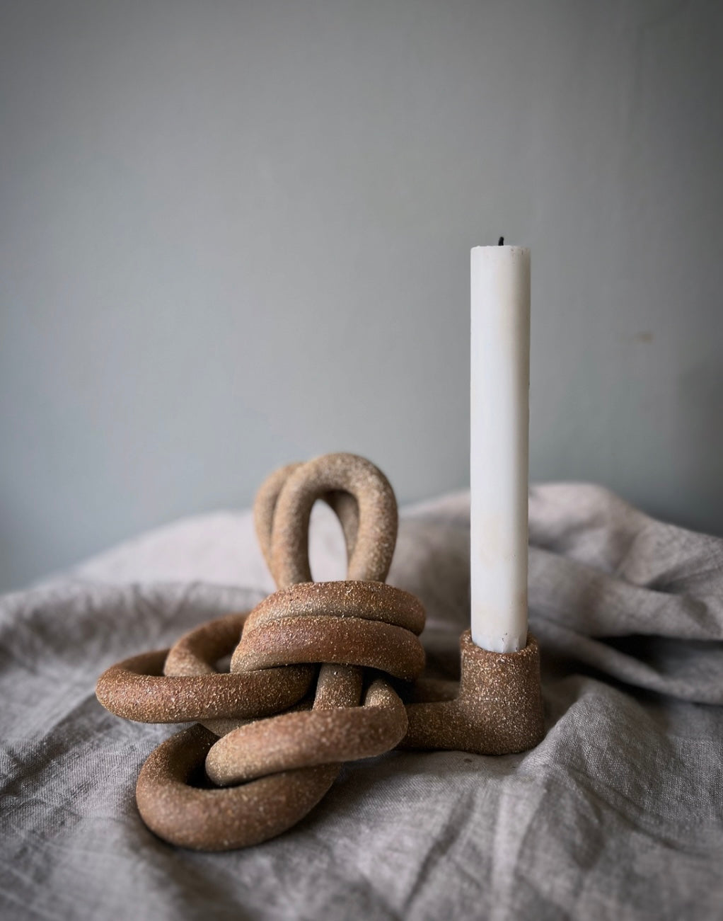 Knut i grov ljus stengodslera med sandig struktur, oglaserad.