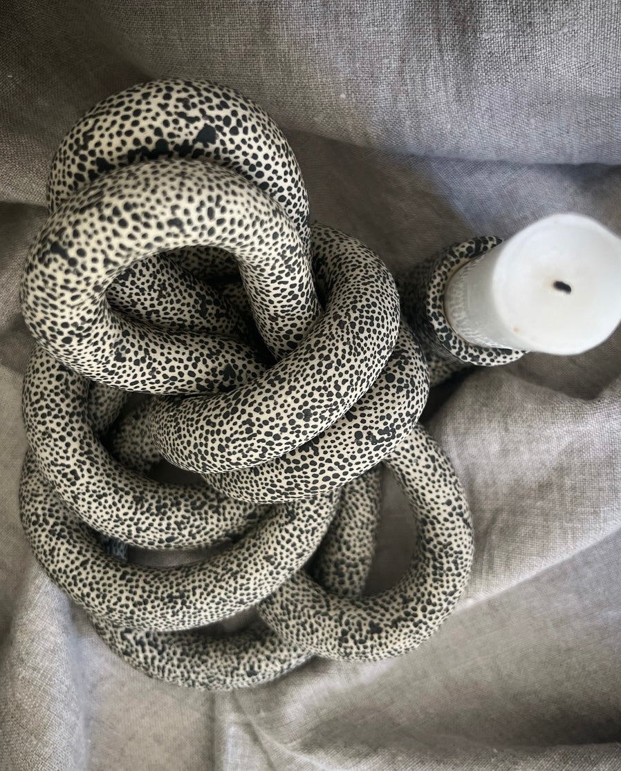 Knut i gul ljus stengodslera med små lavaprickar, handmålade stora prickar