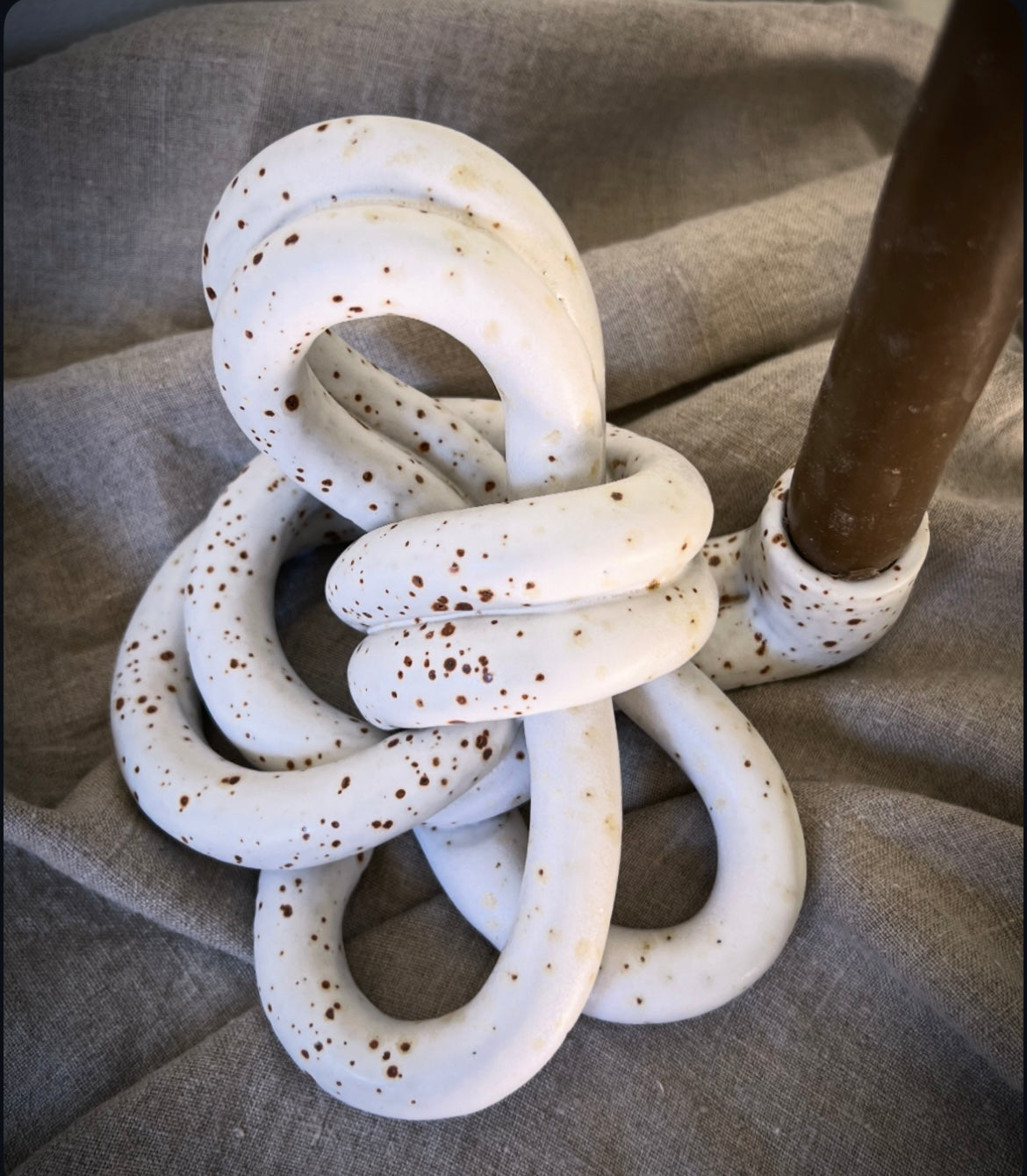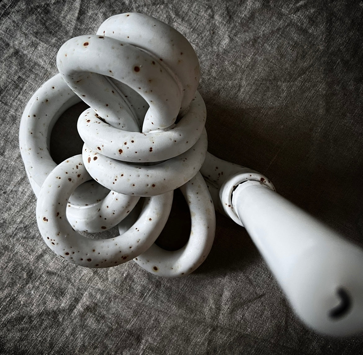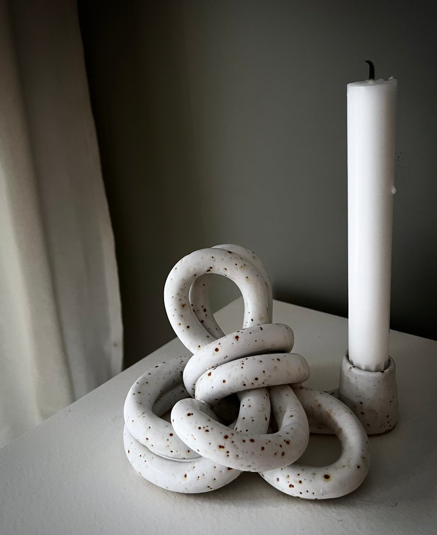 Knut i ljus fläckig stengodslera med vit matt glasyr.