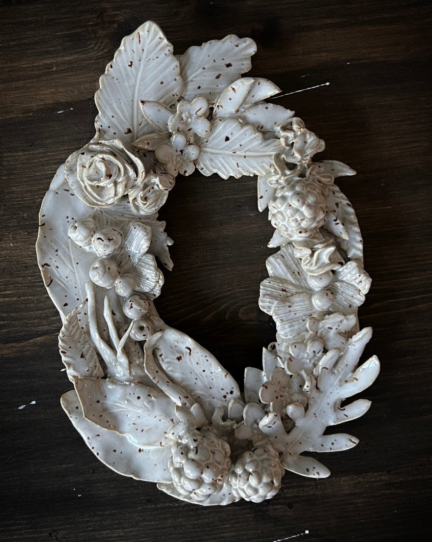 Krans i stengodslera med många fina detaljer. Glaserad blank vit.