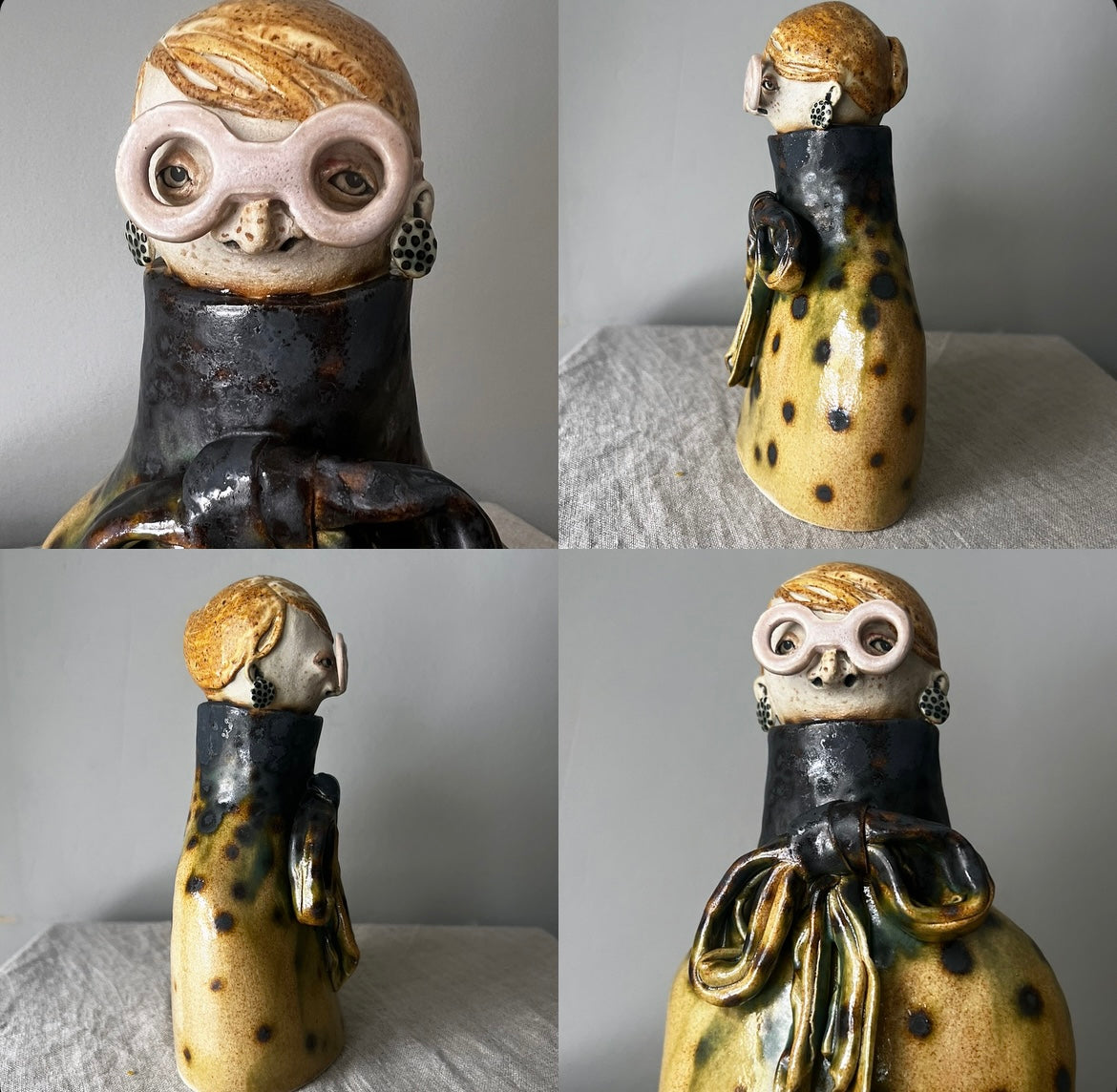 Agnes har kraftiga puderrosa bågar i rund modell, örängen & en blus som skiftar från mörk i halsen till beige med inslag av grönt nertill. Orangebrunt hår i svinrygg.