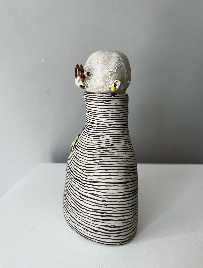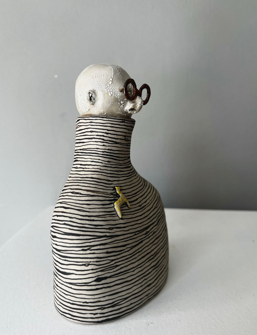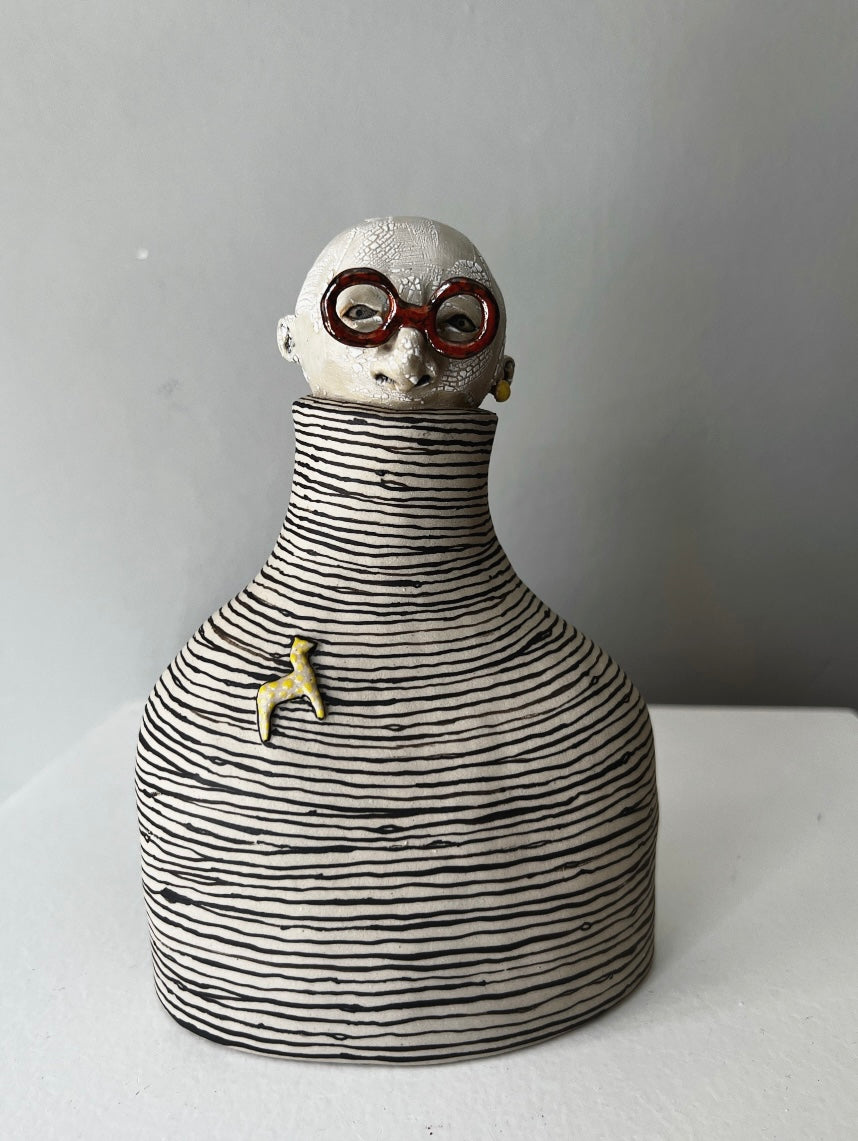 Richard har melerade, mörkröda stora, runda glasögon , en polotröja med tunna handmålade linjer samt en brosch i form av en lama & ett guldörhänge i ena örat