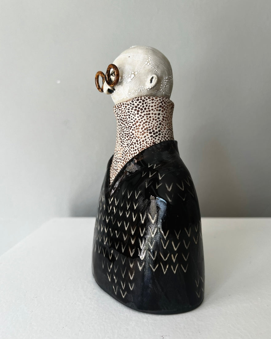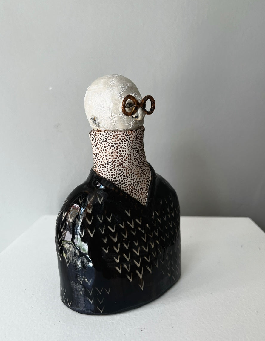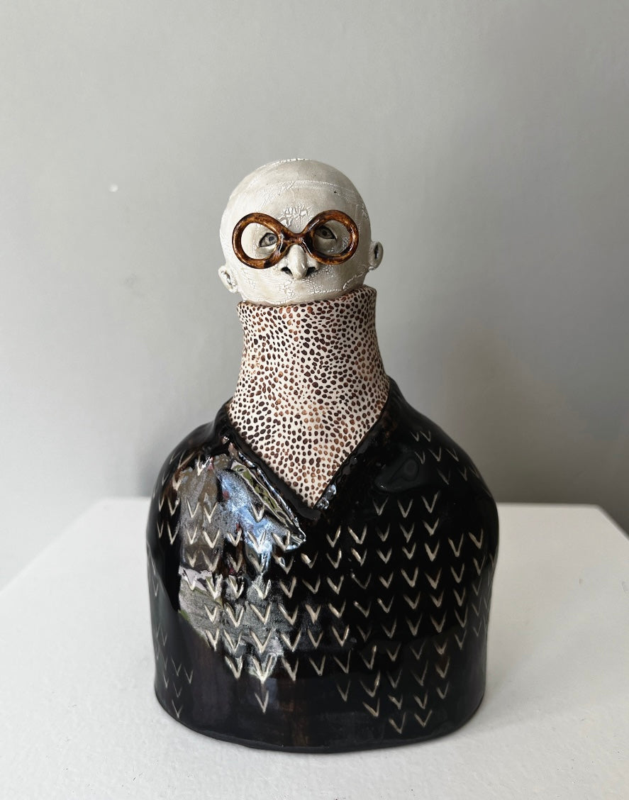 Rune har bruna blanka, melerade runda glasögon, en glansig svart pullover på en polotröja med små bruna prickar