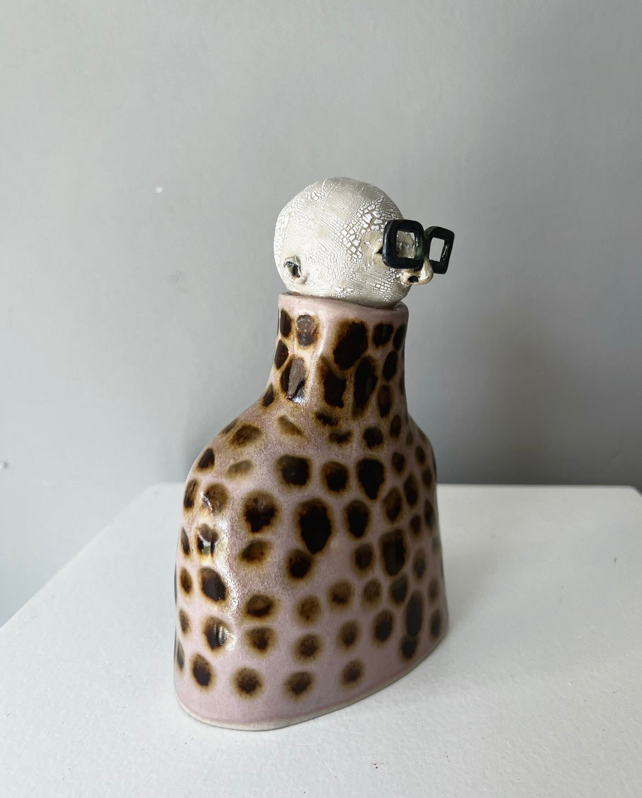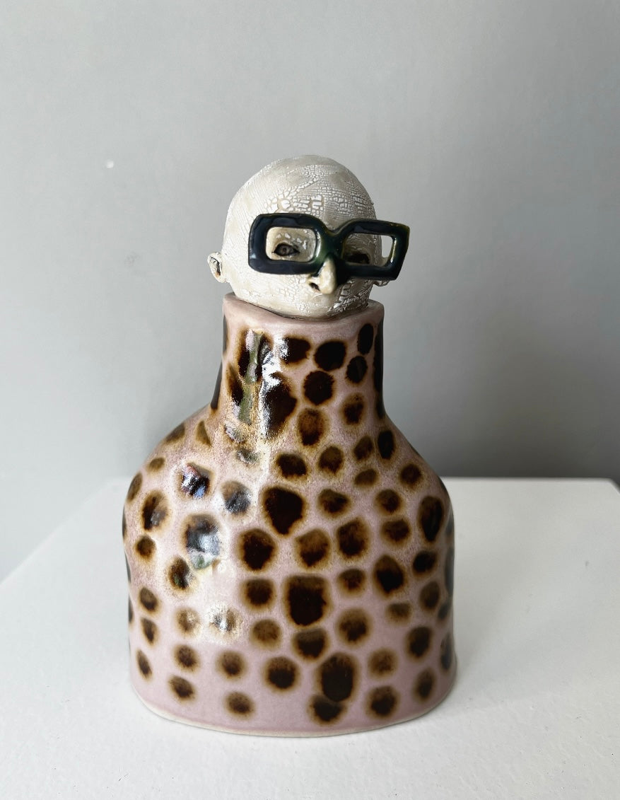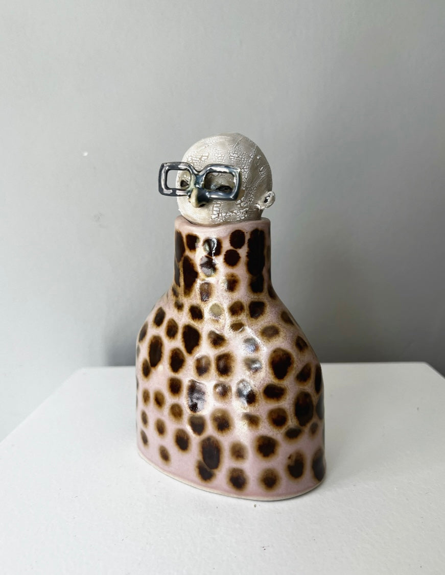 Bartolomeus är iklädd stora kantiga, metallic-gröna bågar & en polo med ljusrosa botten & bruna fläckar.