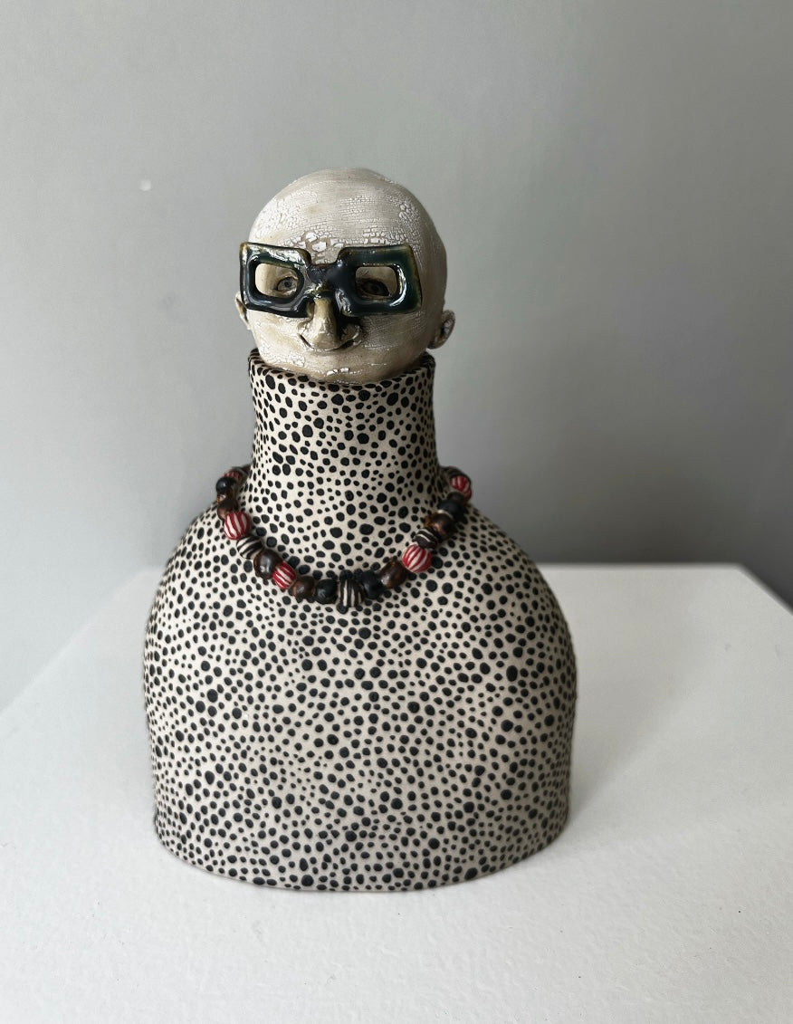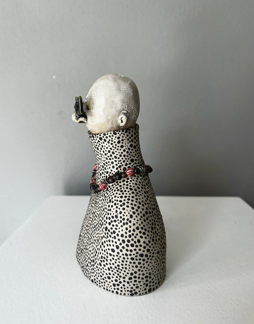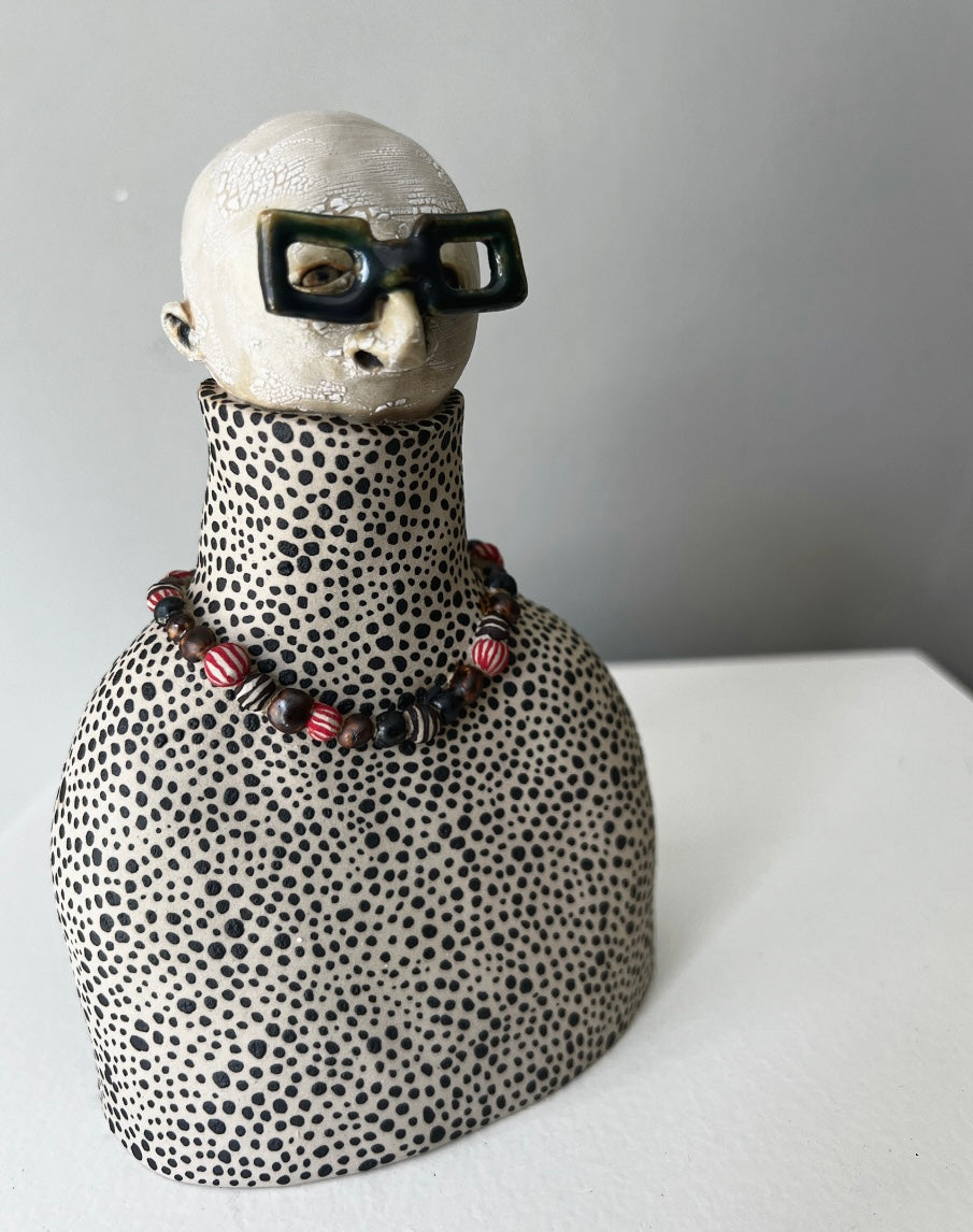 Viven har kantiga stora bågar i buteljgrönt, till det en småprickig svartvit polotröja smyckad med ett halsband med pärlor i röda & bruna toner.