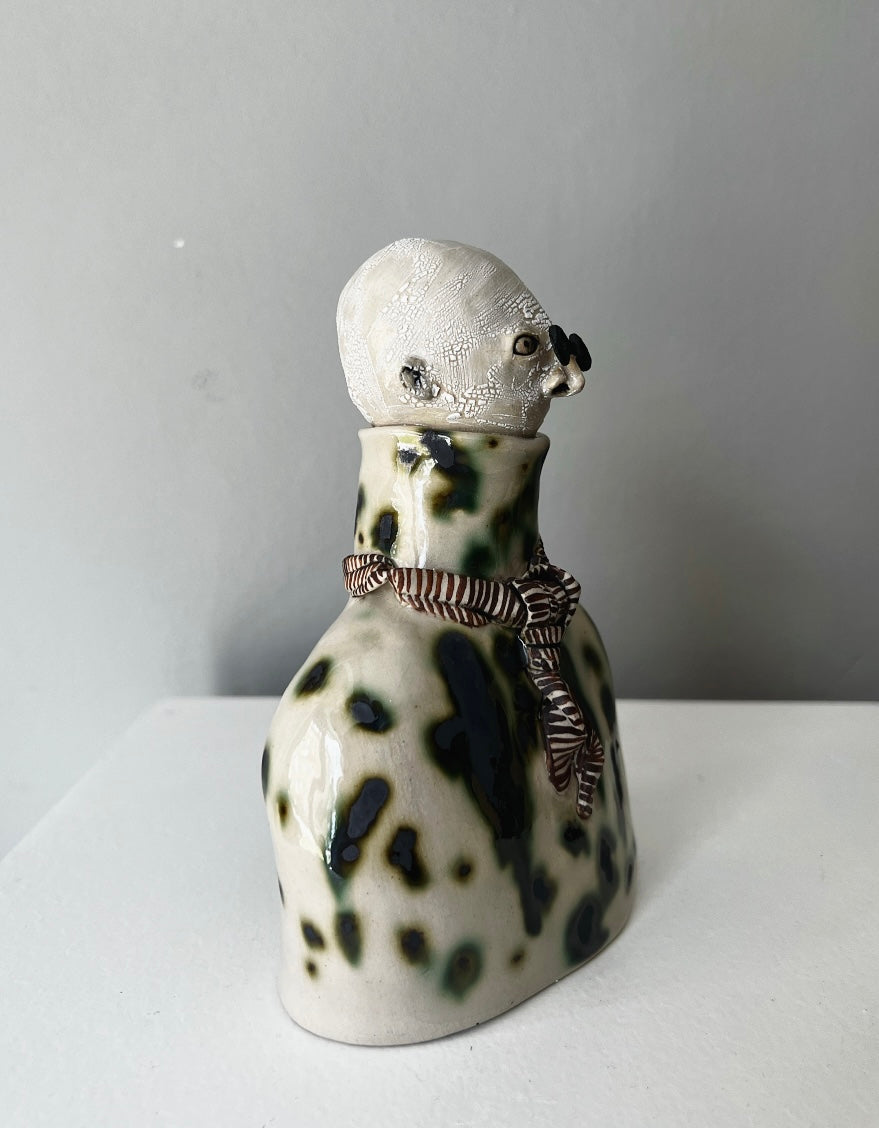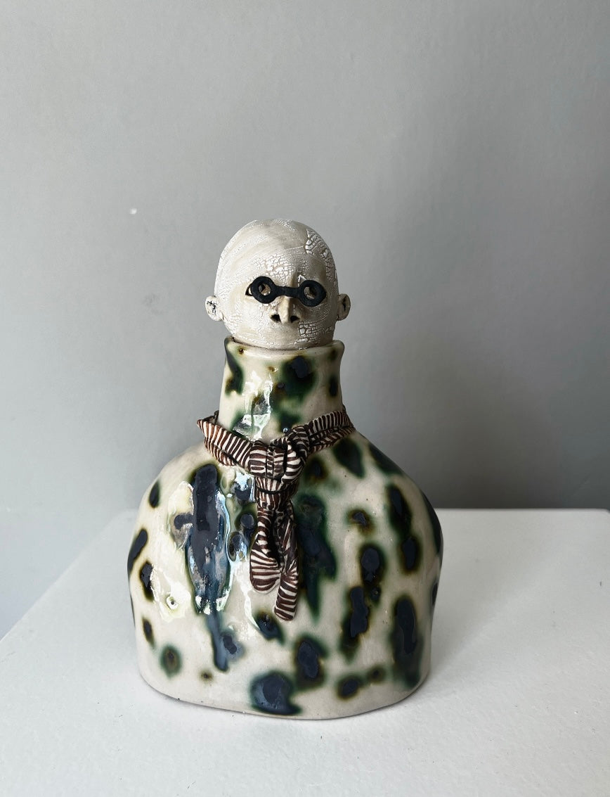 Steven har små matta runda bågar, en brunrandig scarf över blank polo med organiskt mönster i grönmetallic.