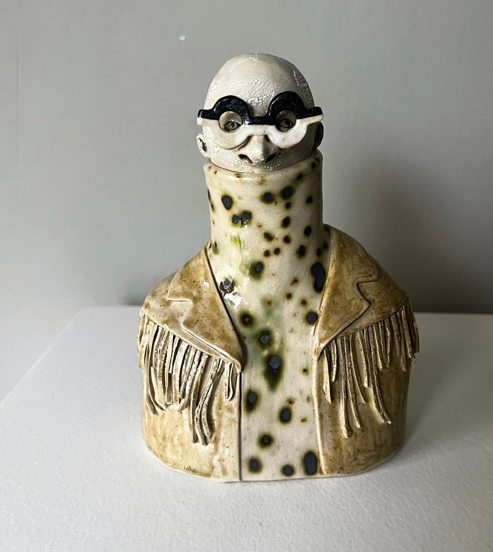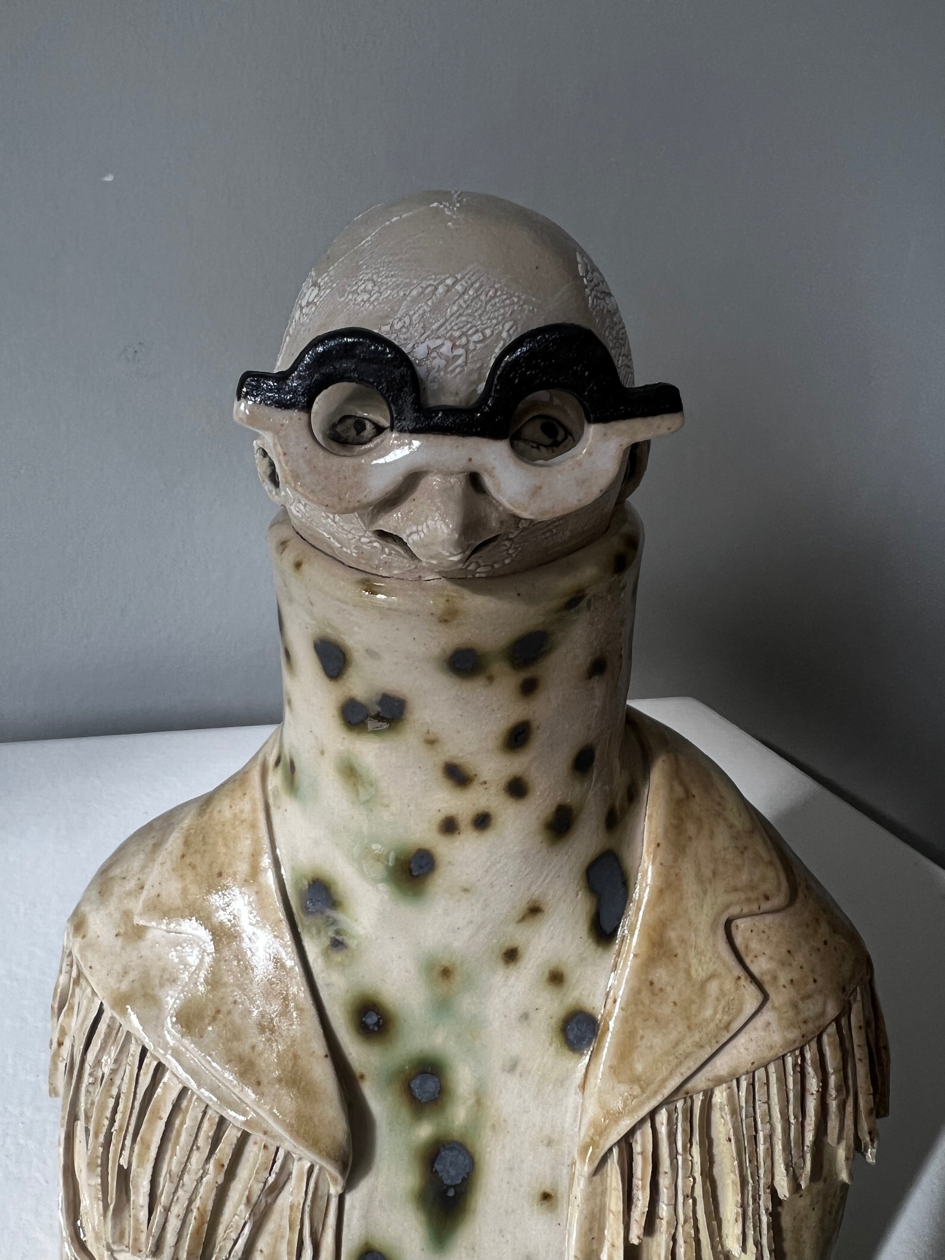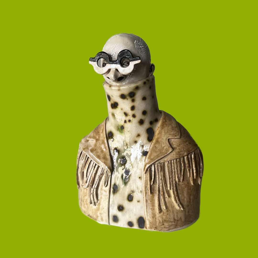 Alf har tjocka bågar i blockmönstrat kontrasterande vitt & svart, till det en beige fransjacka & polotröja med grönmetallisk melering.
