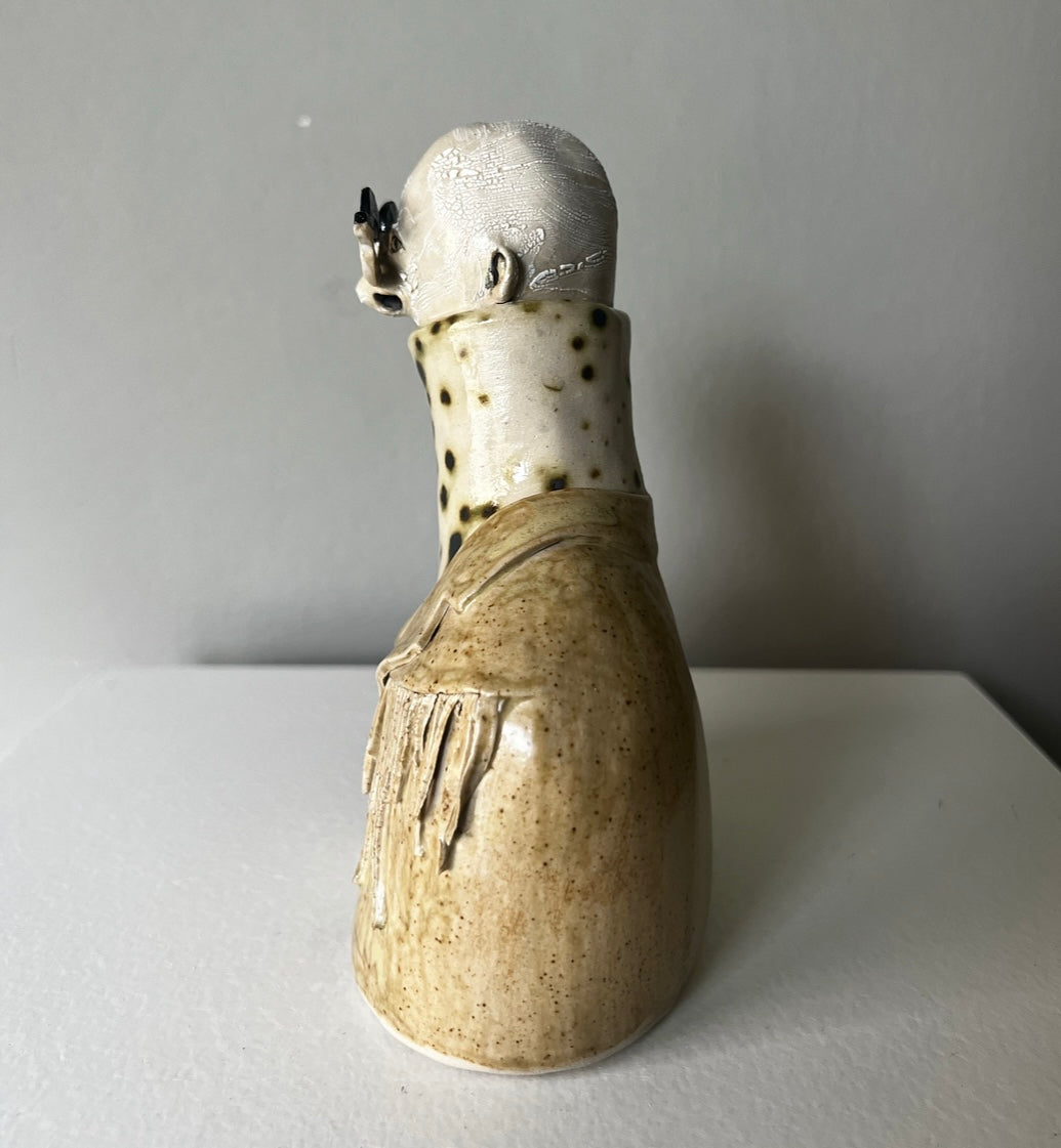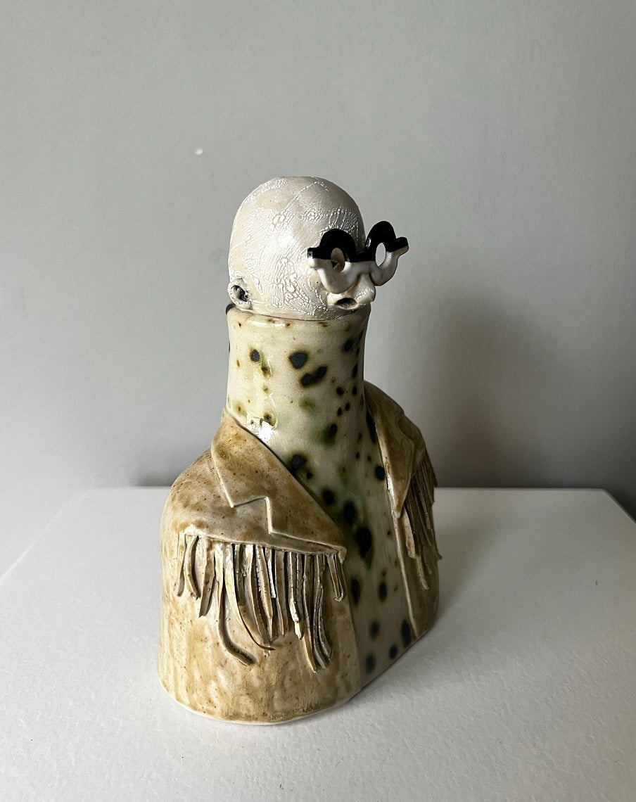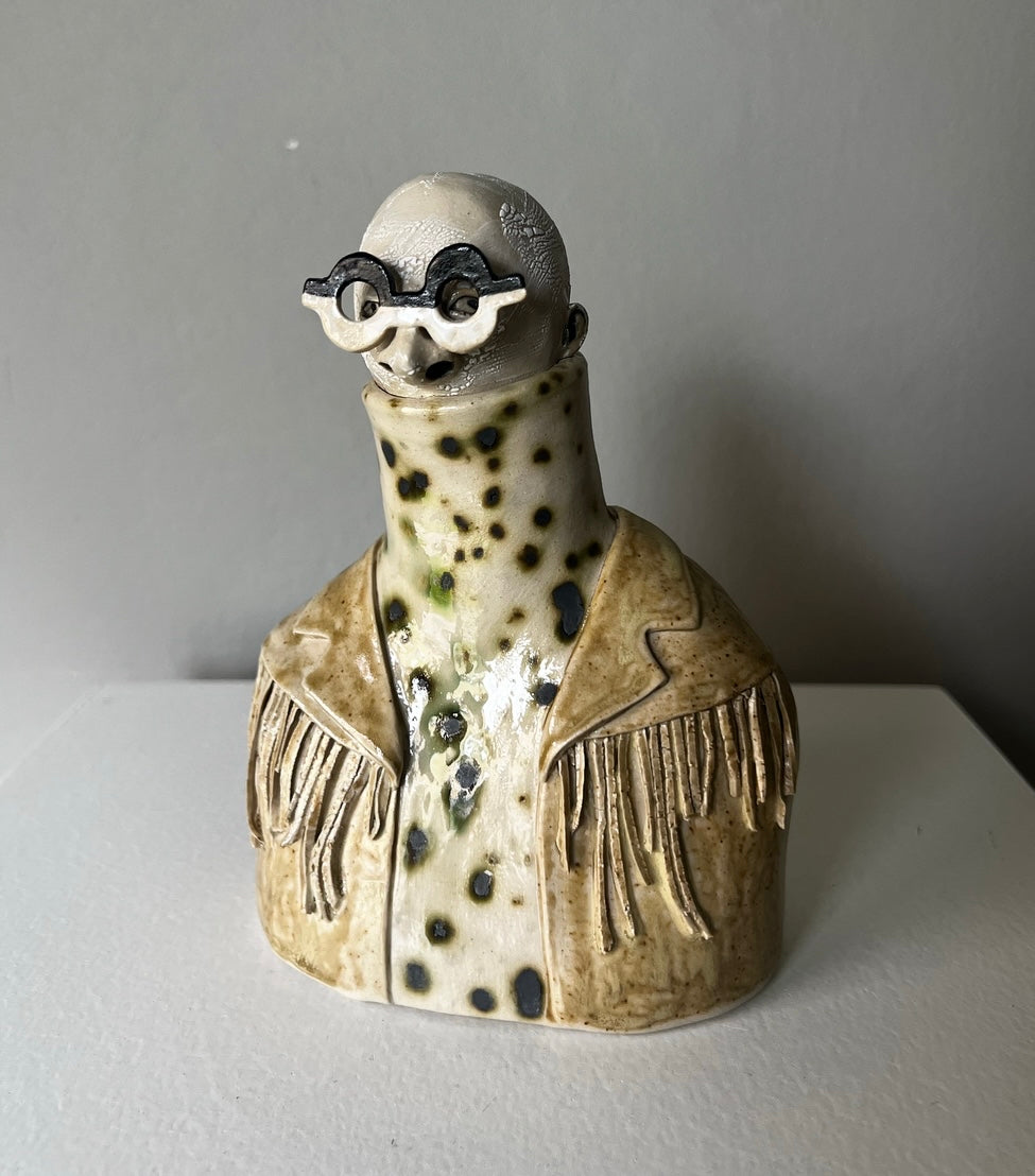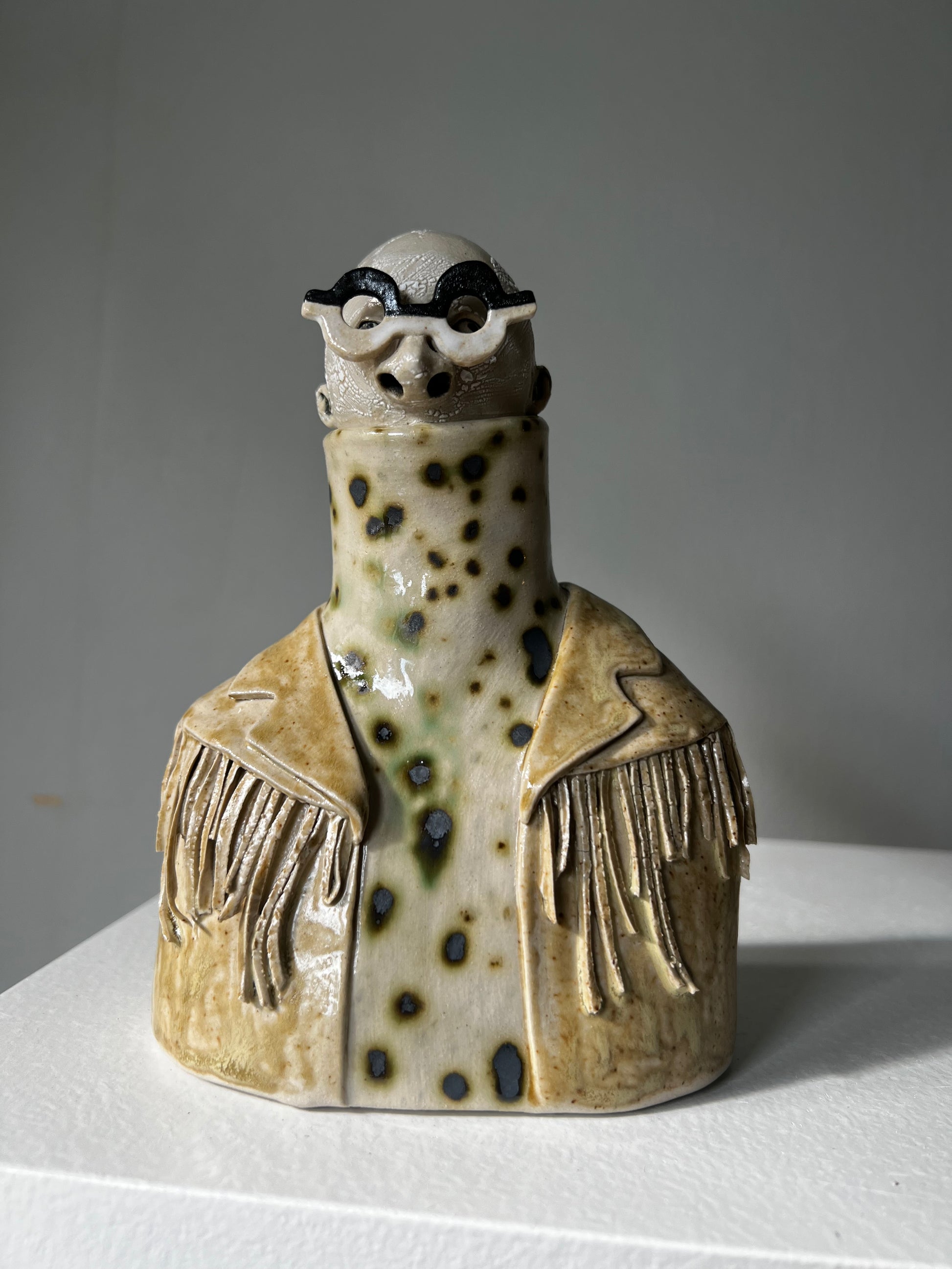 Alf har tjocka bågar i blockmönstrat kontrasterande vitt & svart, till det en beige fransjacka & polotröja med grönmetallisk melering.