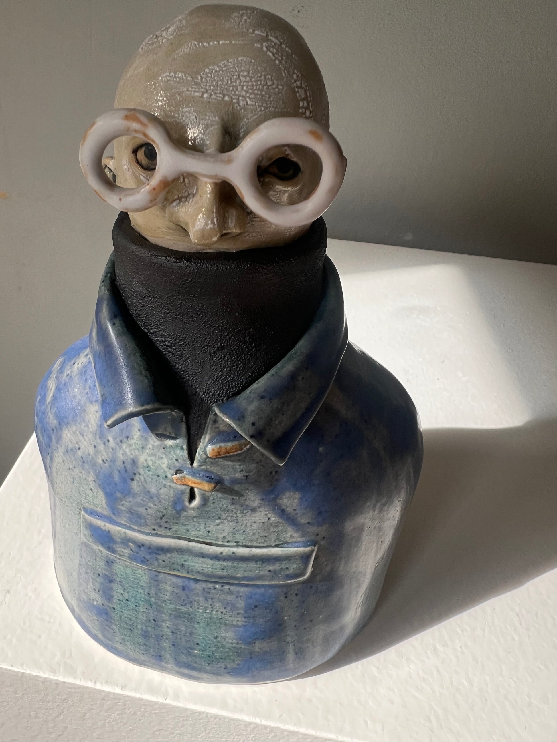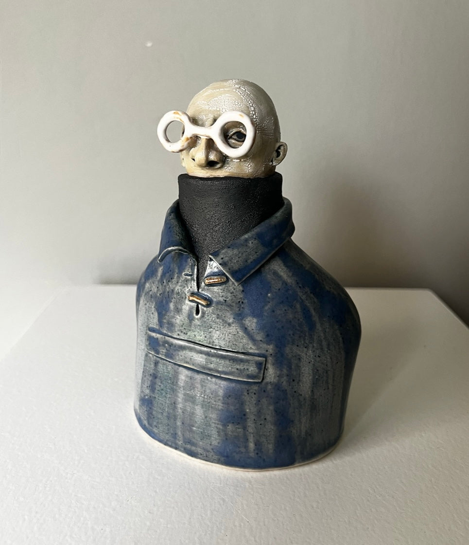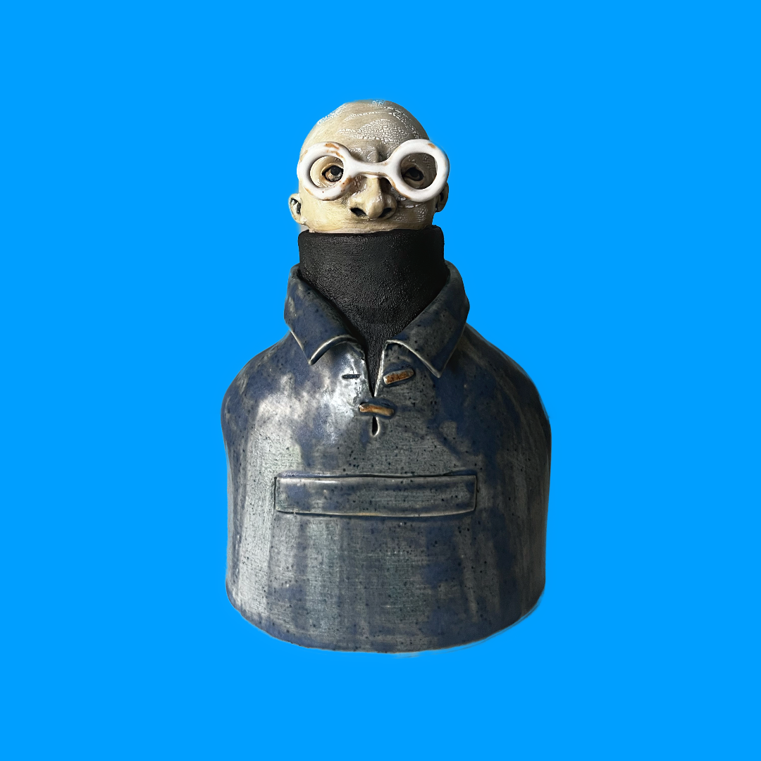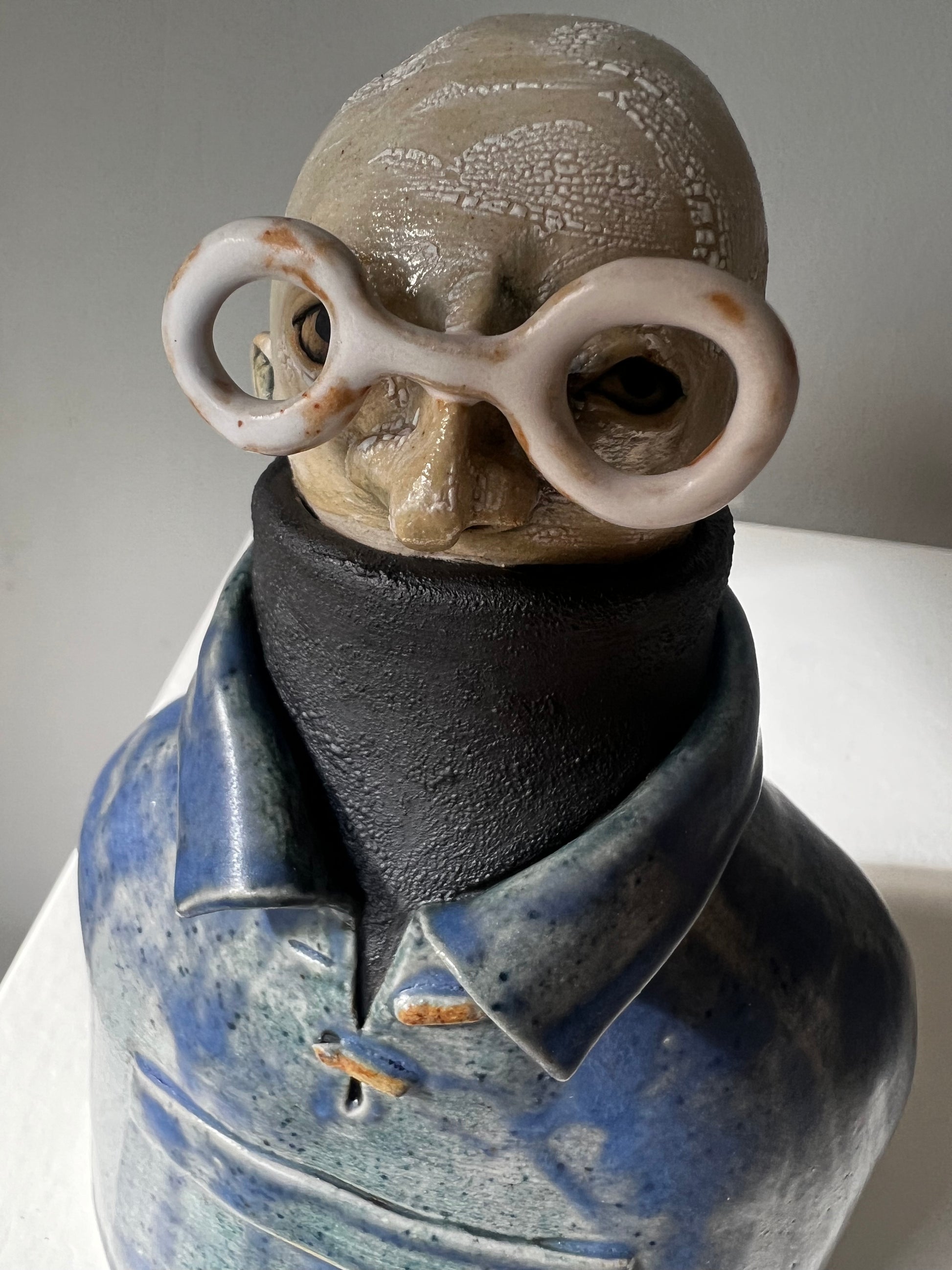 Konrad har vita runda bågar, en parkas i denim & svart polo.