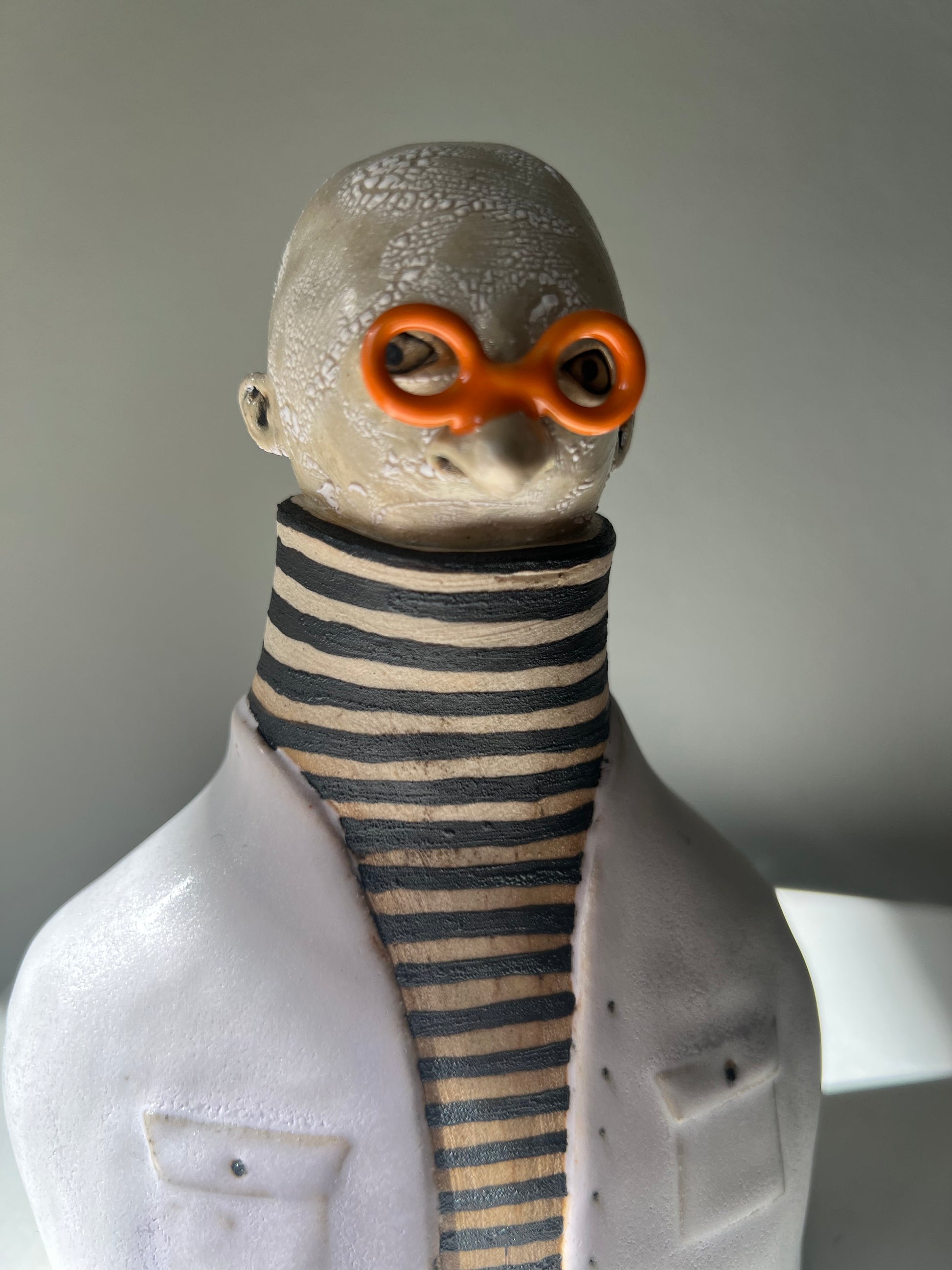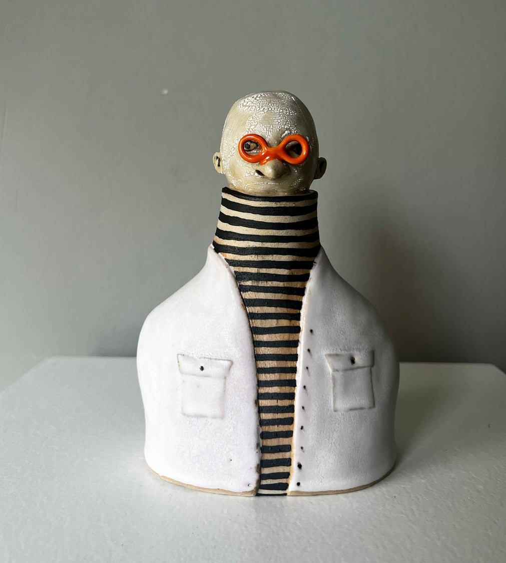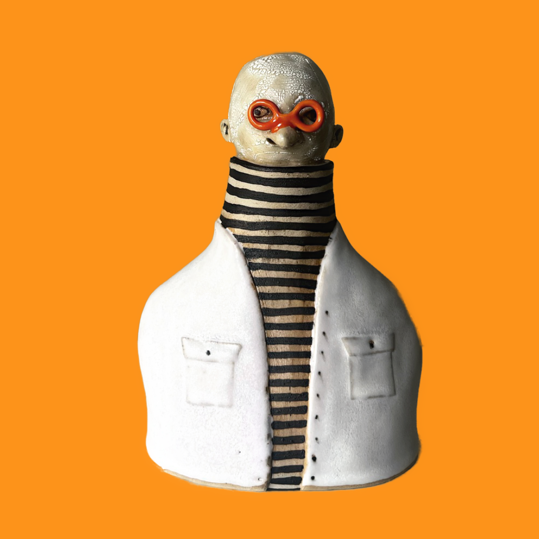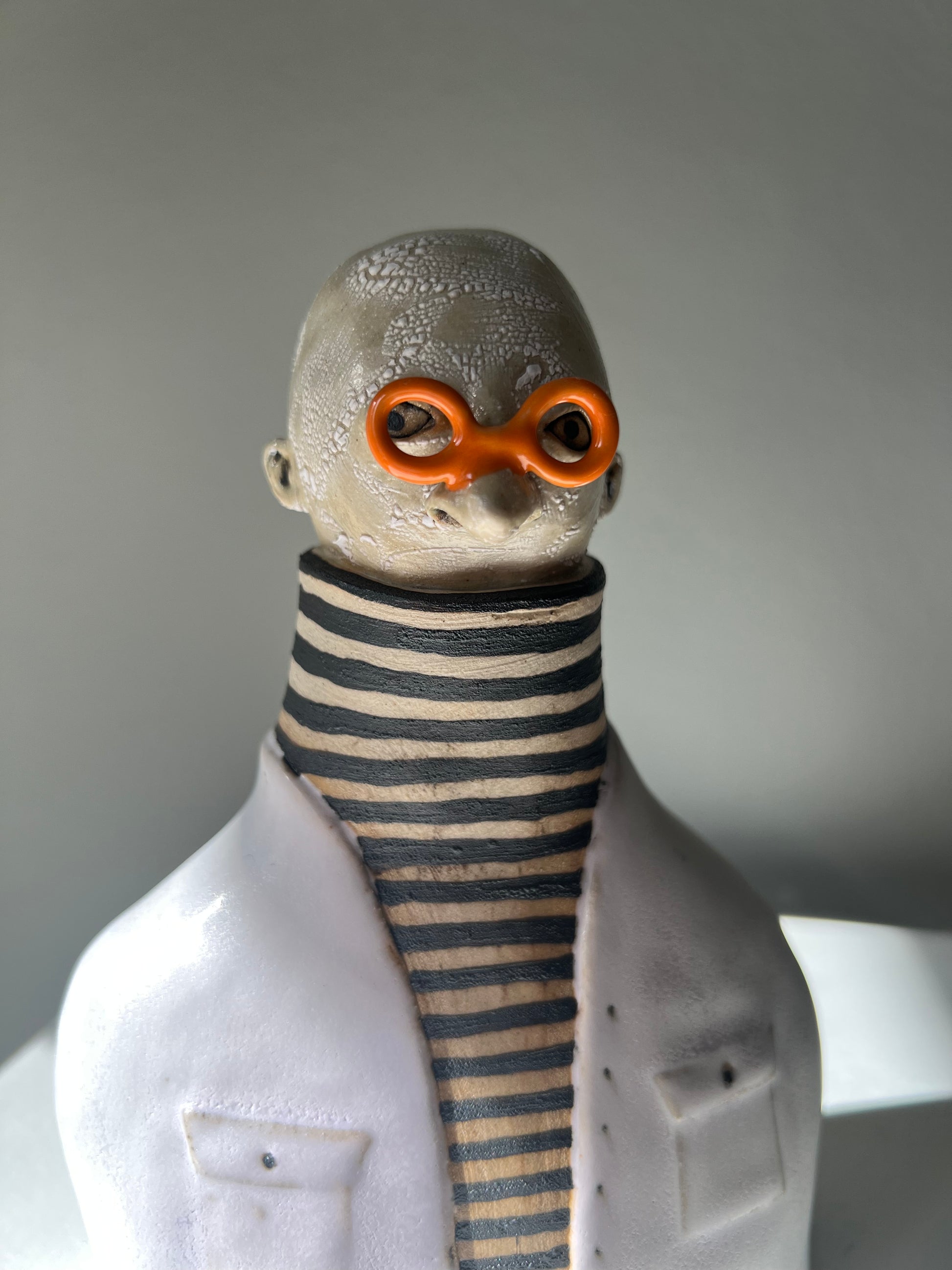 Sören har små blanka brillor i orange, en vit jacka med bröstfickor & klassisk randig polotröja.