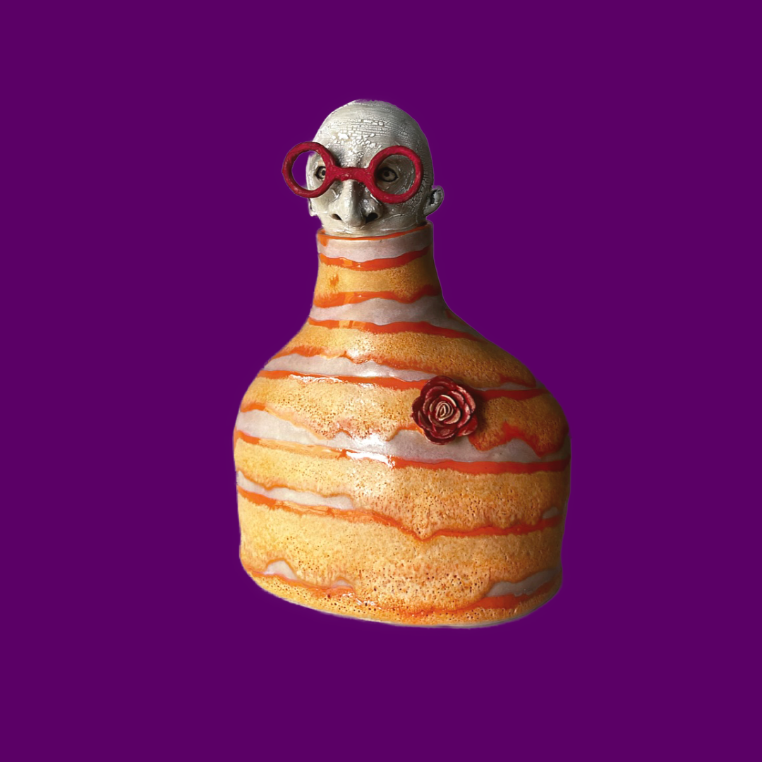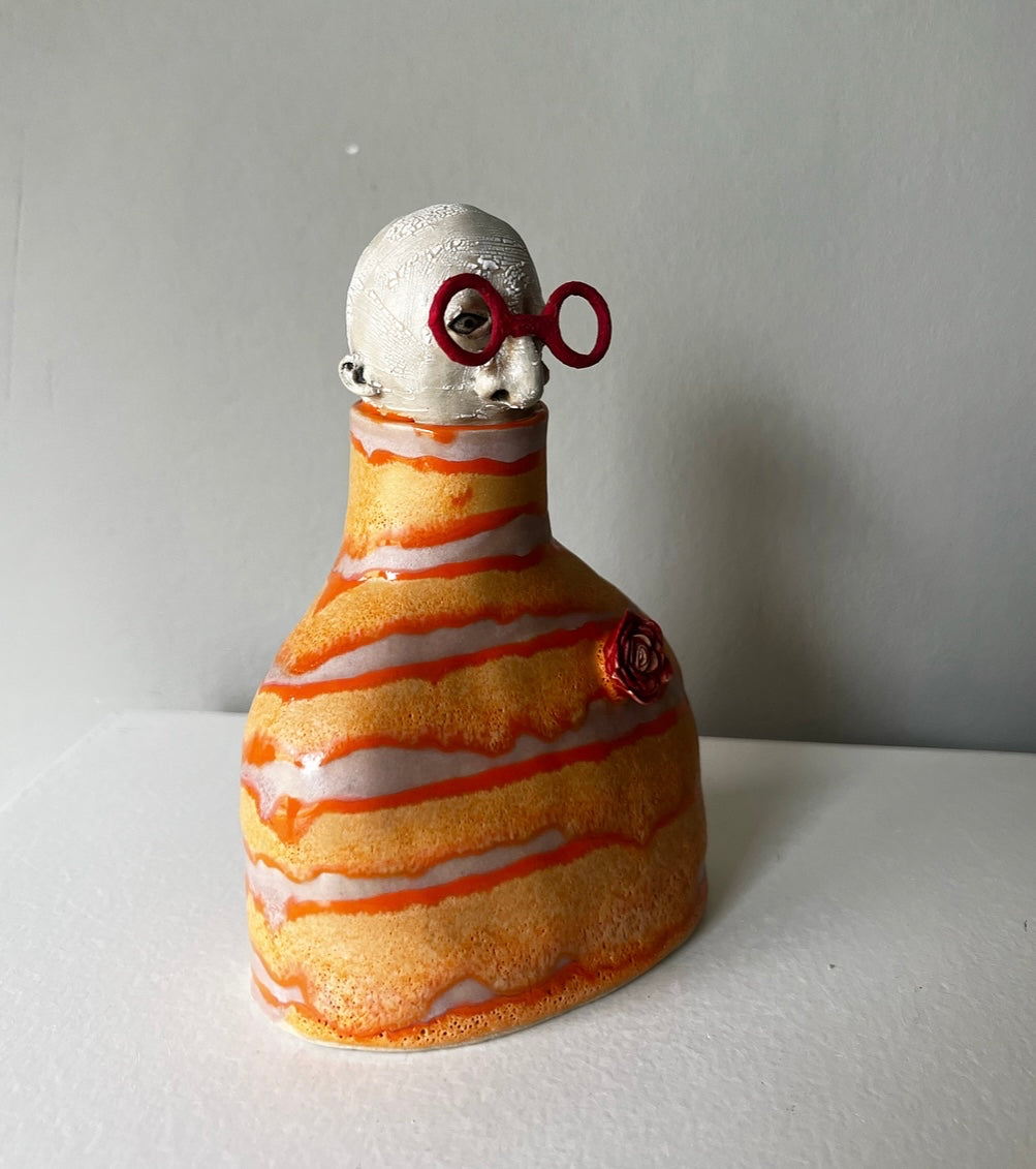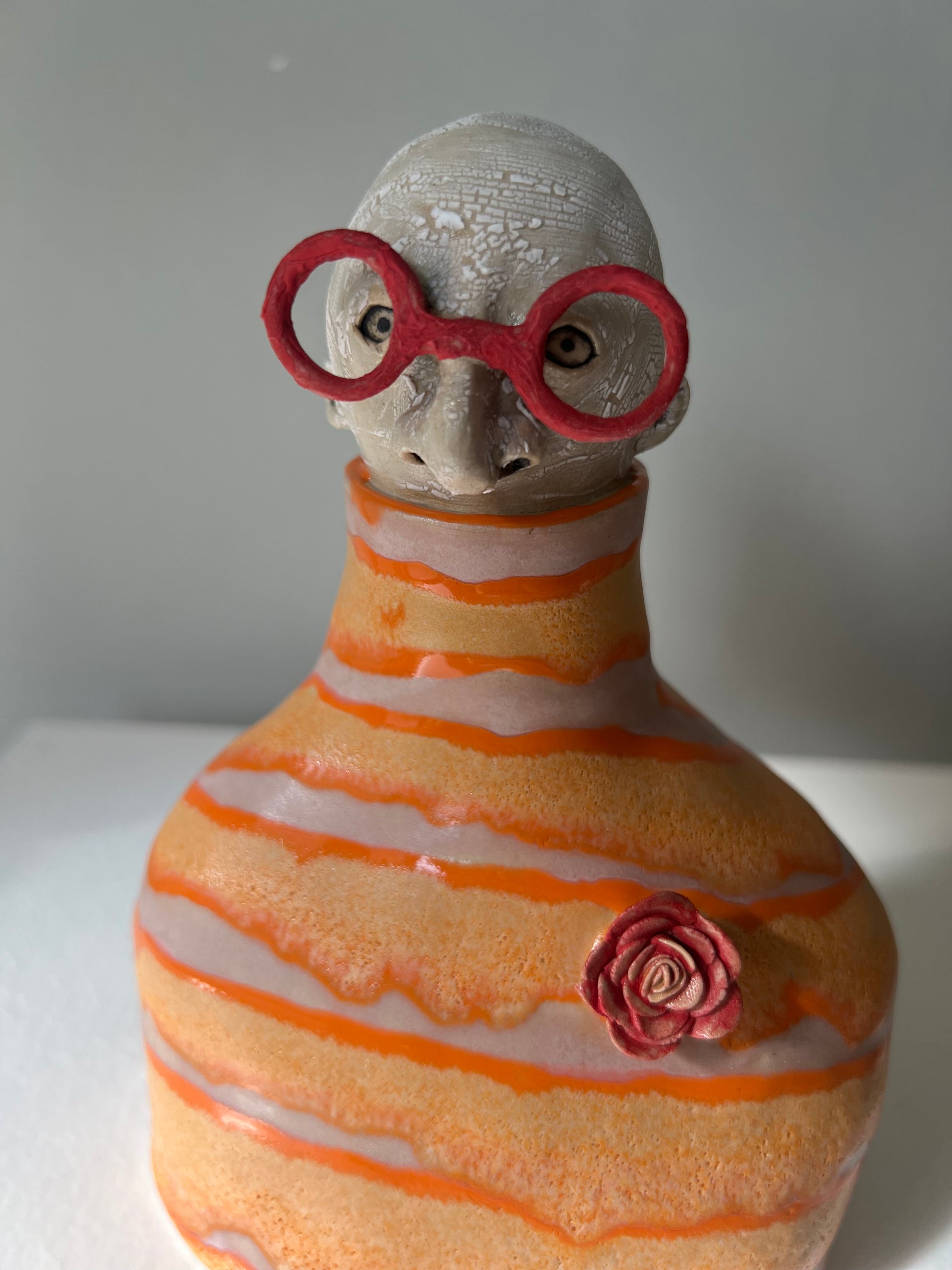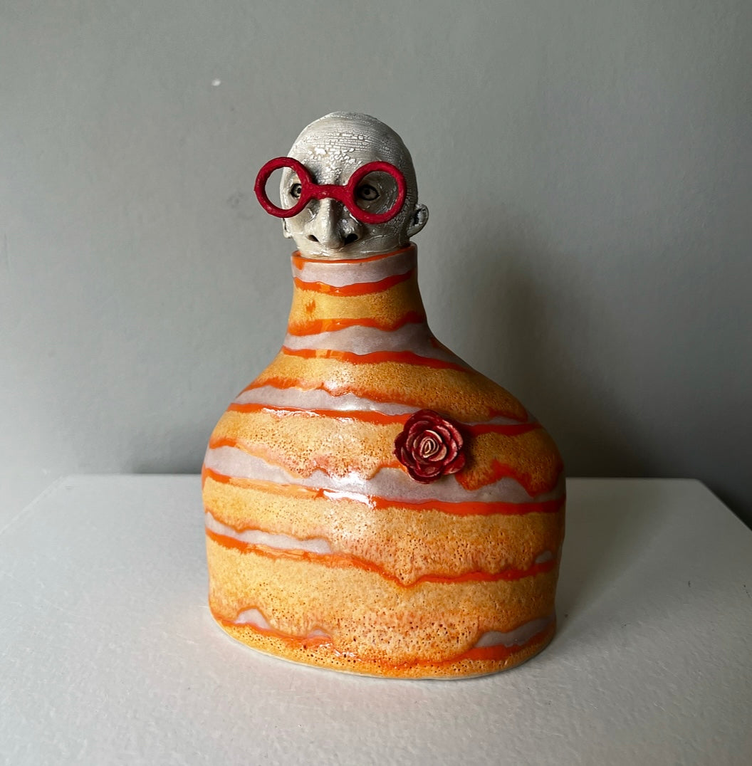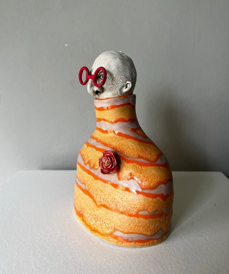 Valantin har klarröda stora runda glasögonbågar till det en orange & rosa polotröja prydd av en rosenbrosch.