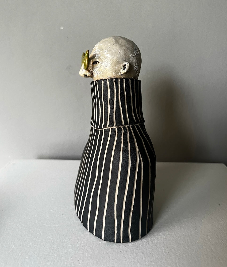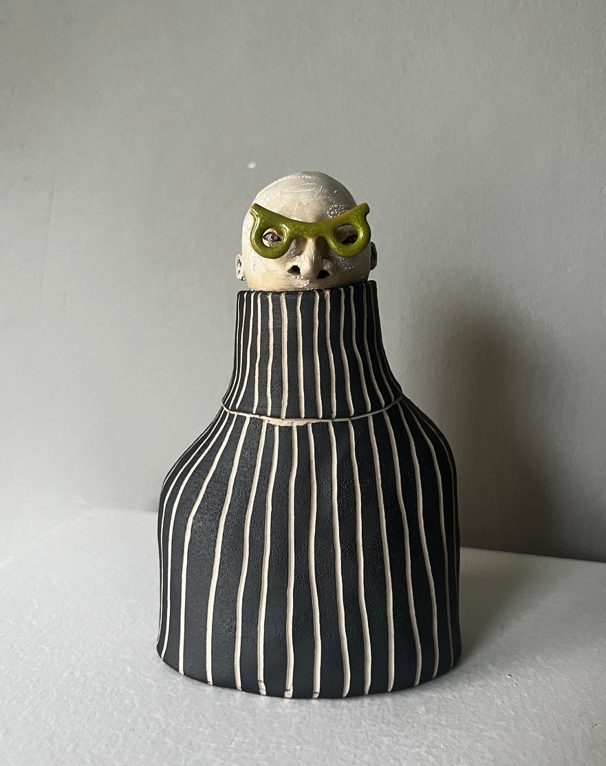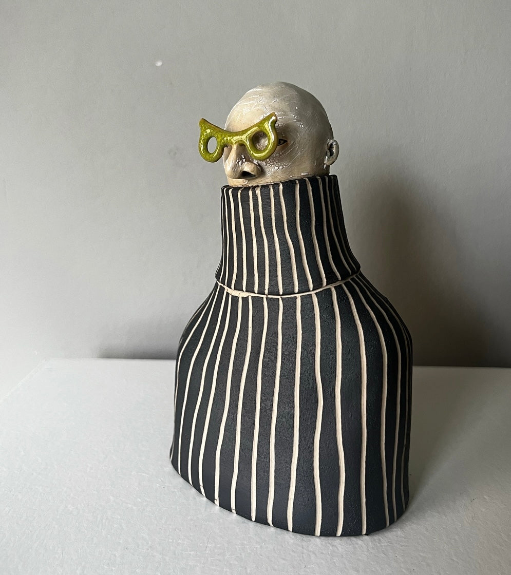 Erki har karaktäristiska olivgröna glasögon & till det en voluminös polotröja med randig struktur i svart & vitt.