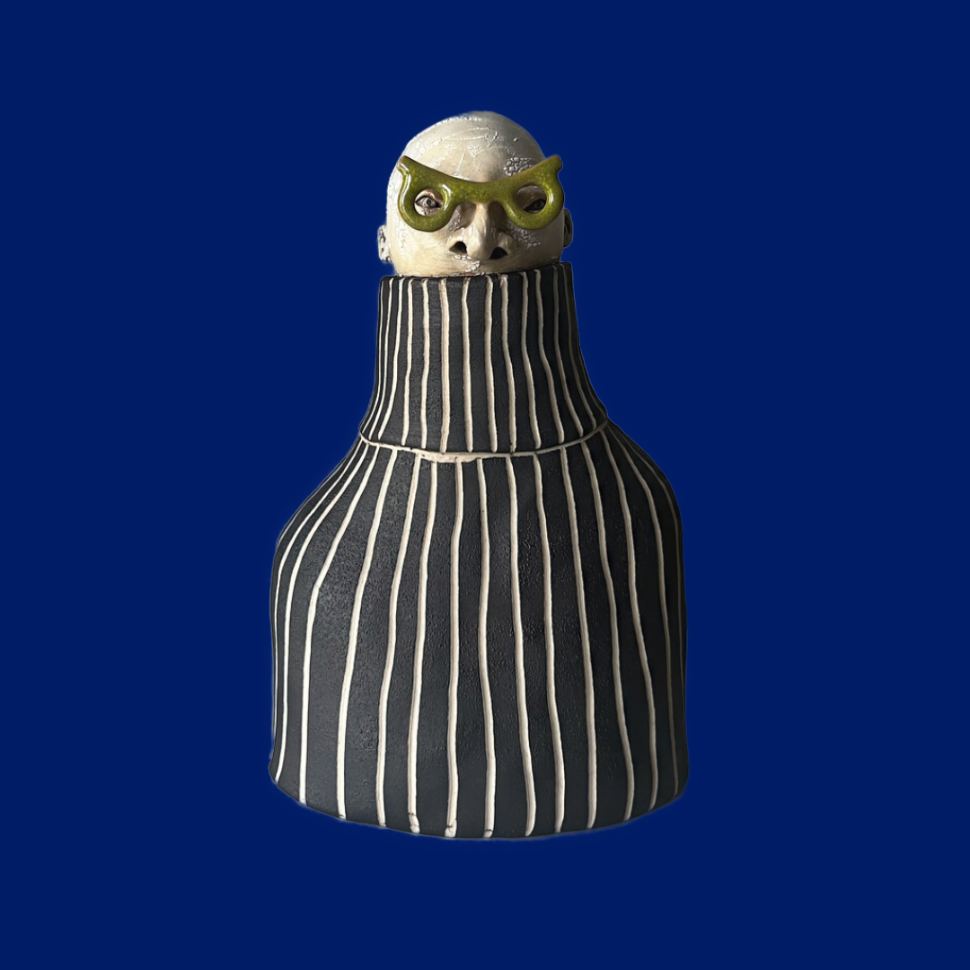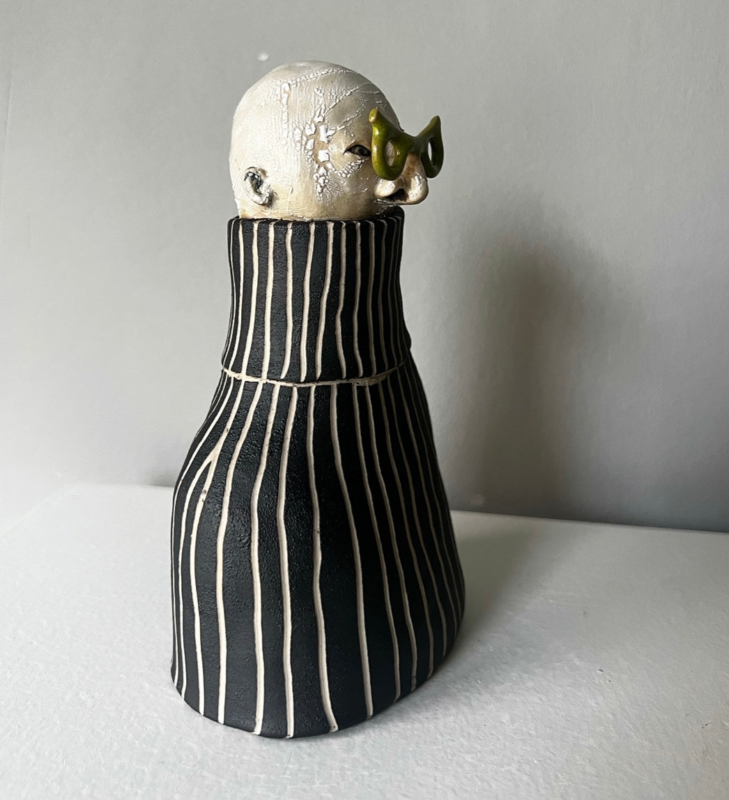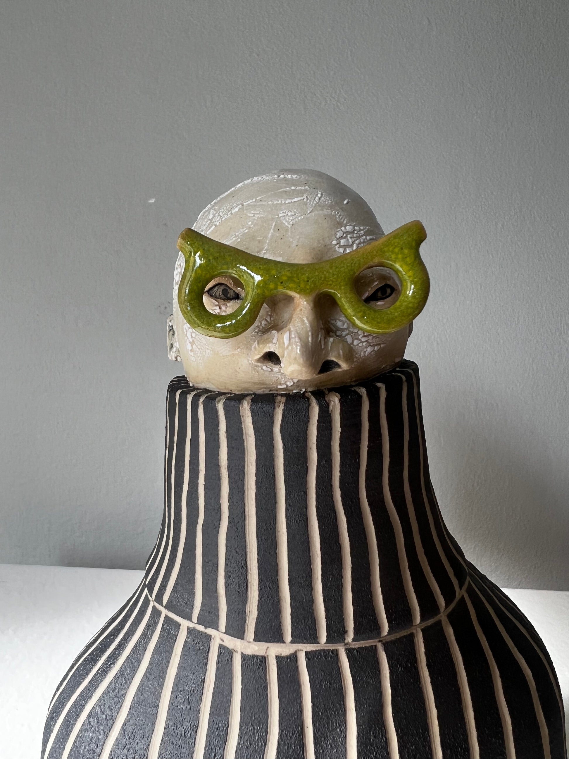 Erki har karaktäristiska olivgröna glasögon & till det en voluminös polotröja med randig struktur i svart & vitt.