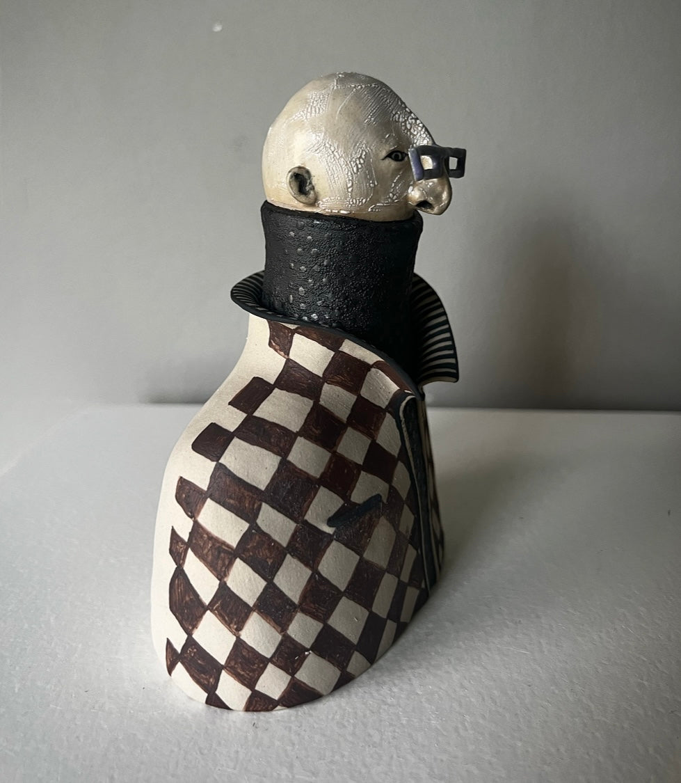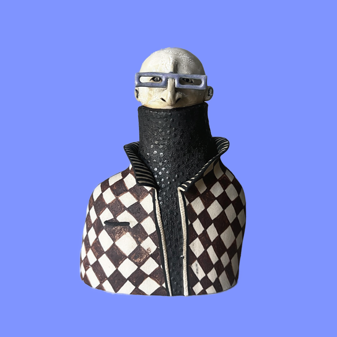Claudio har en brunrutig jacka med svarta detaljer, en svart polo med små halvblanka prickar, till detta en lavendelfärgad båge av smal rektangulär form.