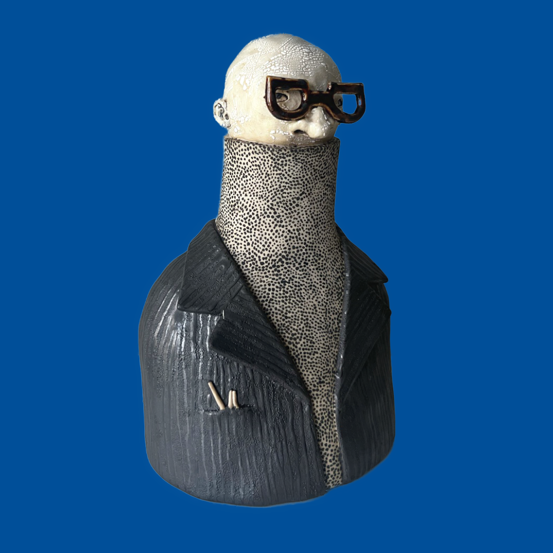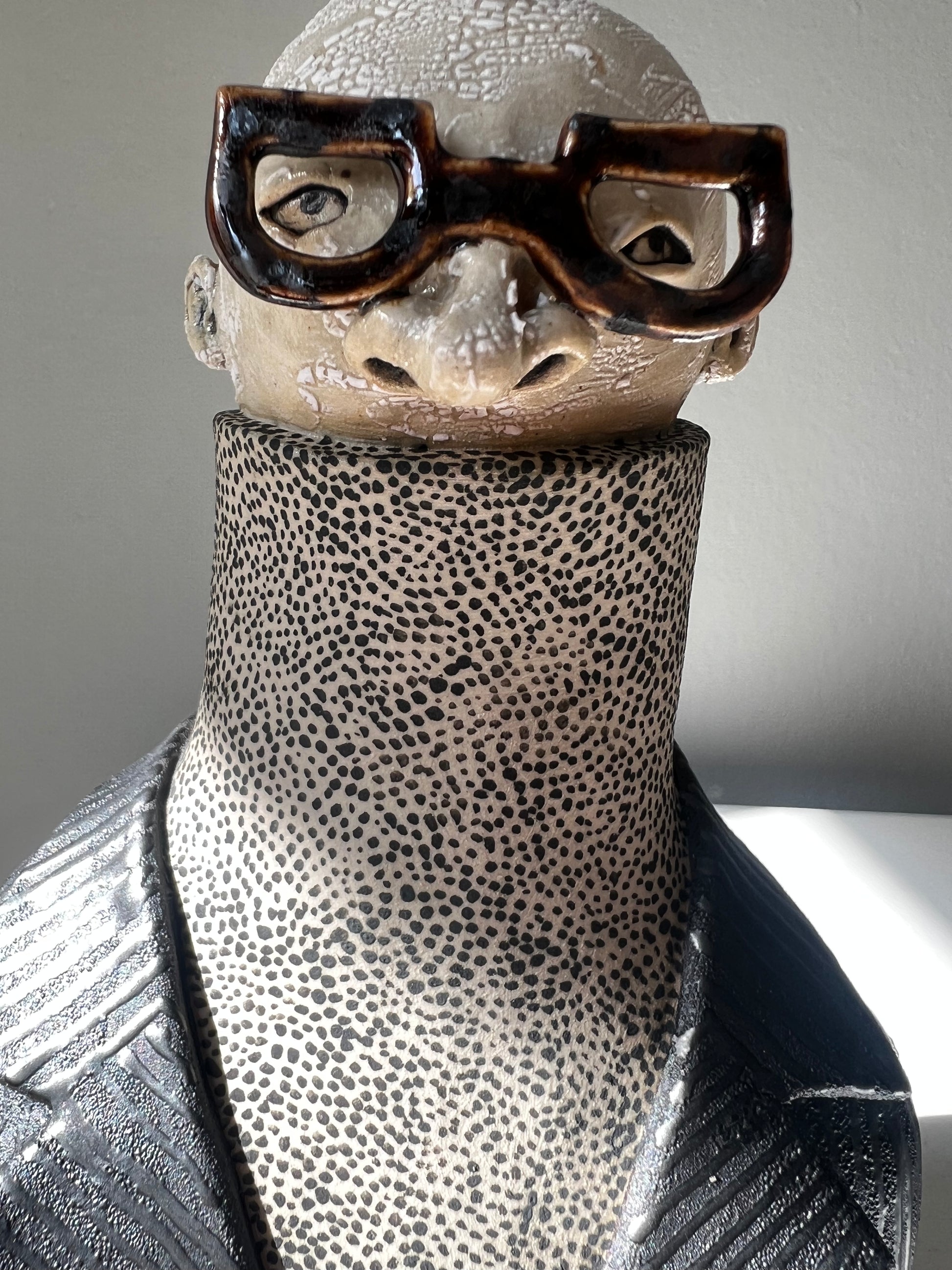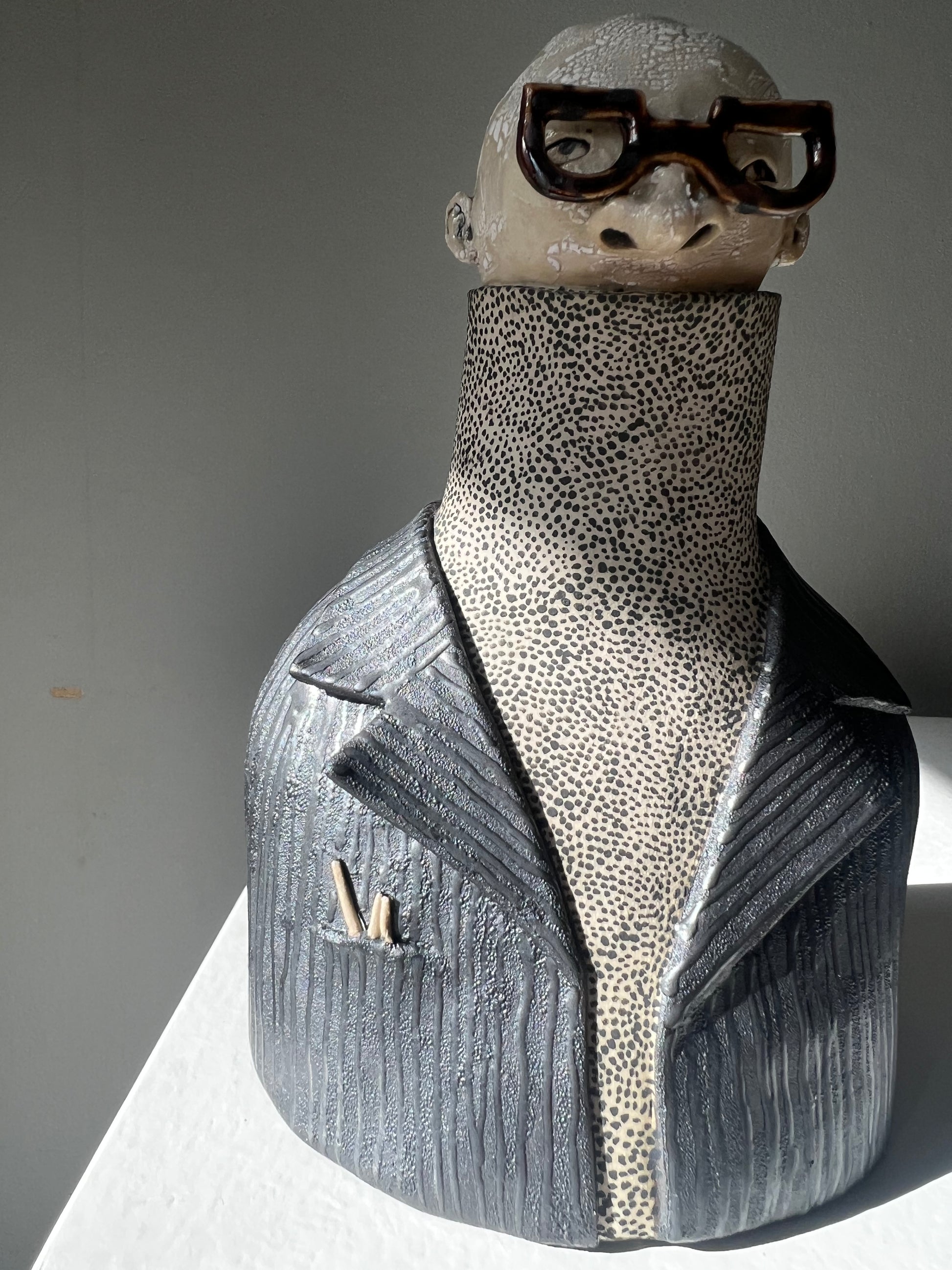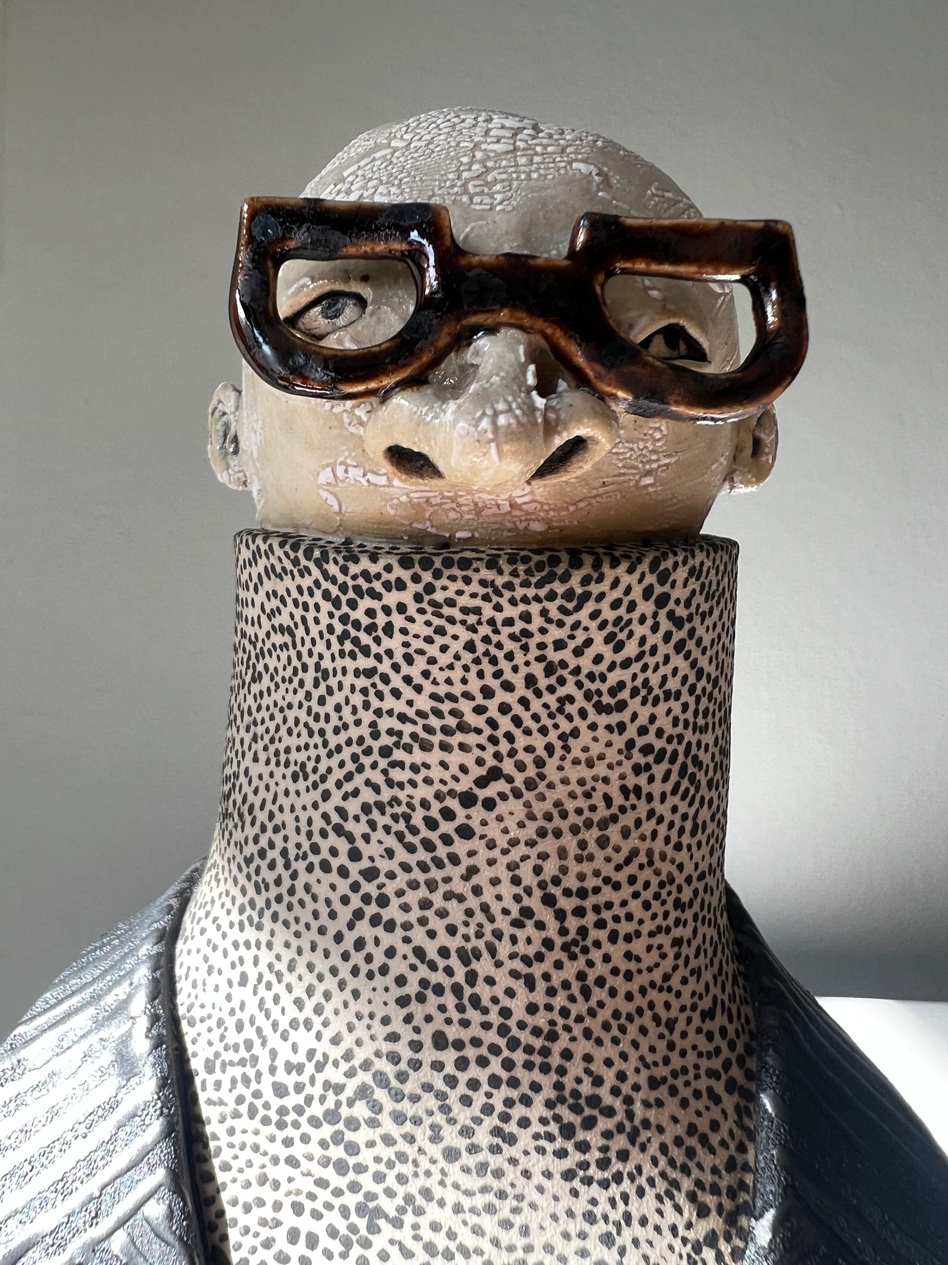 Max-Anton har en svart manchesterkavaj över en polo med små små svarta prickar & till det mörkbruna blanka bågar.