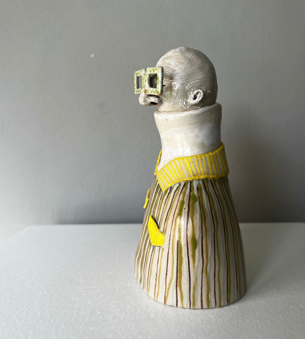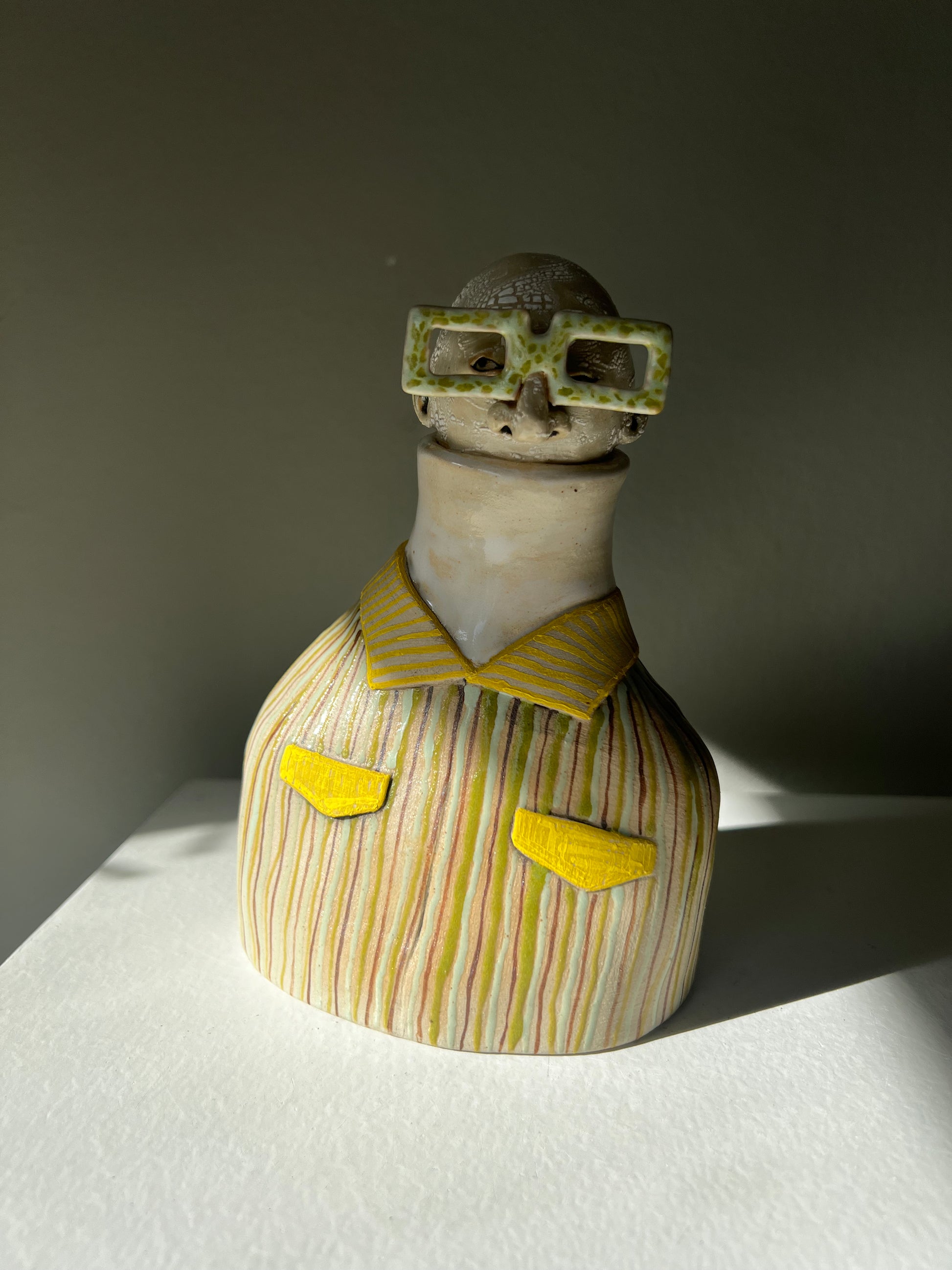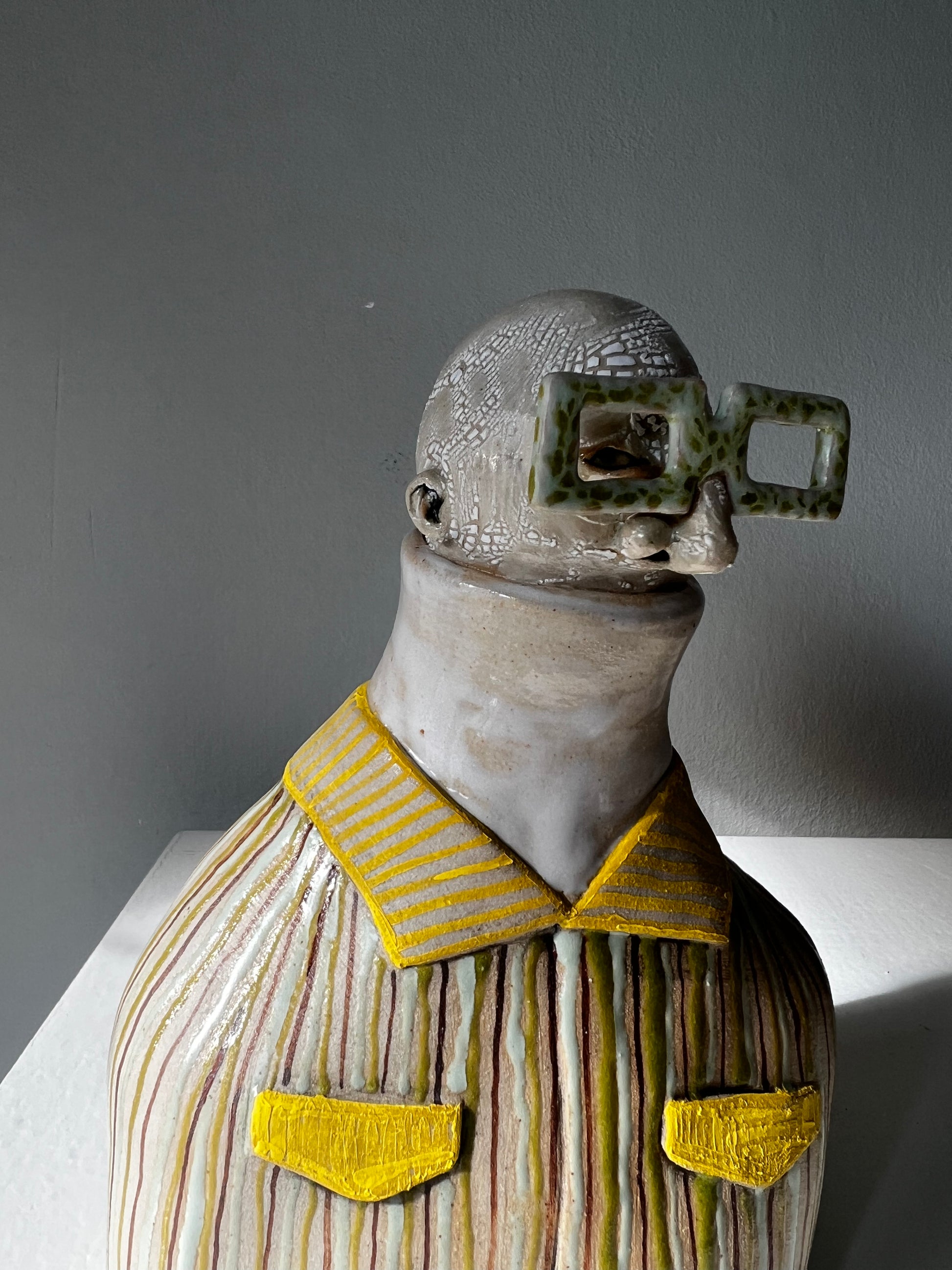 Dimitri har grönspräckliga XL-glajor, vit polo & en jacka med gröna & bruna ränder & knallgula detaljer.