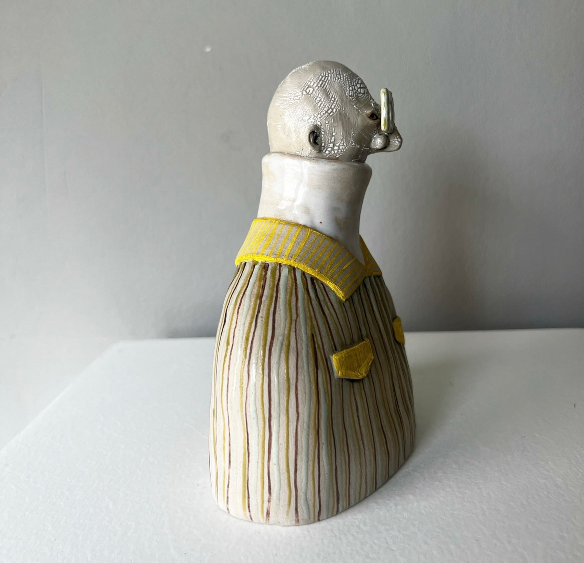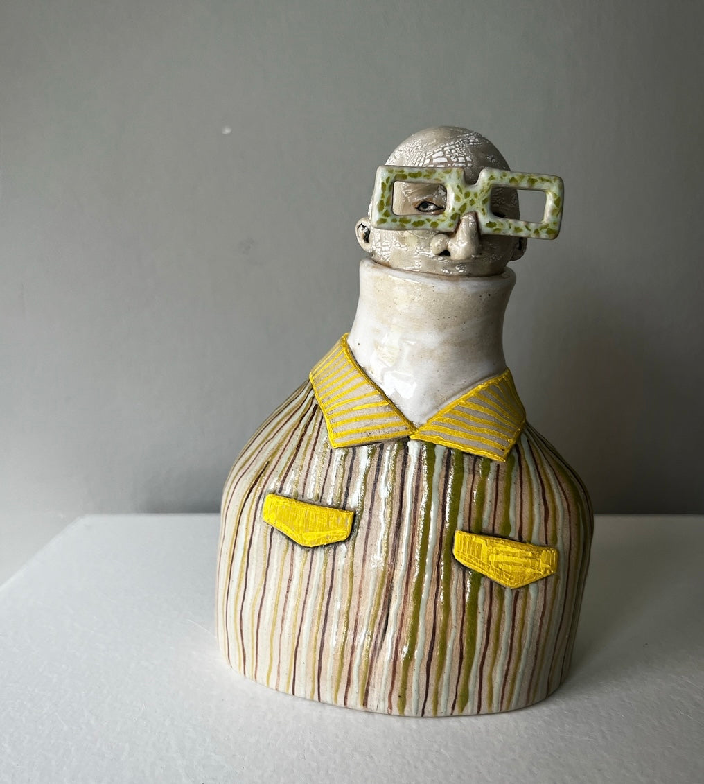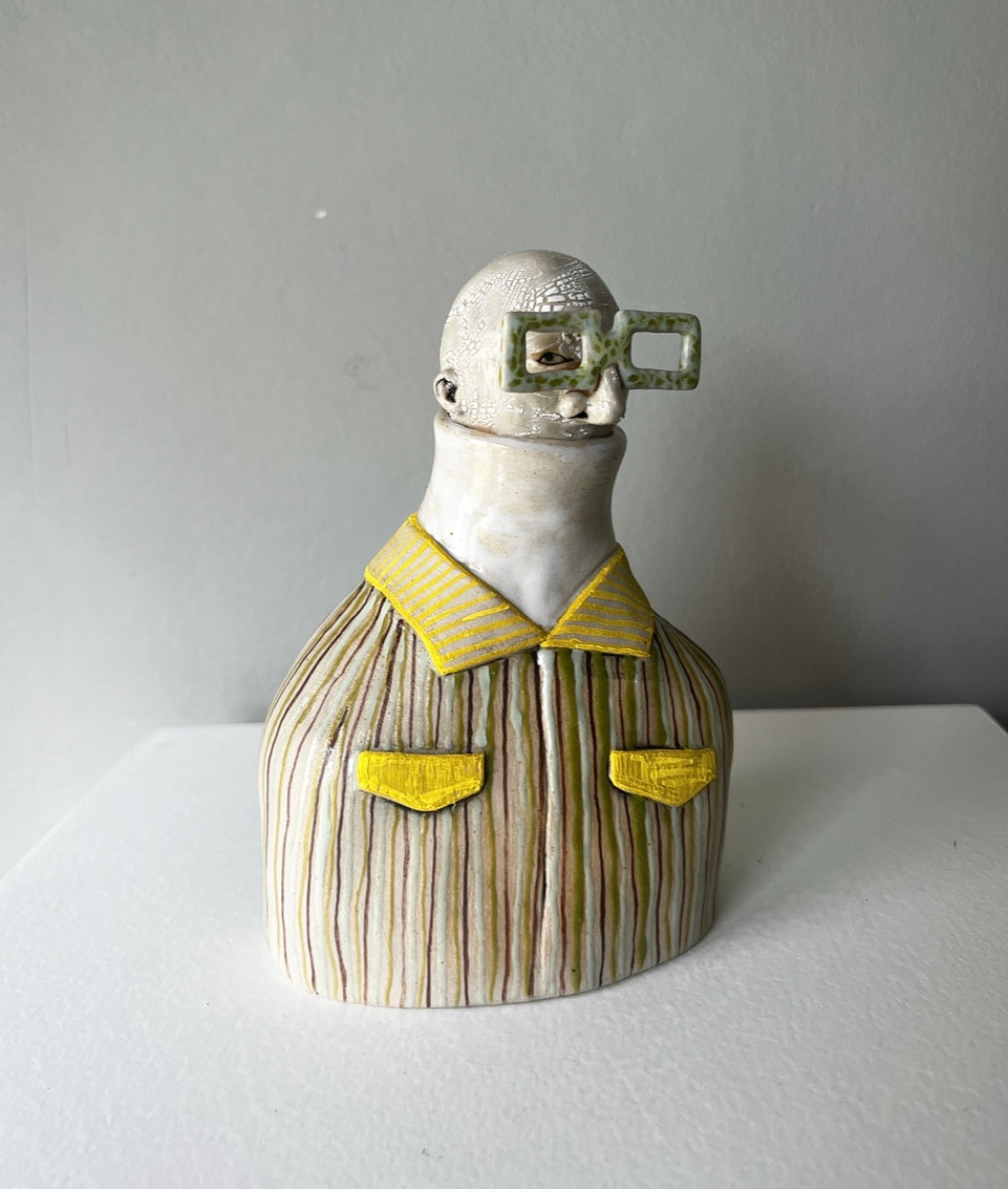 Dimitri har grönspräckliga XL-glajor, vit polo & en jacka med gröna & bruna ränder & knallgula detaljer.