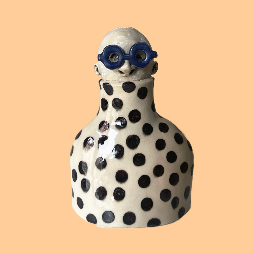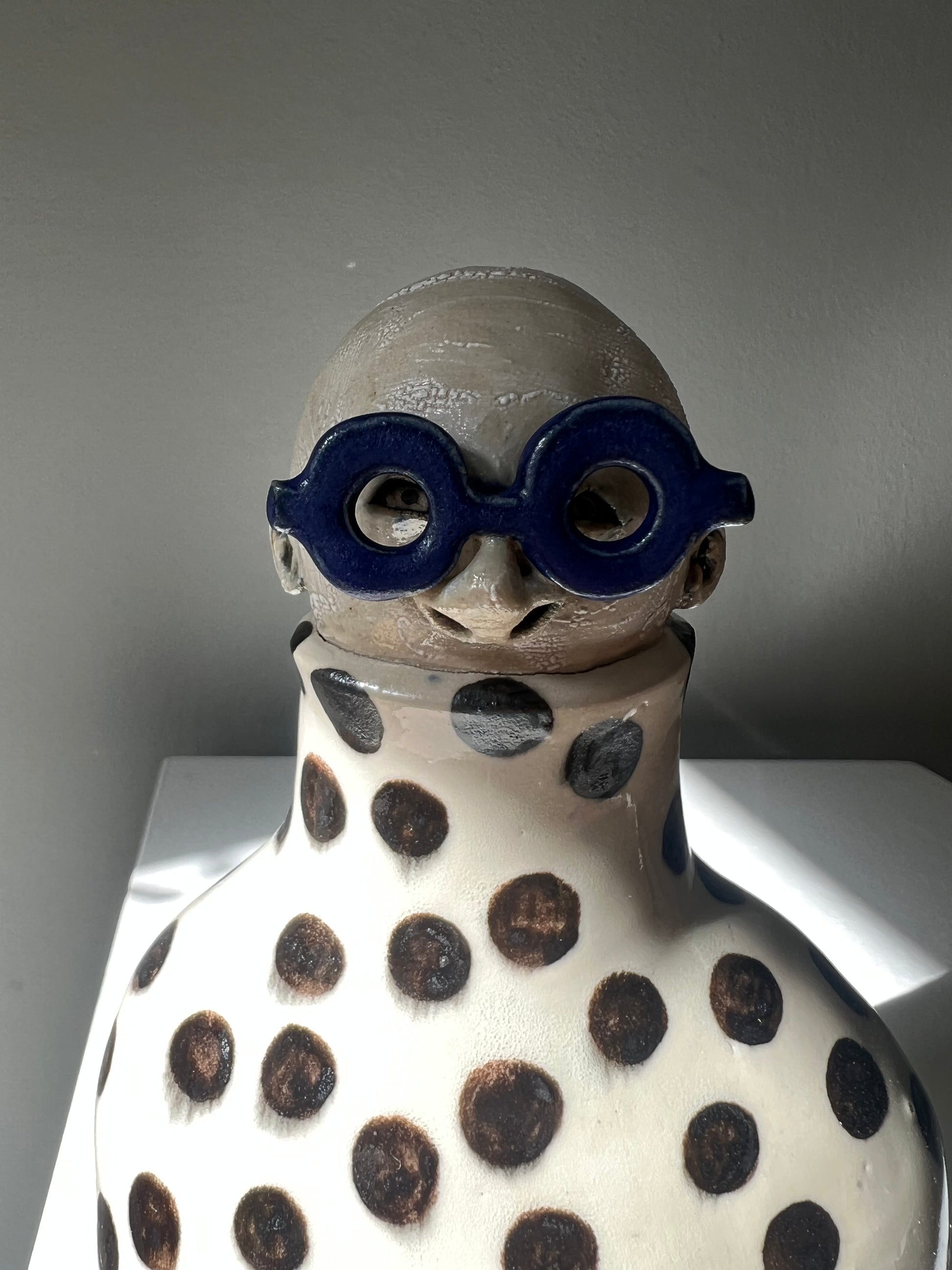 Raymond har tjocka runda glasögon i kungsblå nyans & en blank prickig polo.