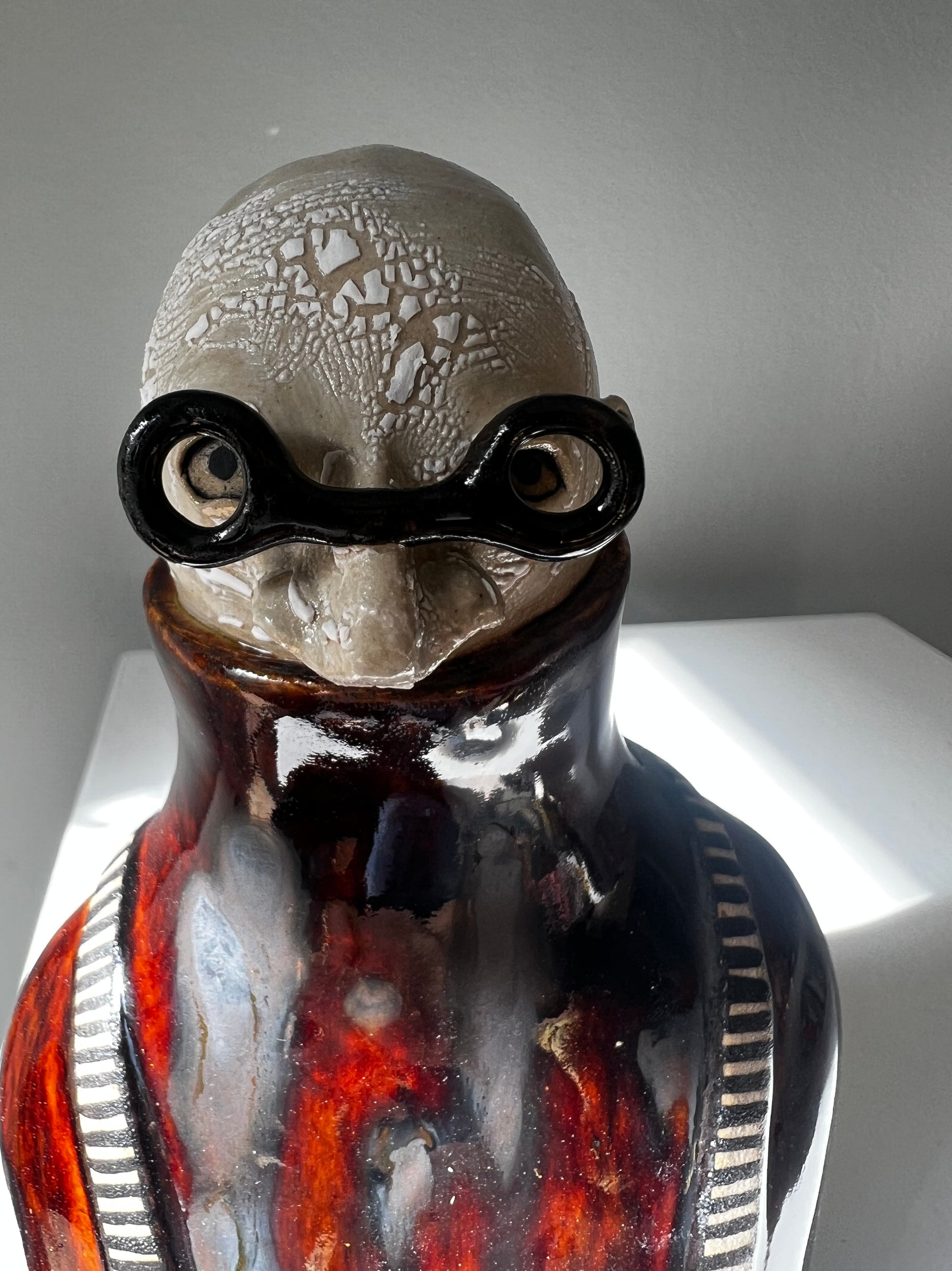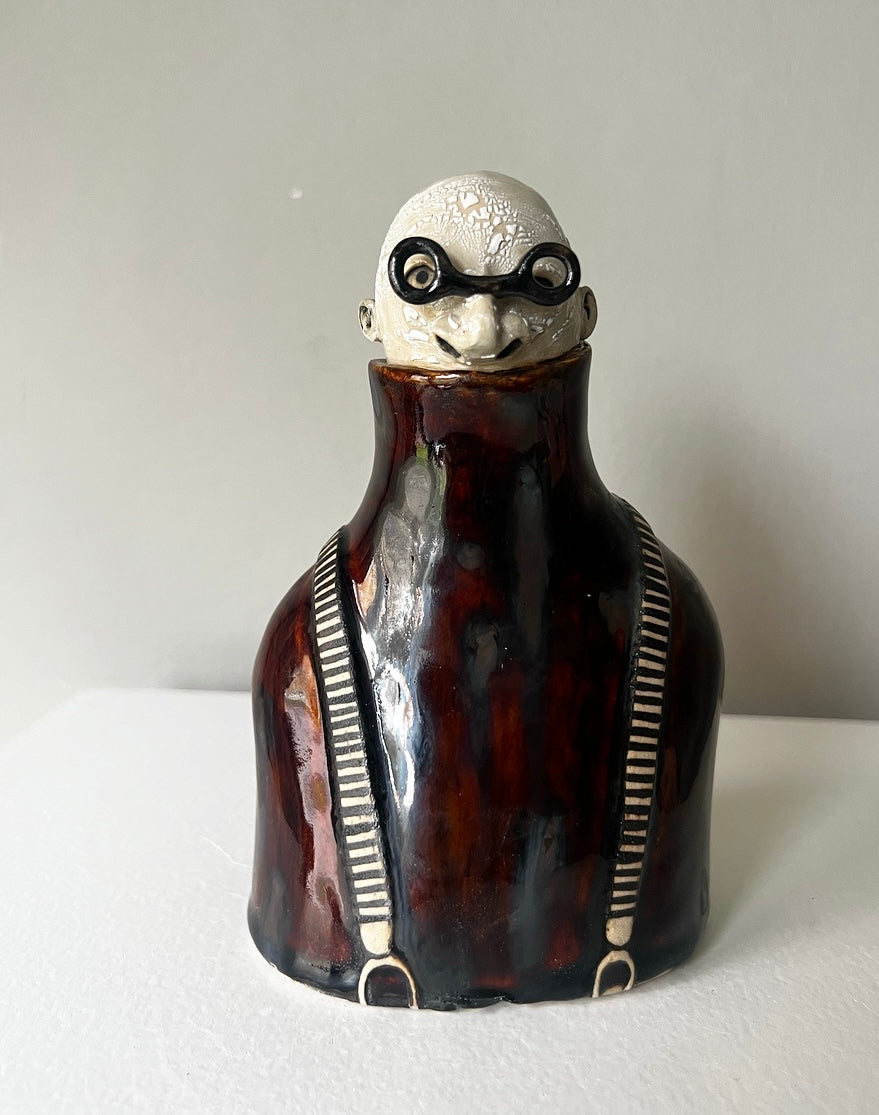 Tord har en högblanka brun polo som i solen nästan skimrar röd, denna med inslag av fläckar (oxid) & över detta hängslen i randigt. Glasögonen är små svarta & runda.