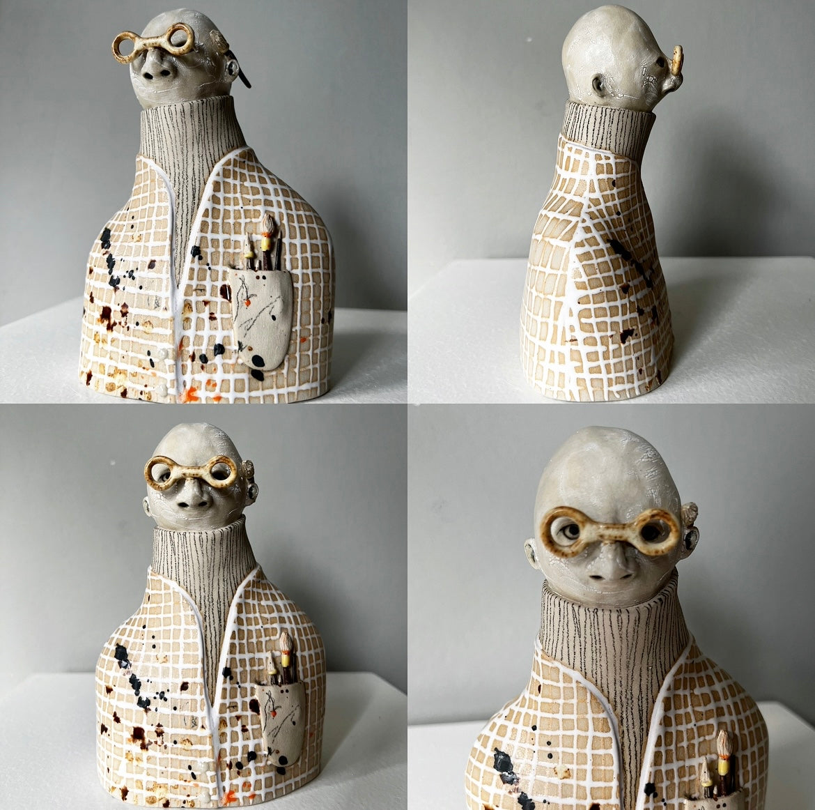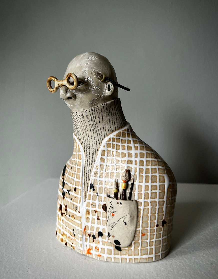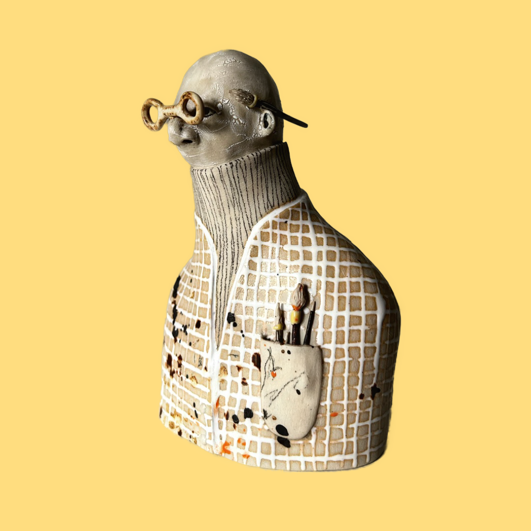 Petri är en konstnärstyp med rutig målarrock, nedstänkt av färg & med penslar både i fickan & bakom örat. Glasögonen han bär är små runda i ljus beige.