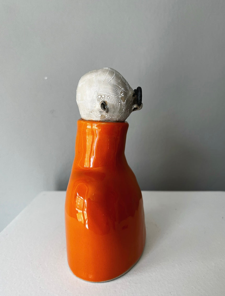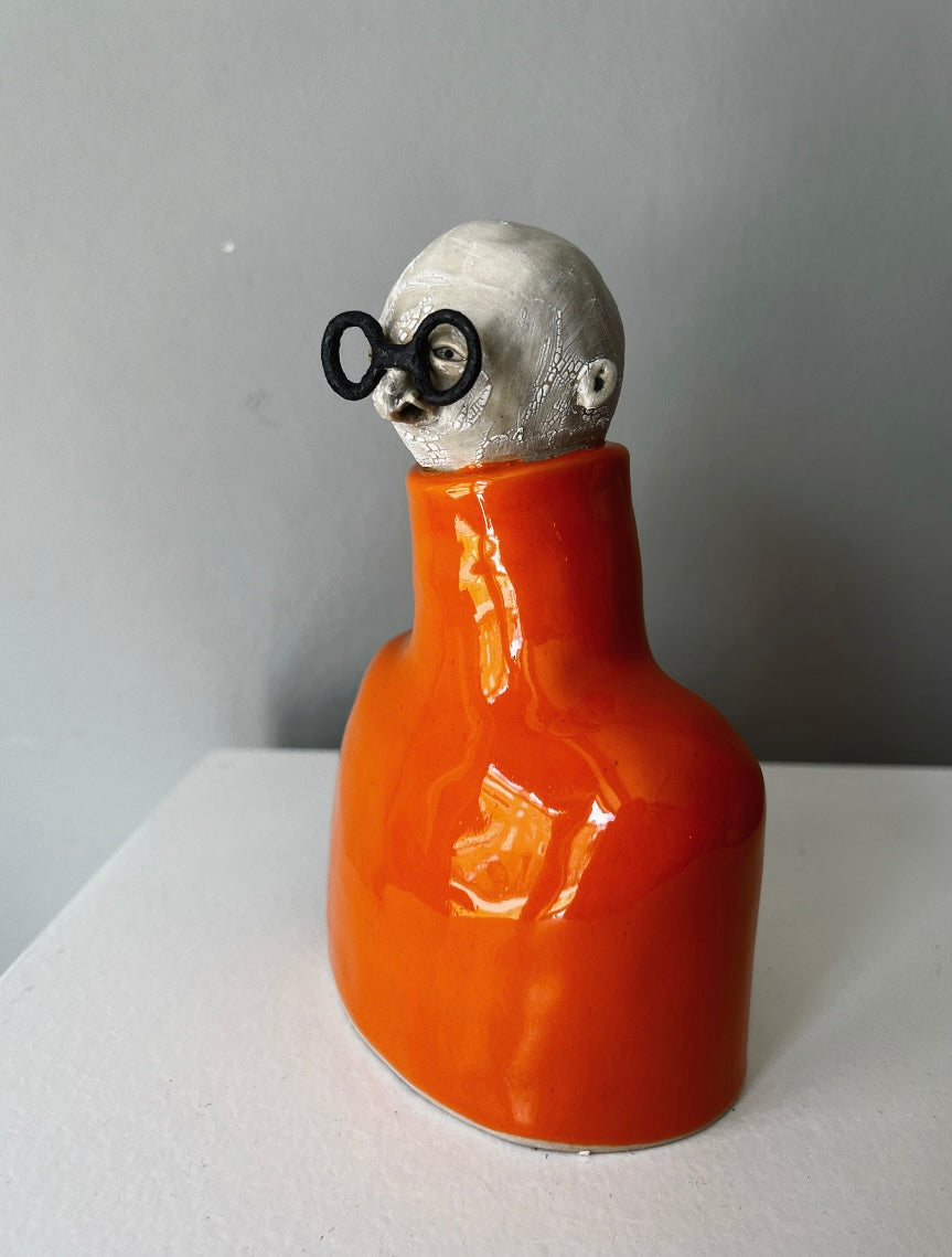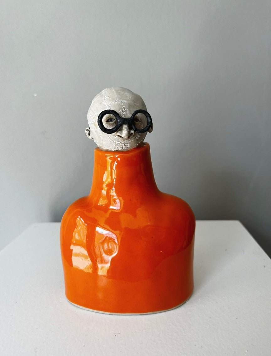 Lorentz har stora runda, mattsvarta glasögon & högblanka orange polotröja.