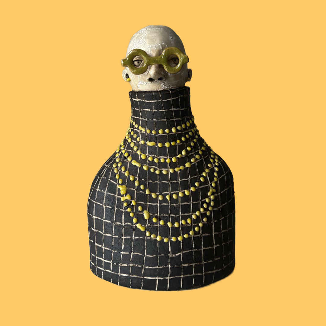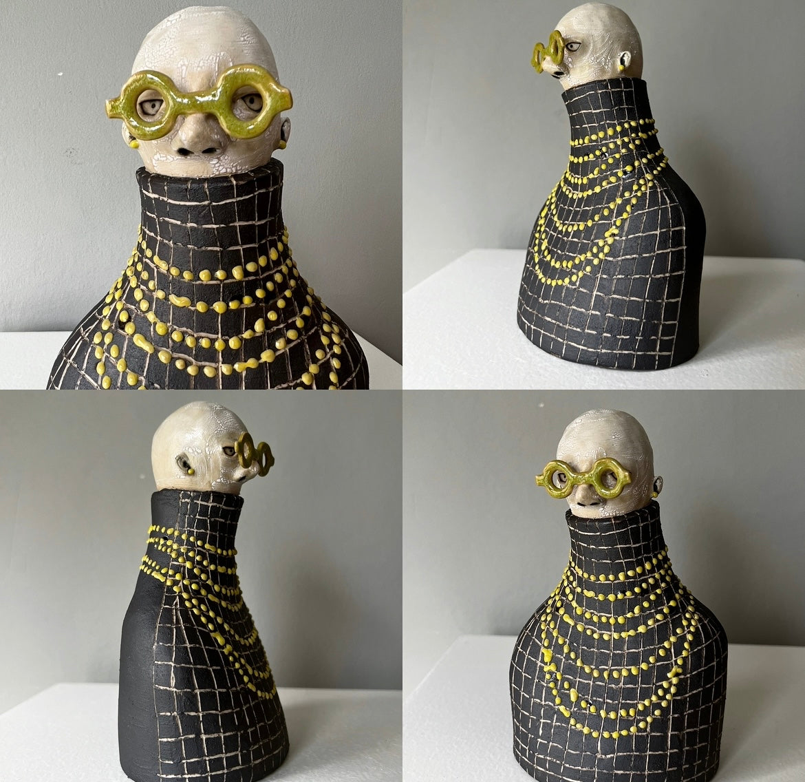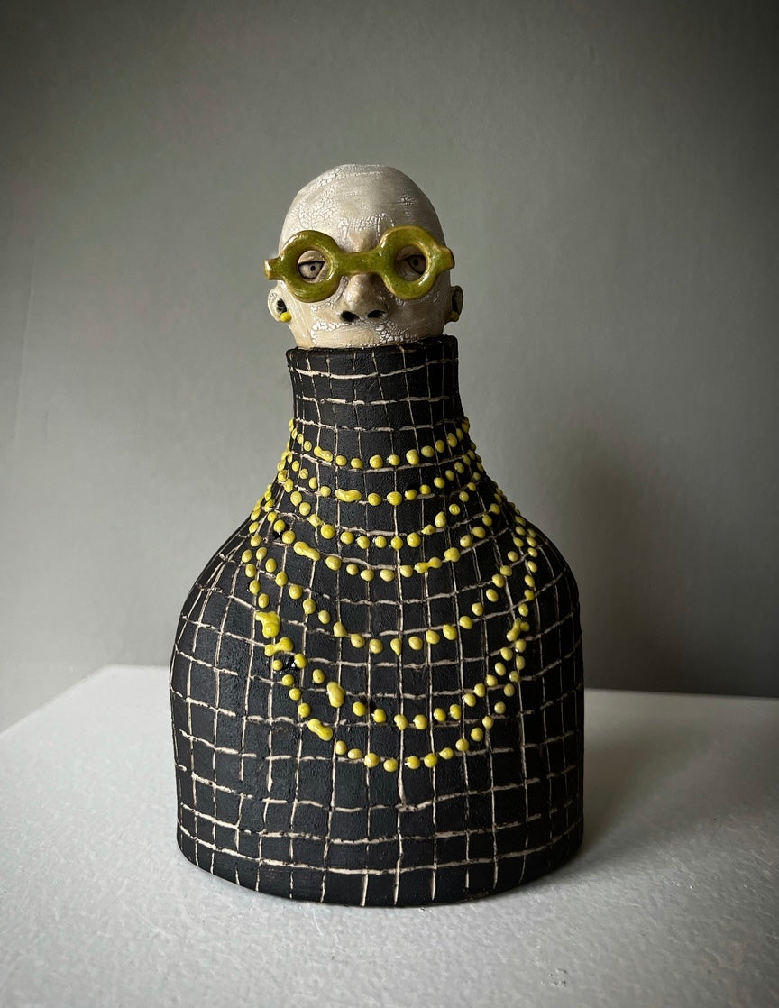 Urban älskar halsband! Han bär här ett kluster av gulgröna pärlor över en svart rutig polo & matchande örhängen. Hans runda kraftiga glasögonbågar är blankt olivgröna.