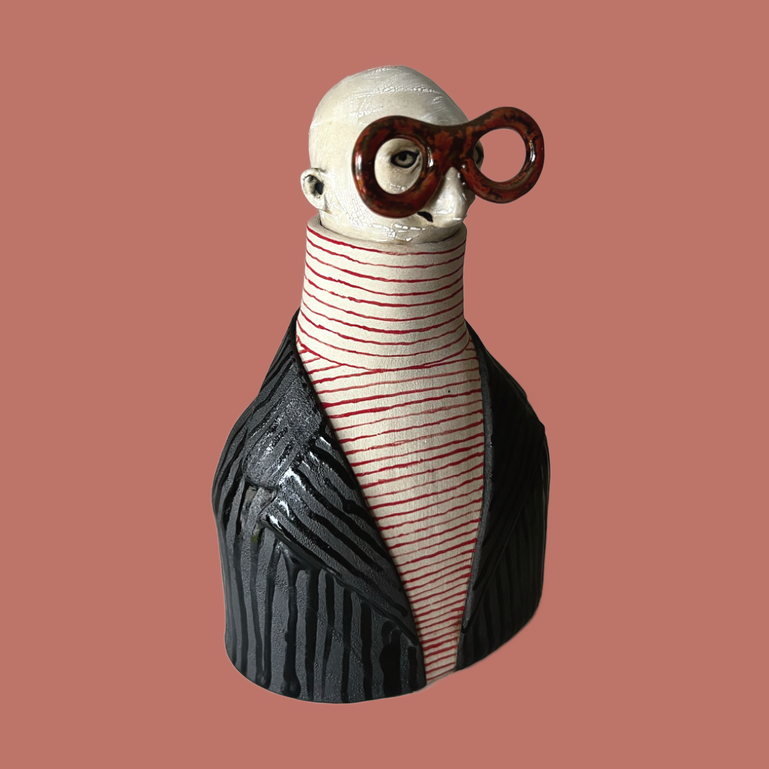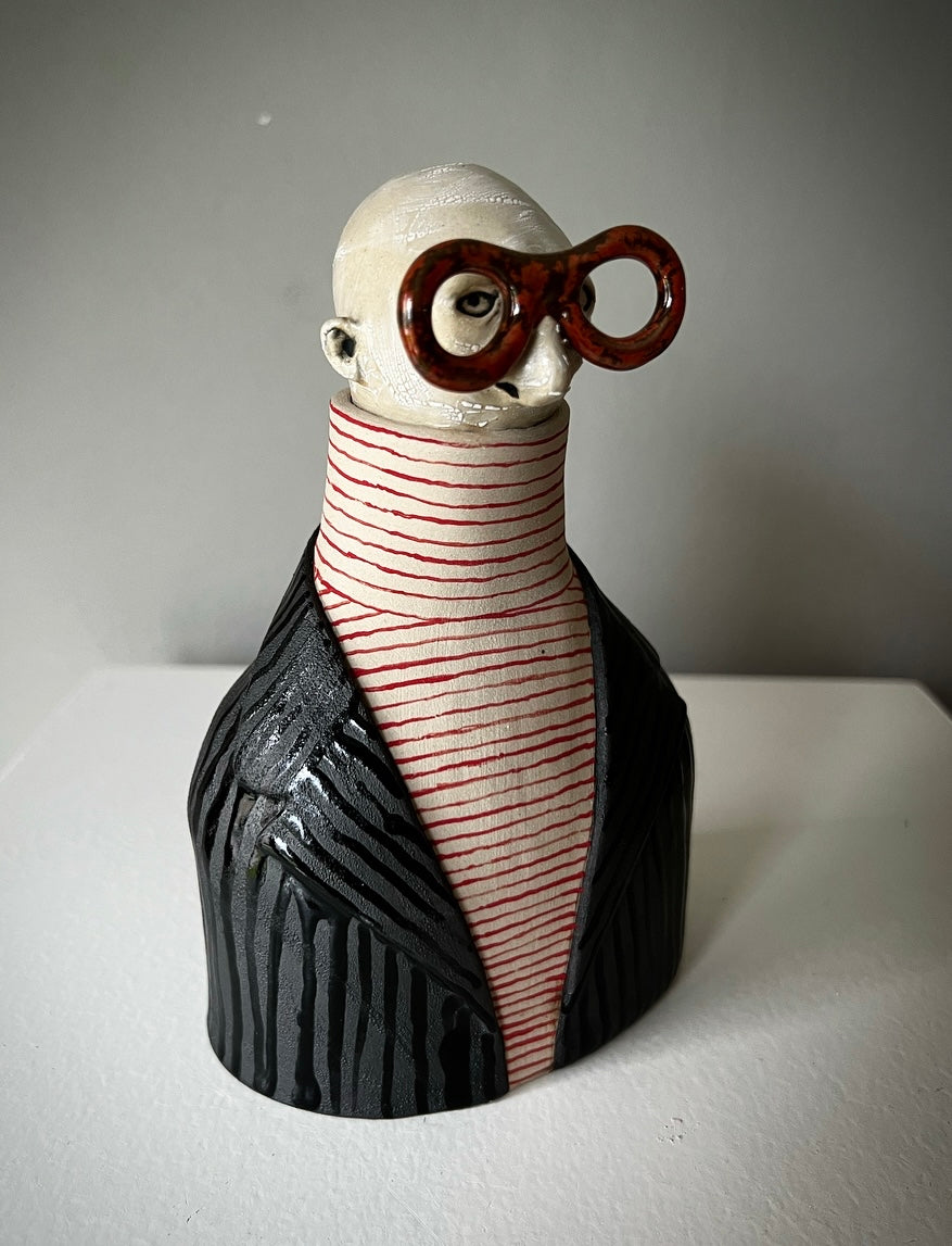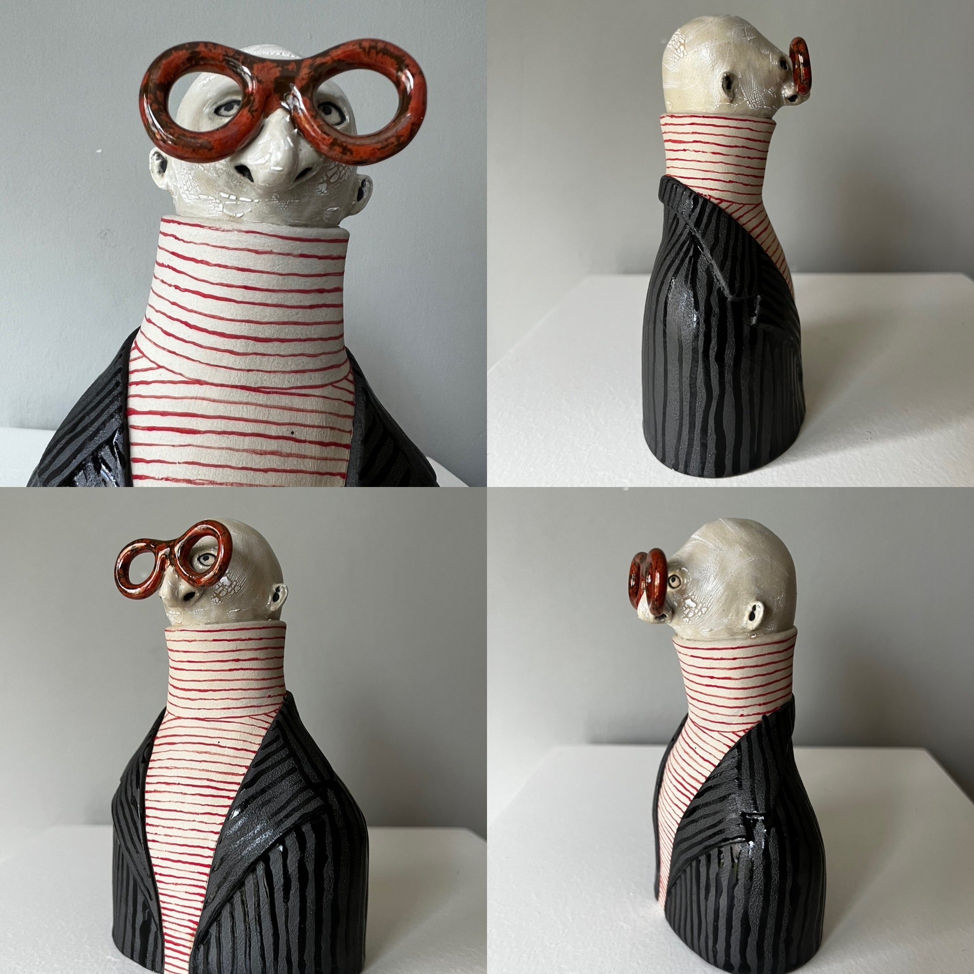 Ben är dressad svart kavaj med blanka rendera, överen polo med tunna röda streck. Glasögon är kraftiga, oxblodsfärgade & högblanka!