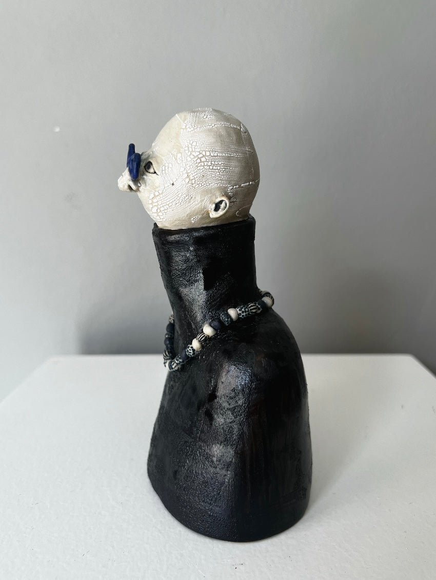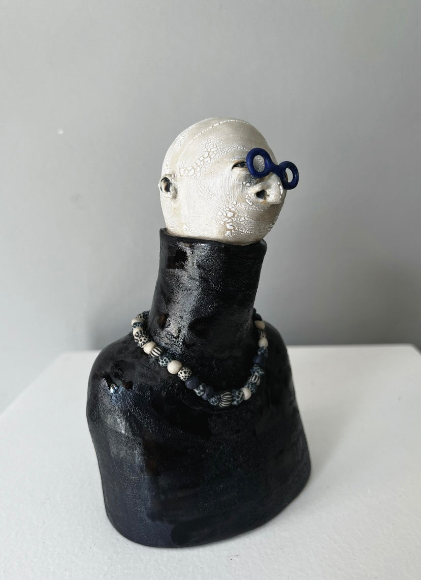 Jonas har koboltblå små, runda glasögon, svart polo & ett halsband med mönstrade pärlor i blå toner.
