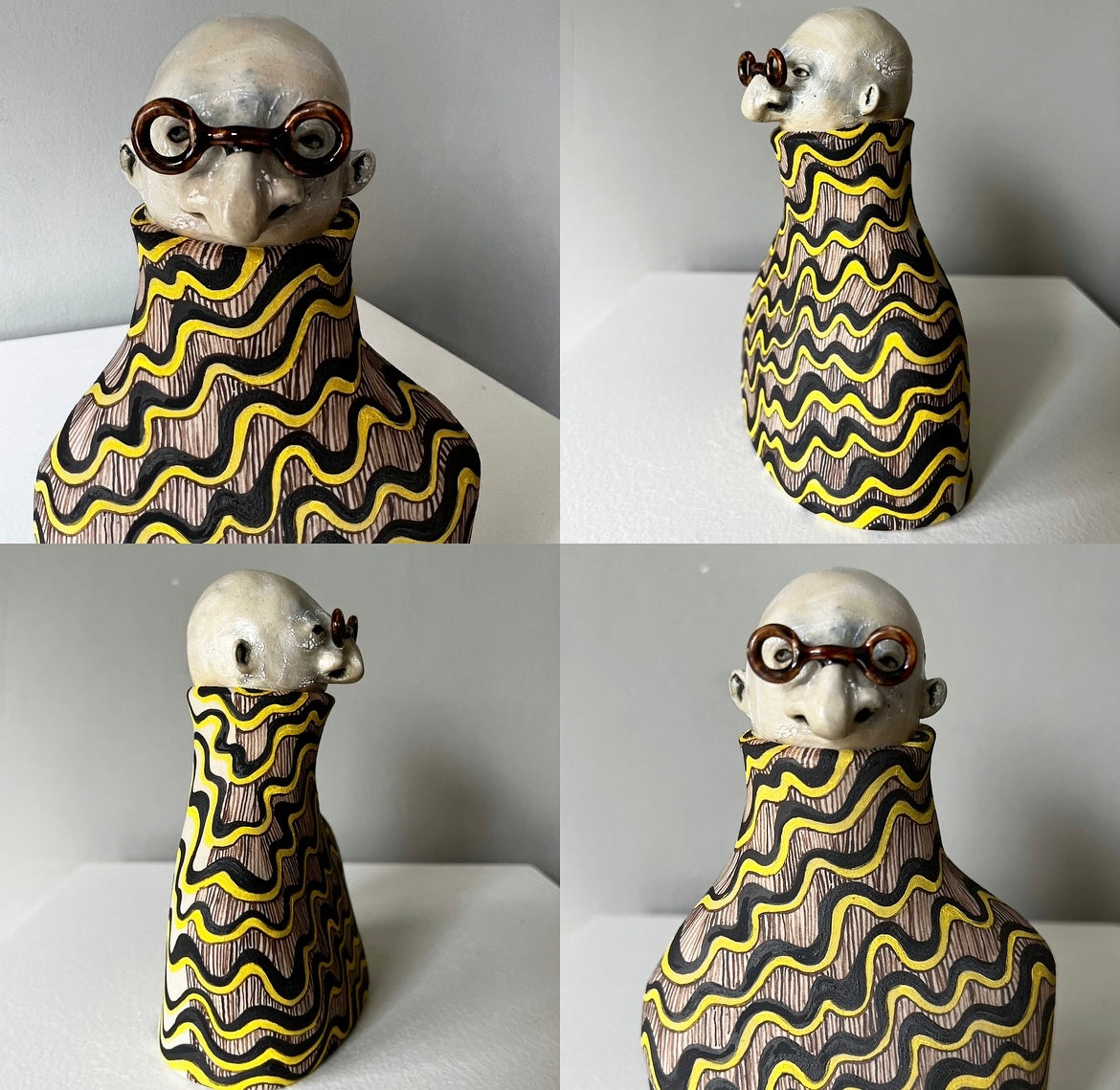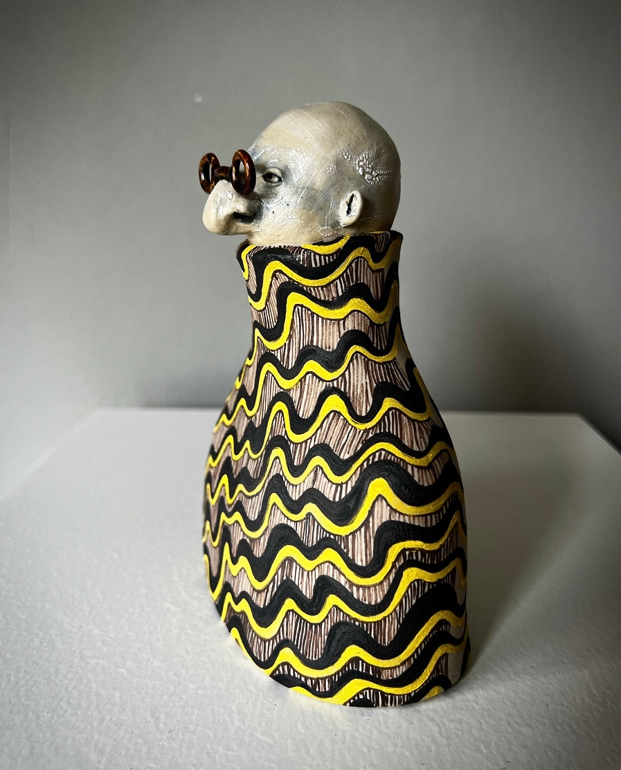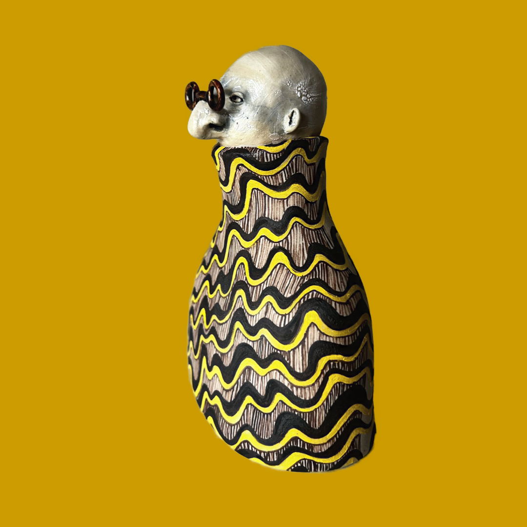 Emanuel bär en färgsprakande polo i gult, brunt & svart, till denna en blank brun, rund båge av mindre modell.
