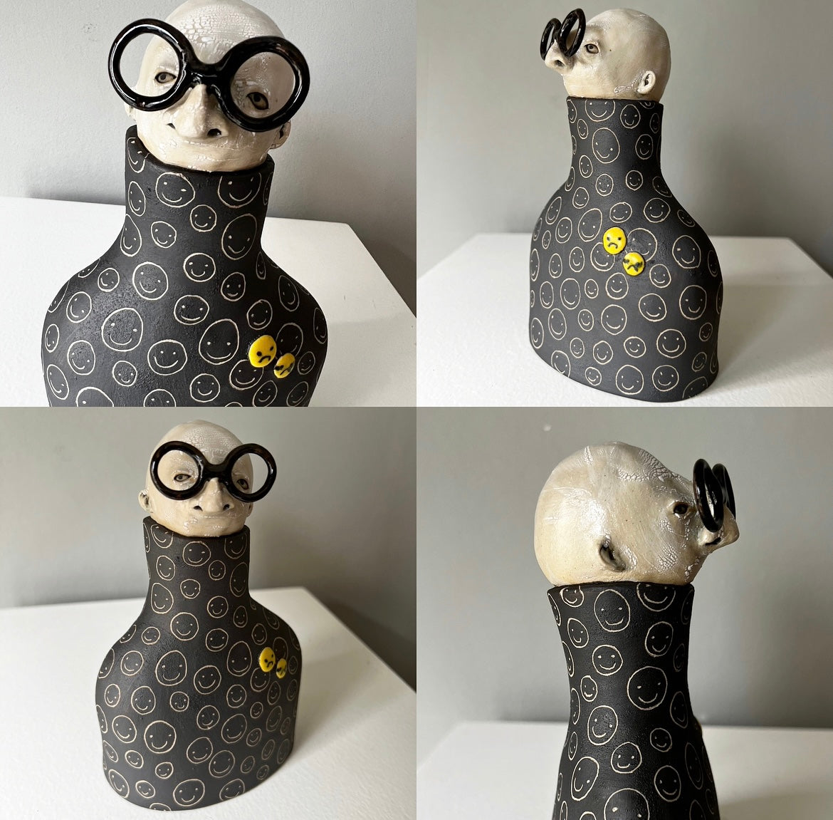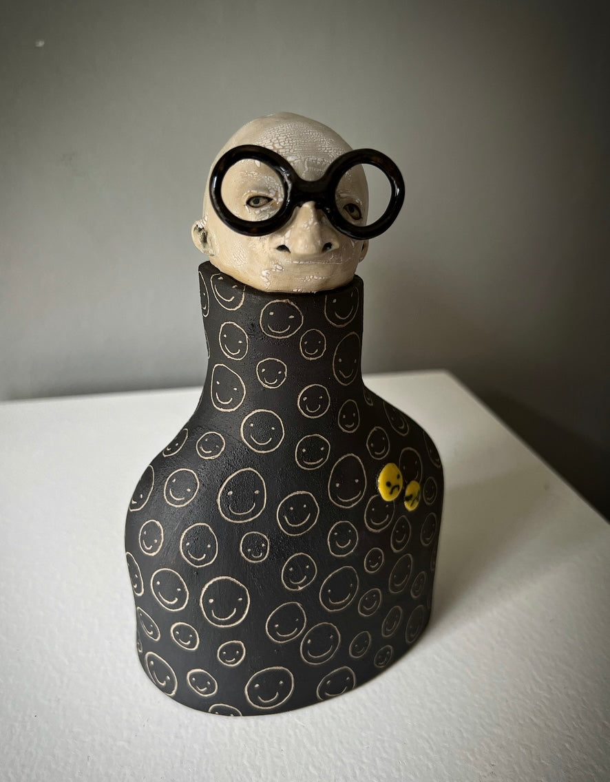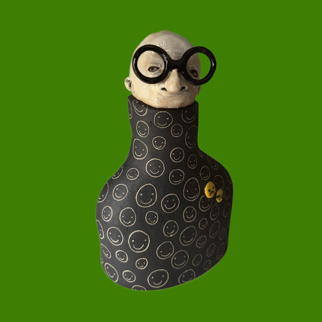 Pierre har stora runda glasögon i blankt svart & en svart polo med smileys utsmyckad med två gula broscher.
