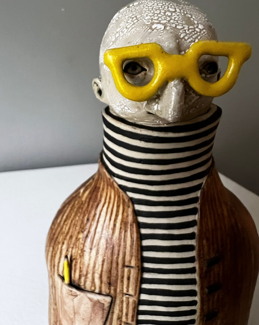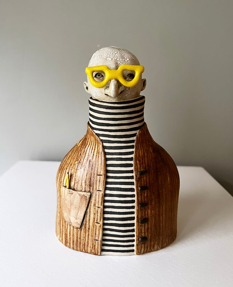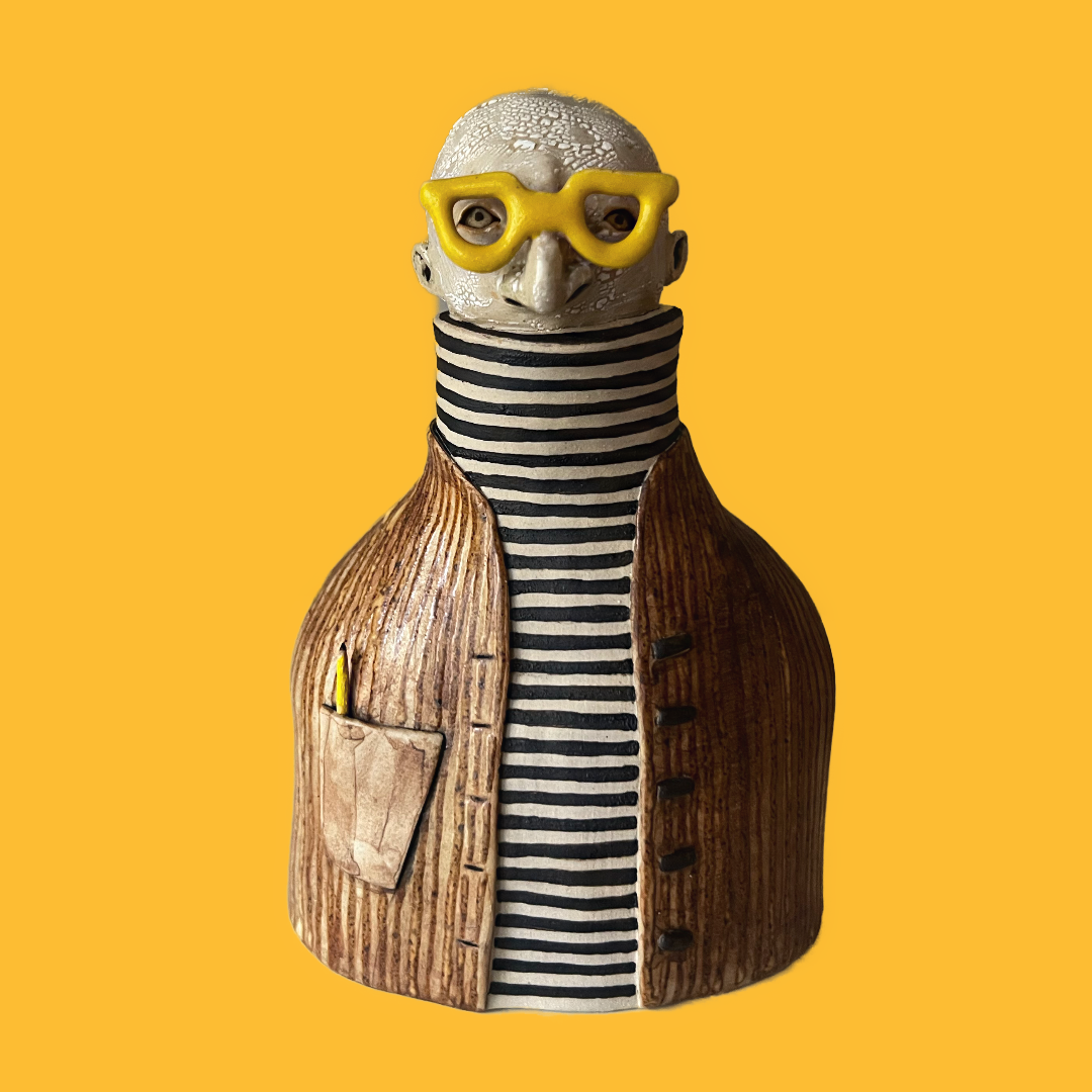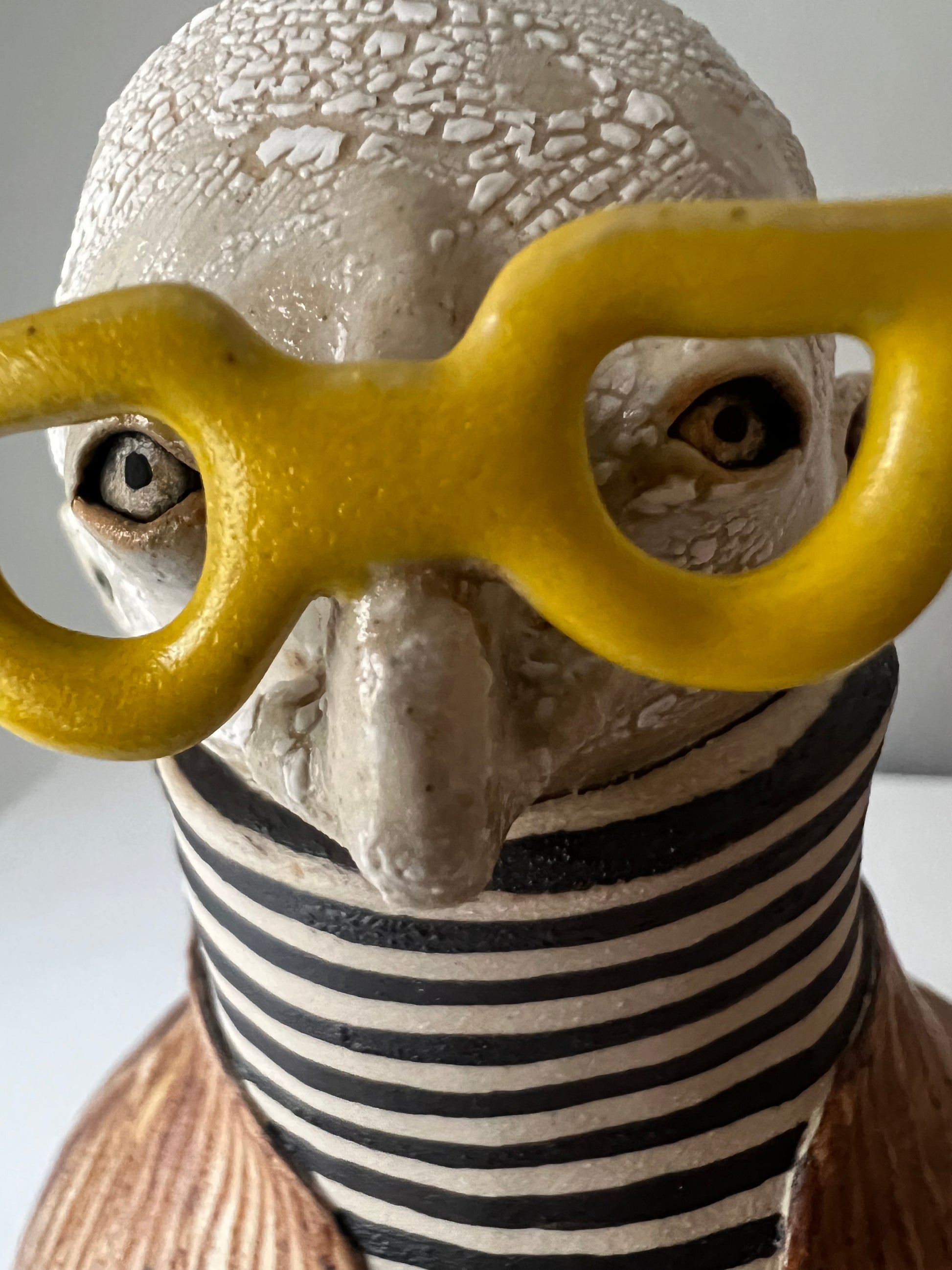 Arnold bär iögonfallande knallgula glasögon, en randig polo med en brun avslappnad overshirt. Pennan är alltid redo i bröstfickan.