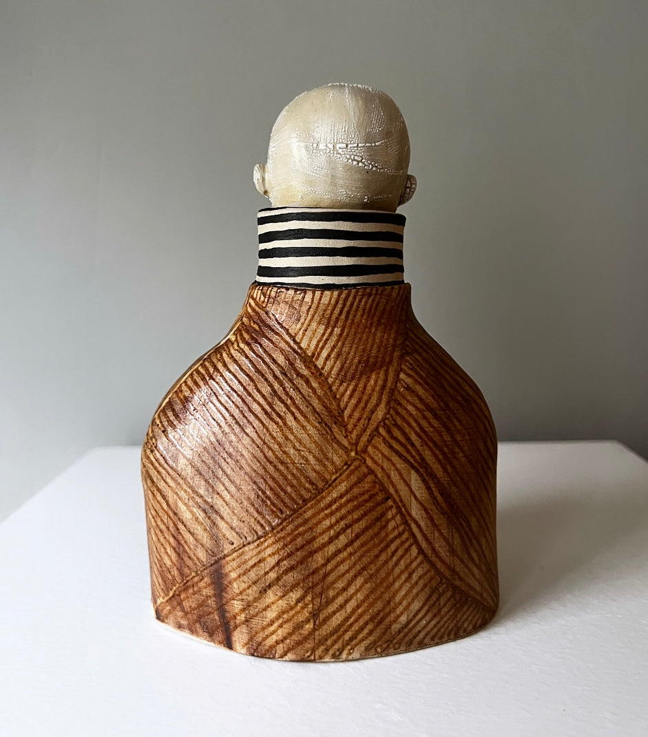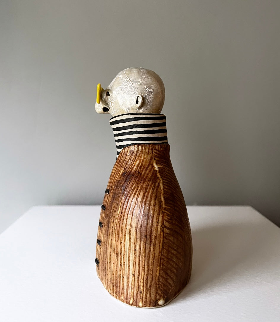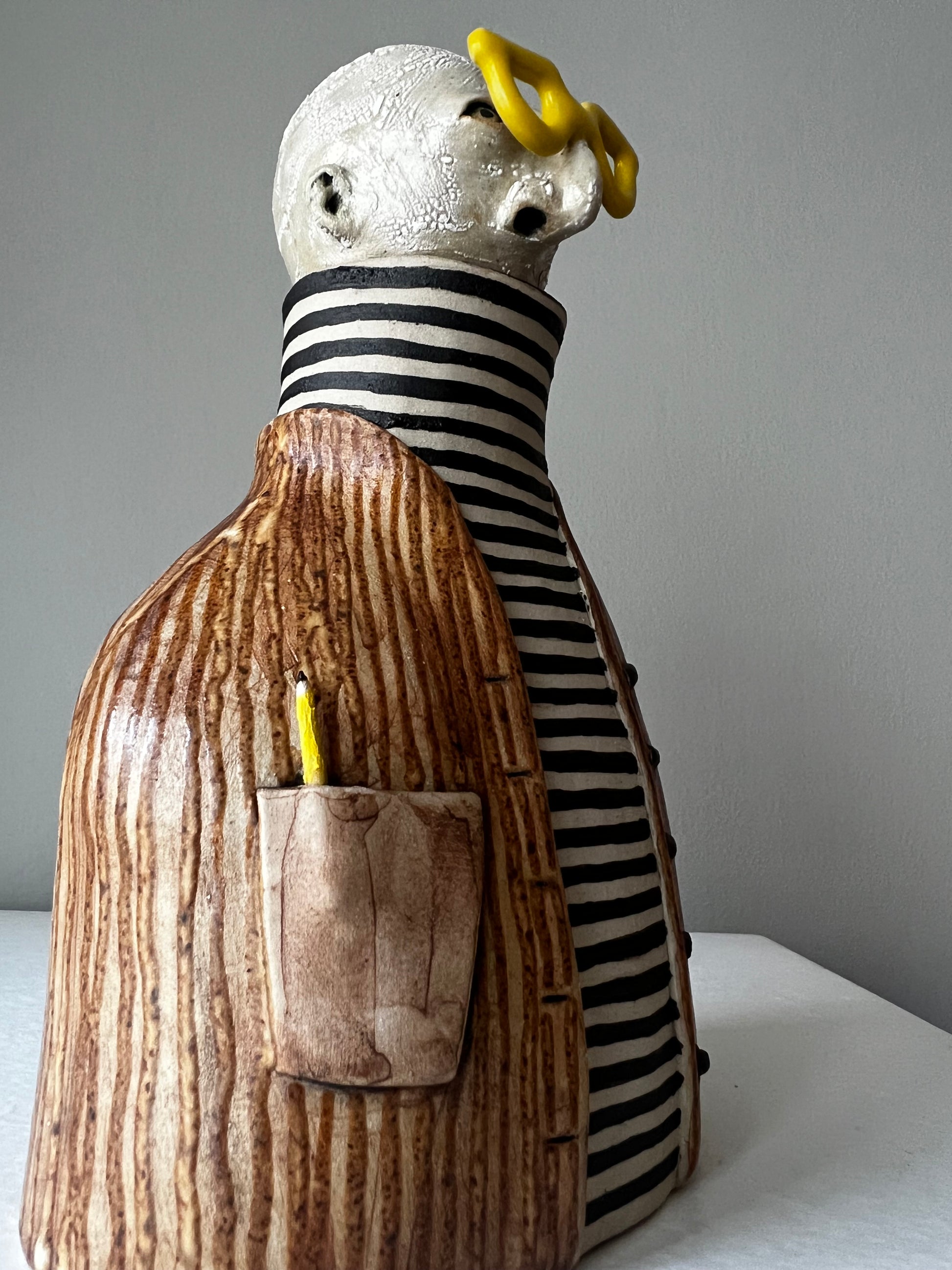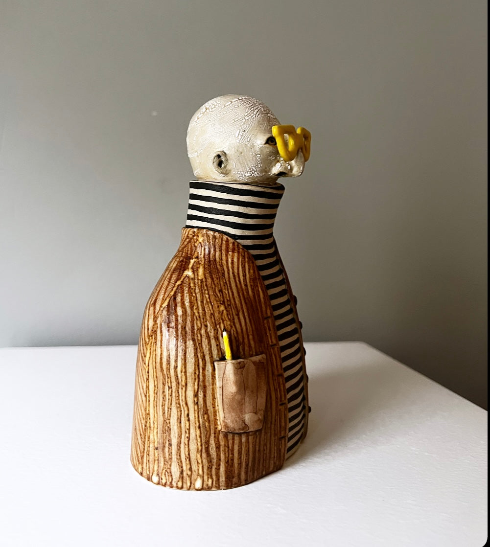 Arnold bär iögonfallande knallgula glasögon, en randig polo med en brun avslappnad overshirt. Pennan är alltid redo i bröstfickan.
