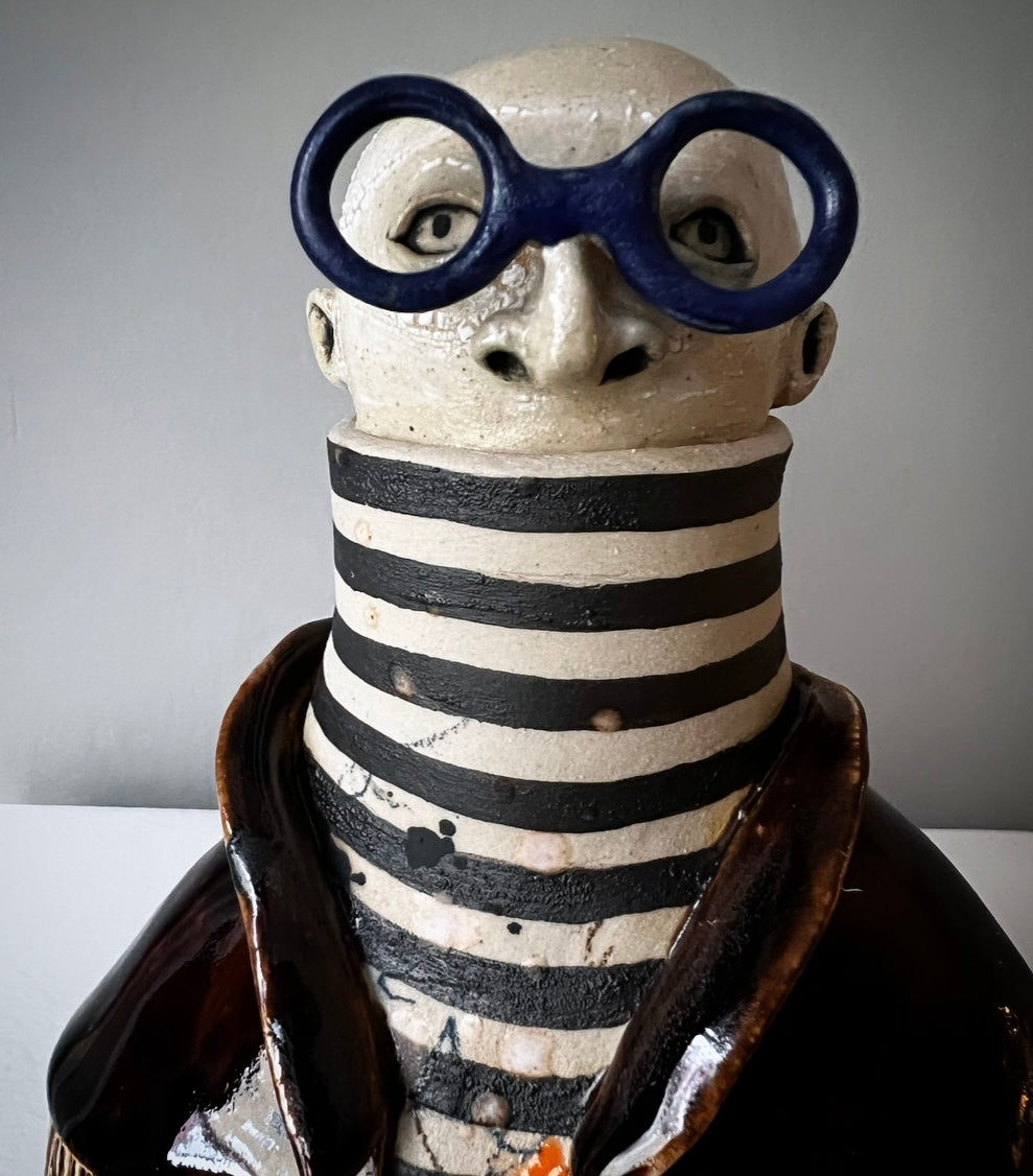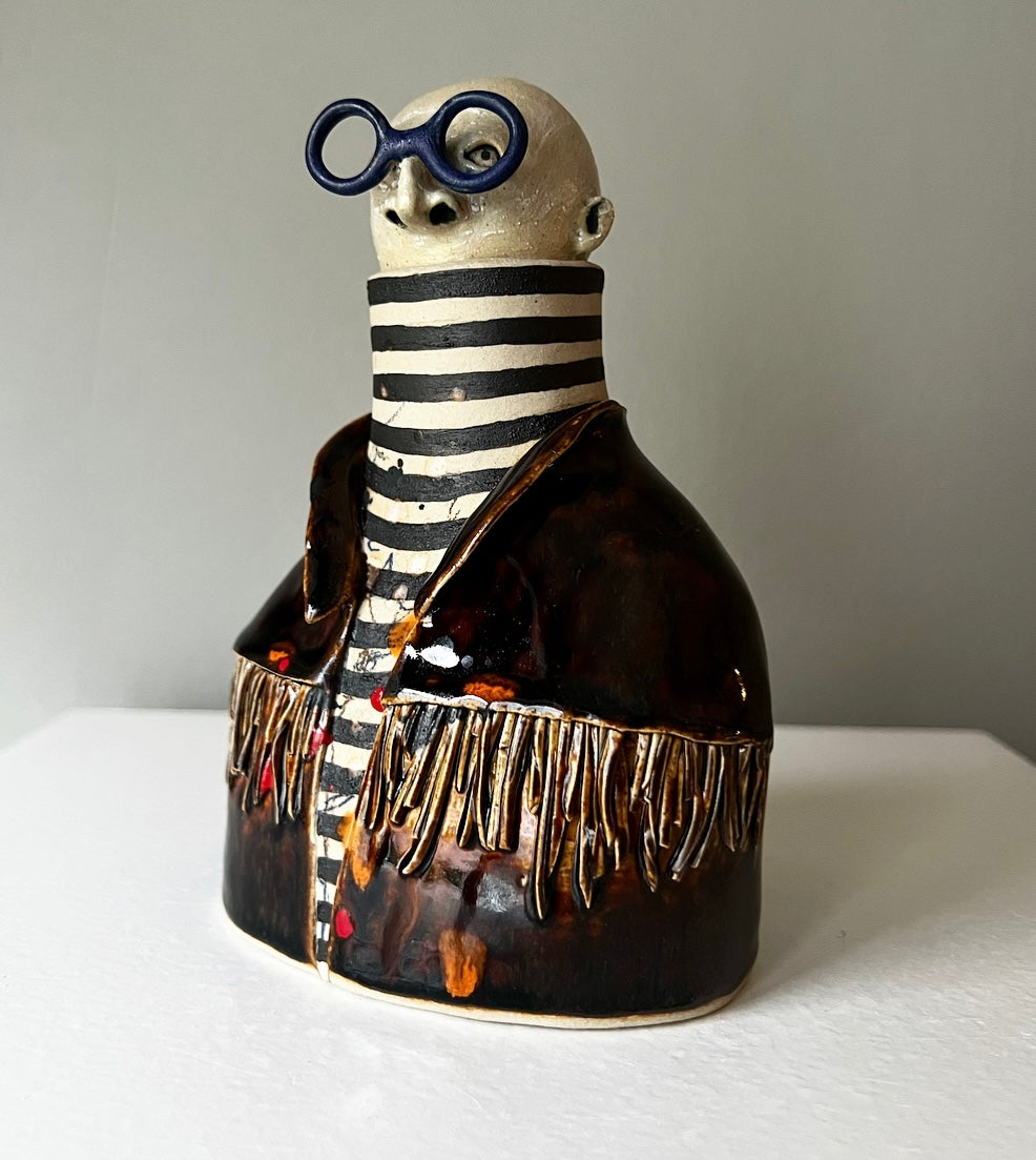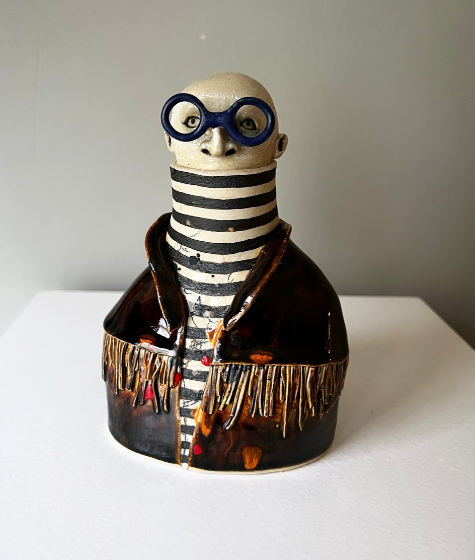 Anatoly har en blank mörkbrun fransjacka med färgstänk överallt, under jackan har han en klassisk randig polo & bågarna är runda & kungsblå!