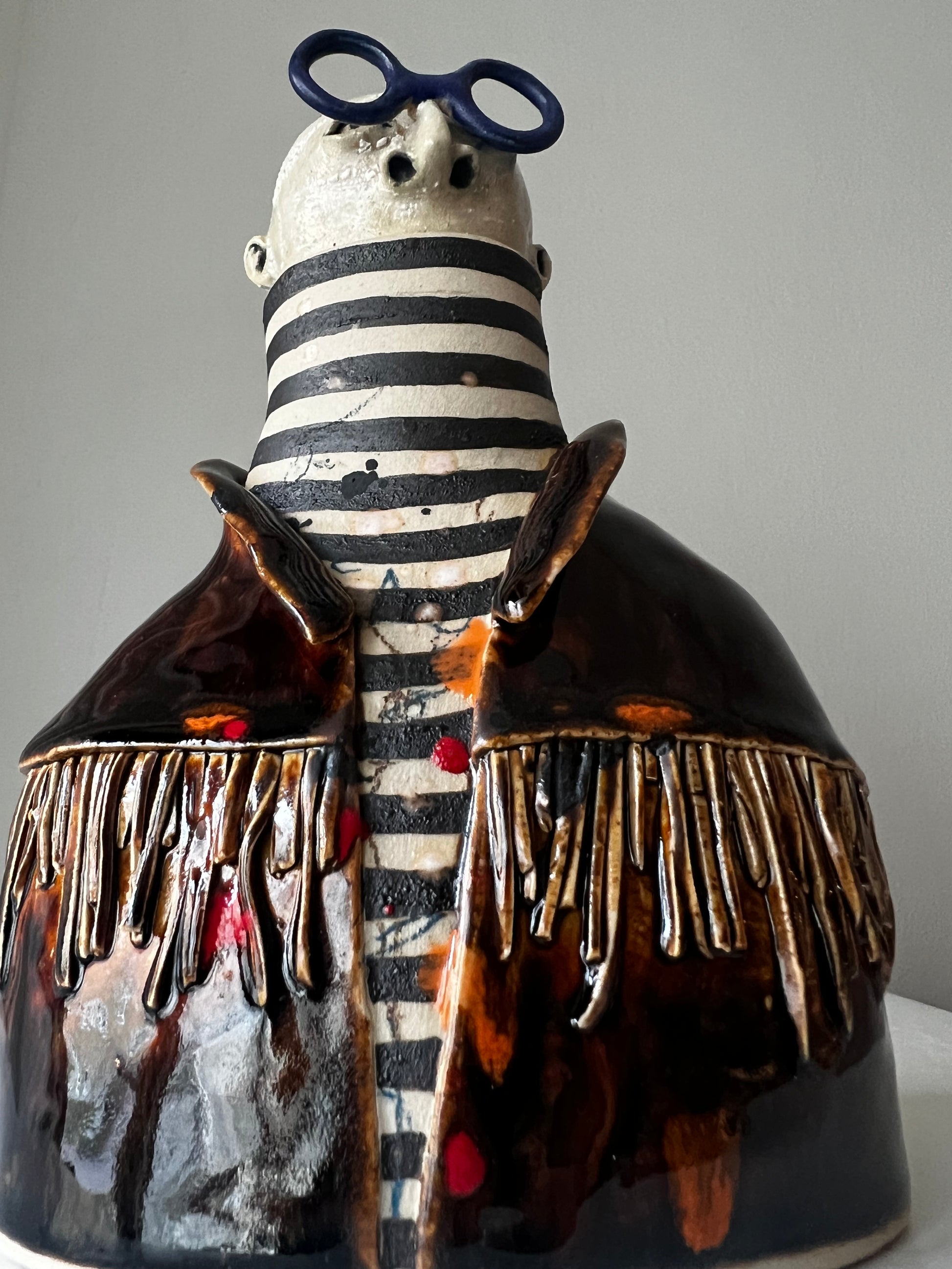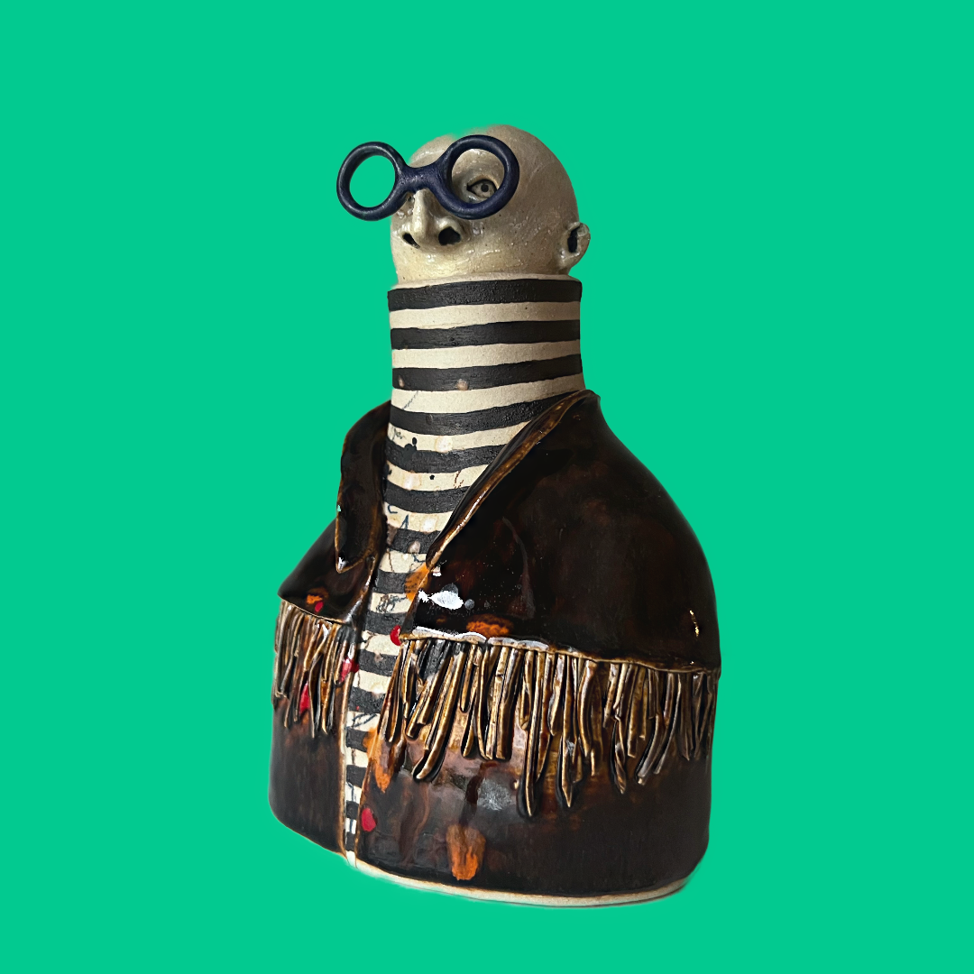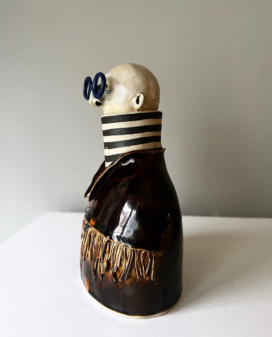 Anatoly har en blank mörkbrun fransjacka med färgstänk överallt, under jackan har han en klassisk randig polo & bågarna är runda & kungsblå!