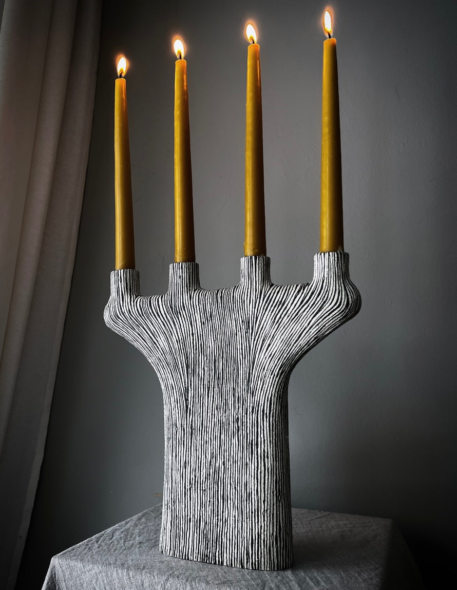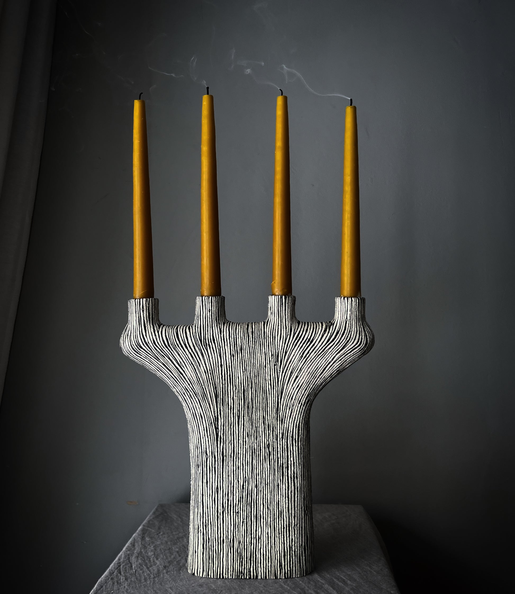 Ljusstake i grov vit stengodslera med handmålade tunna linjer.