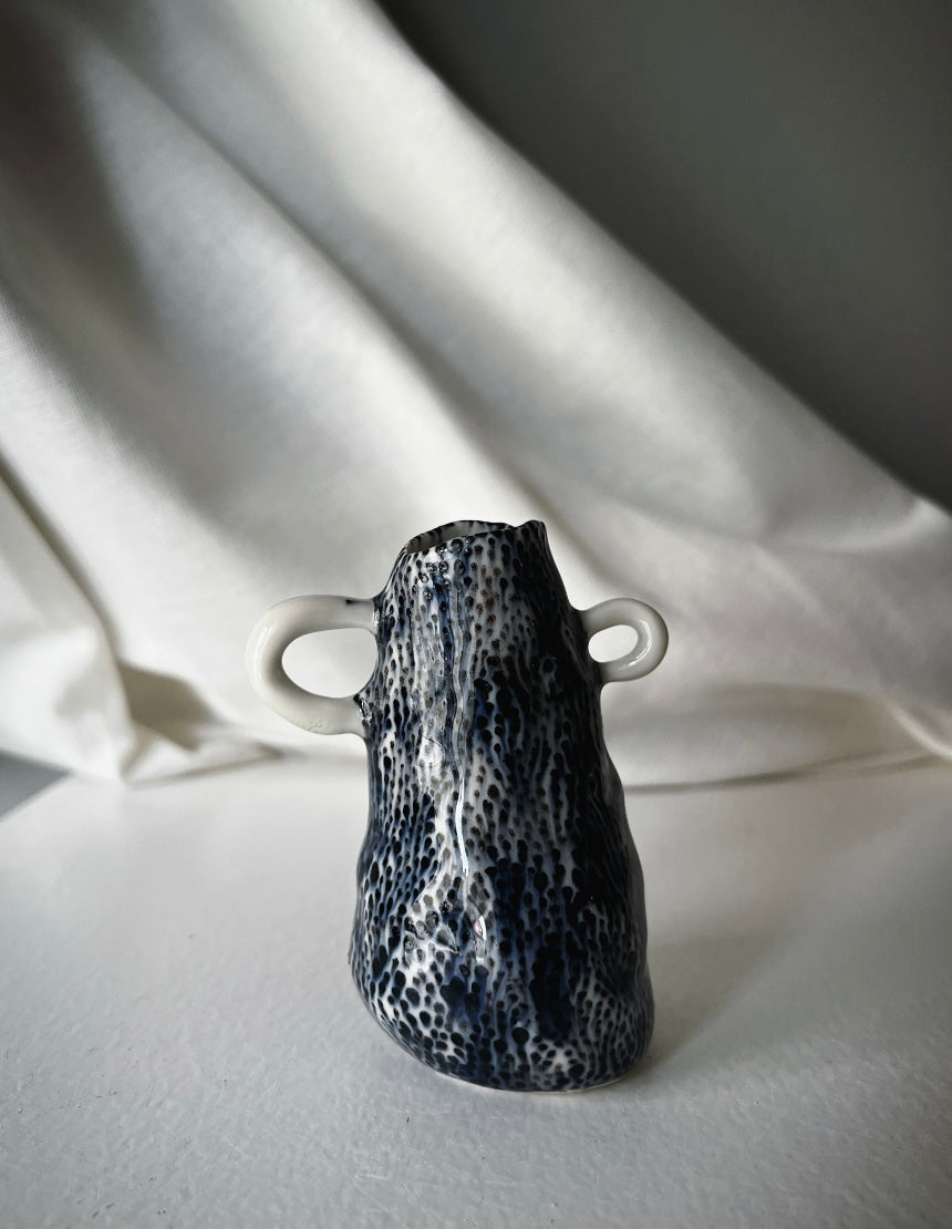 Vas i porslin, handmålade prickar, glaserad insida, ca 10 cm