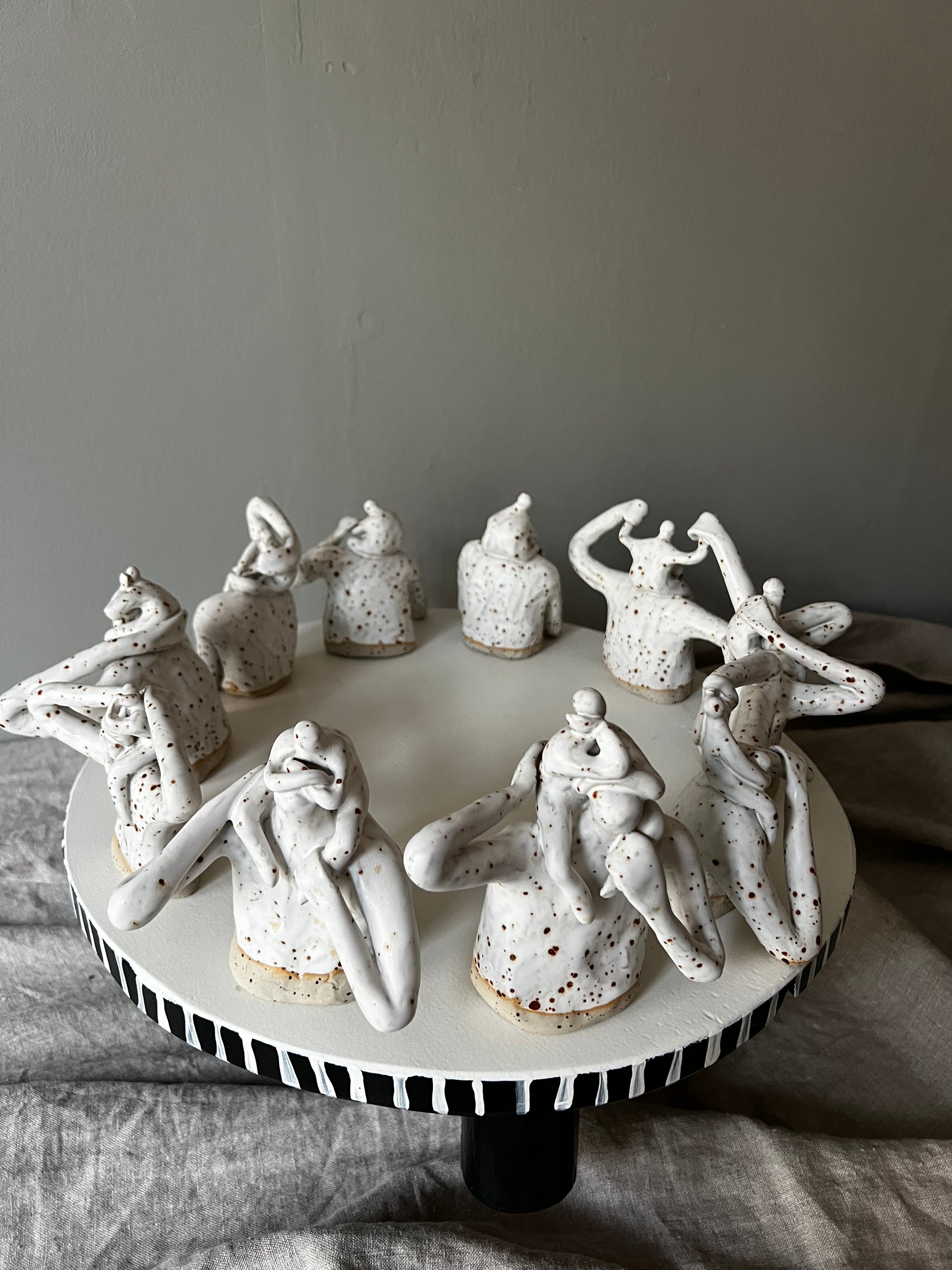 Papporna är skulpturer i stengods, med vit matt glasyr, numrerade. Ca 10-13 cm höga.