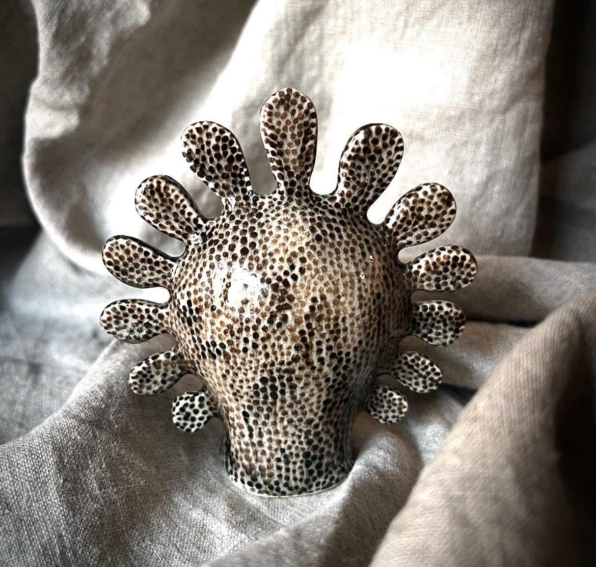Skulptur i stengods med handmålade prickar & blank glasyr
