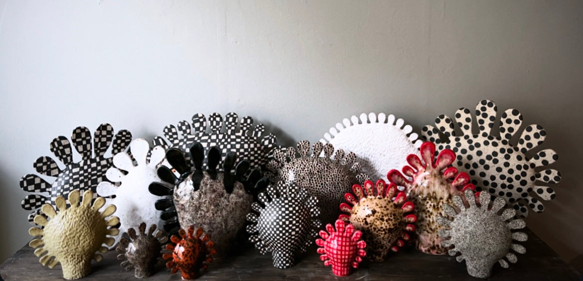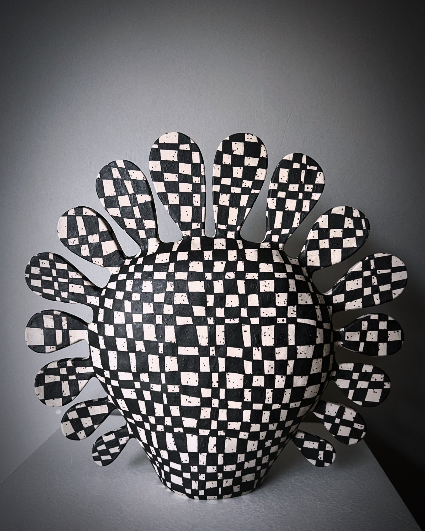 Skulptur i stengods med handmålad dekor. Andrasorterad pga ett limmat blad.